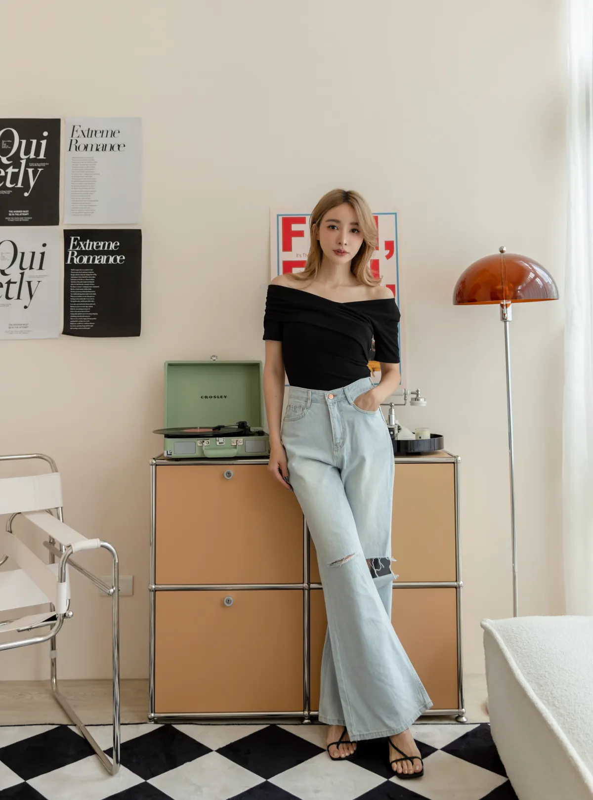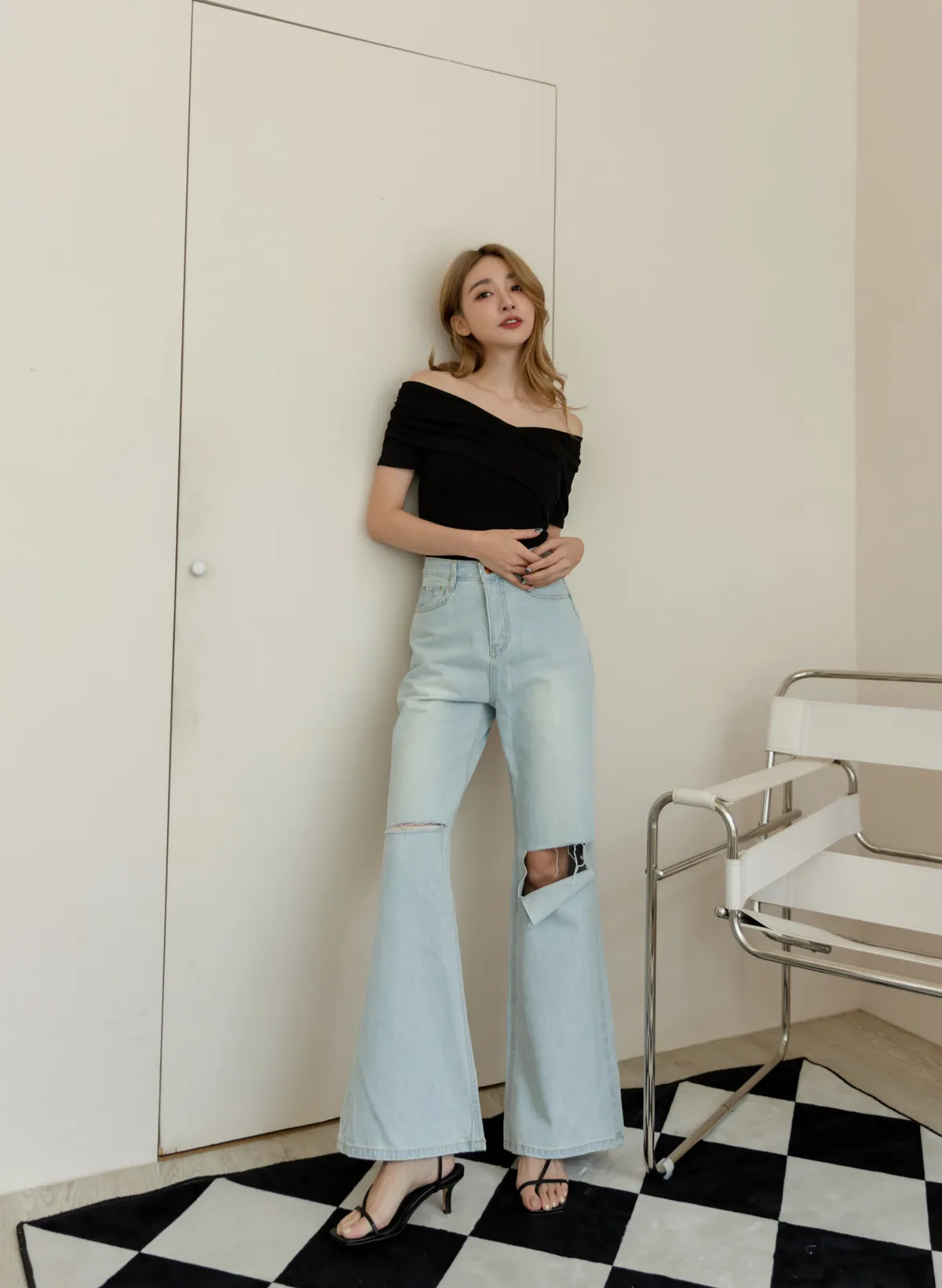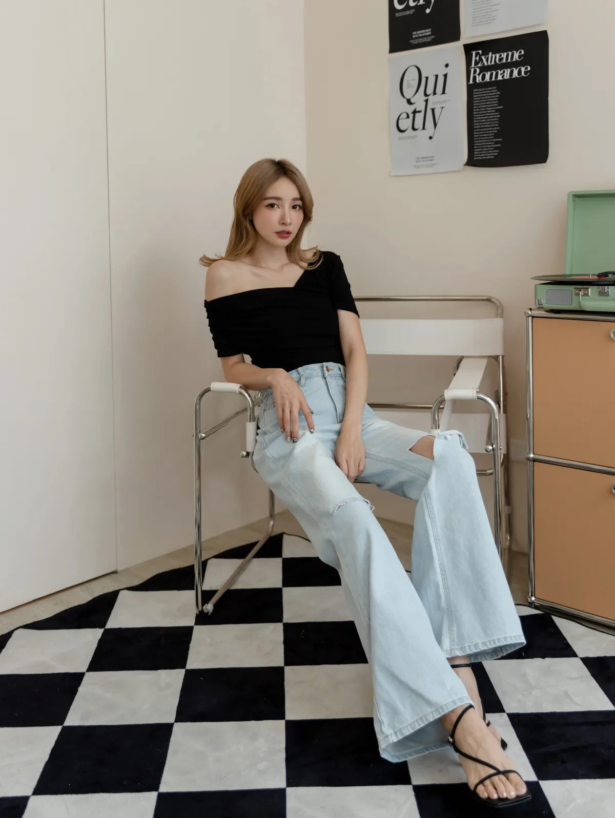 設計感破洞顯瘦高腰寬鬆喇叭闊腿褲