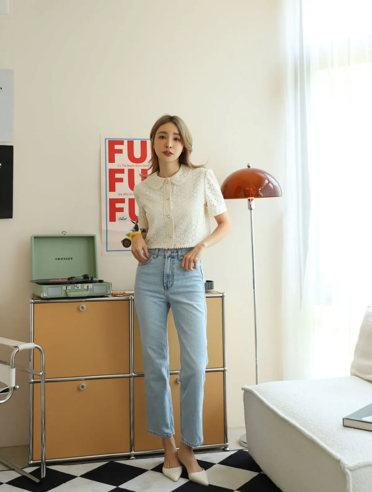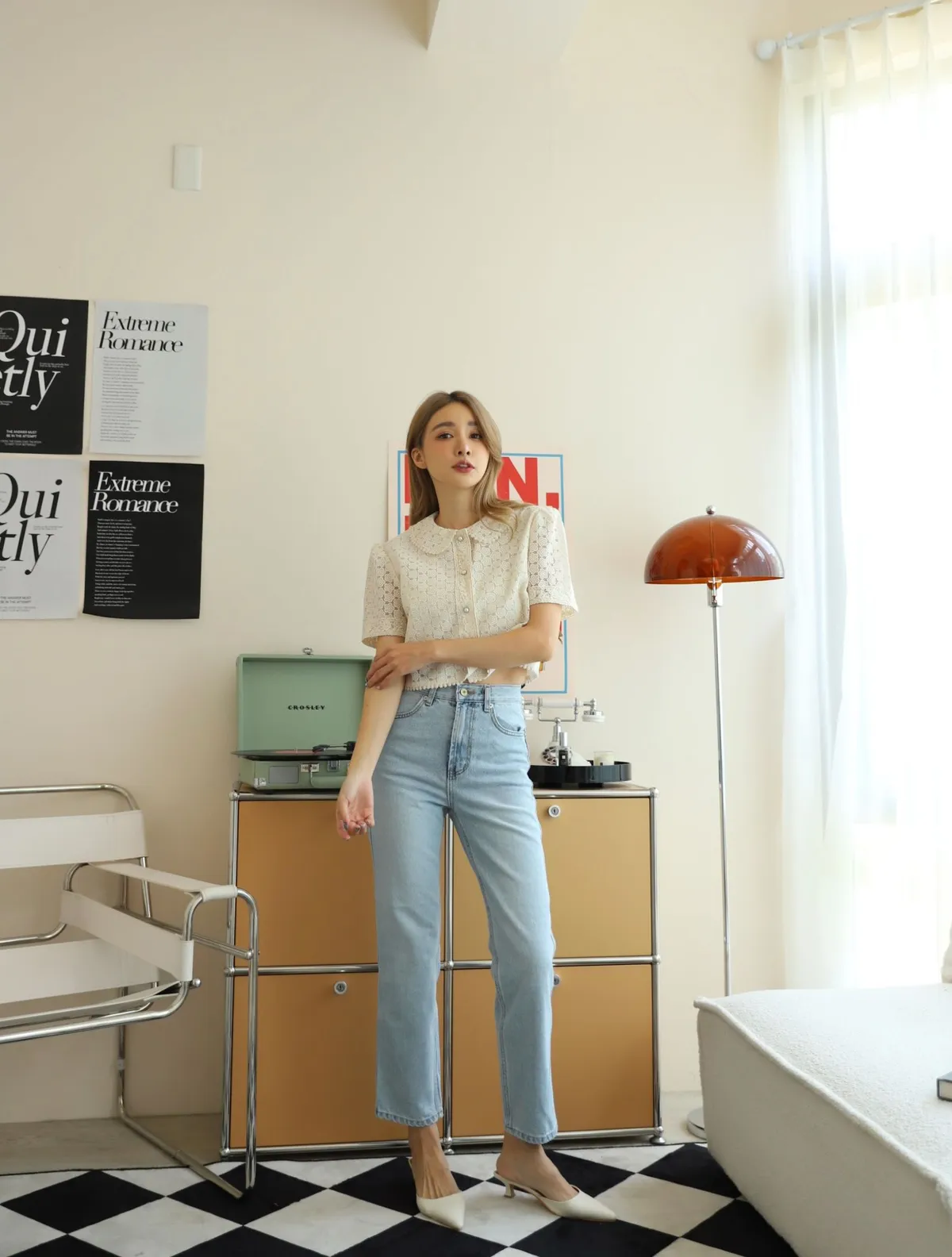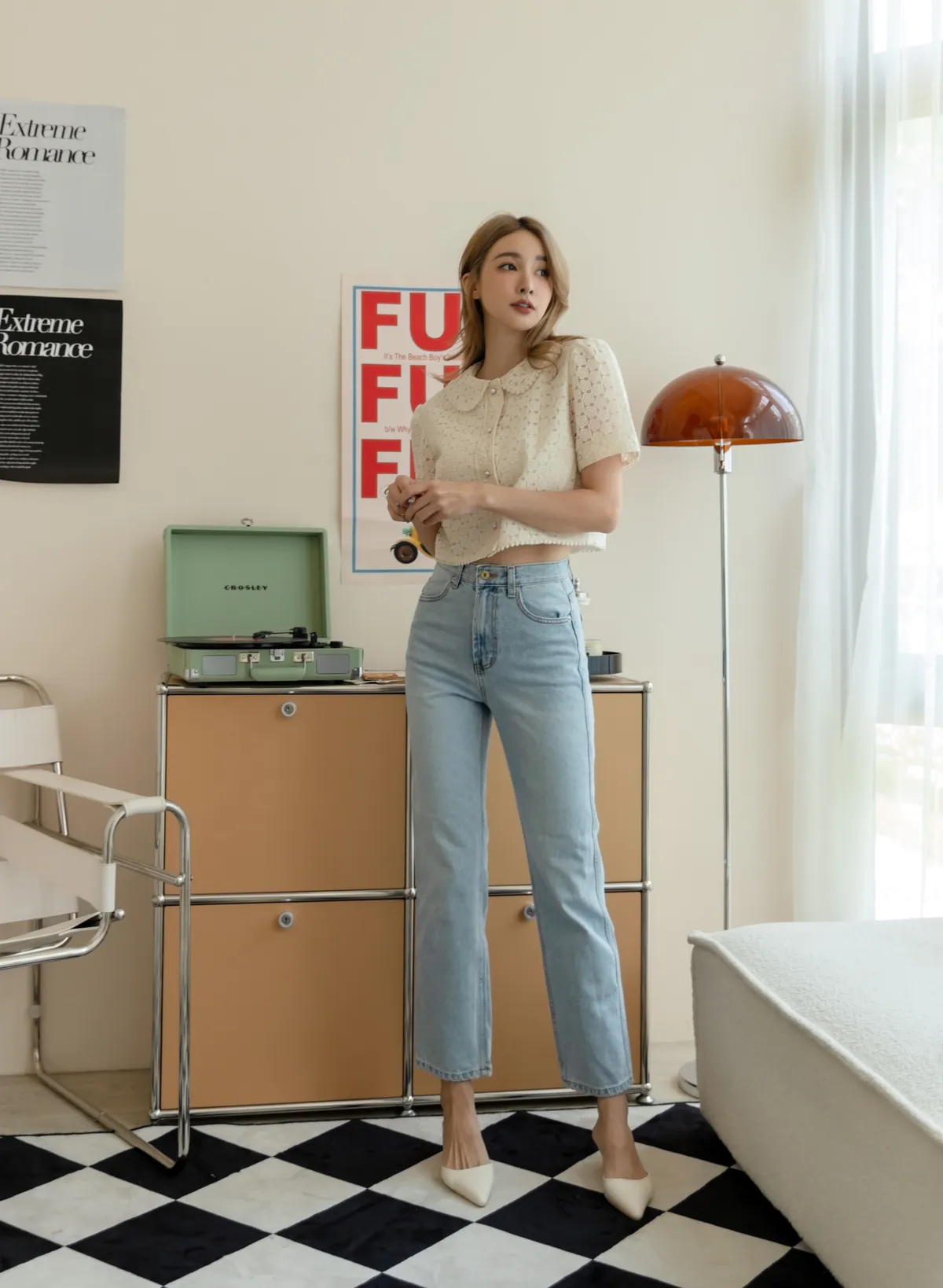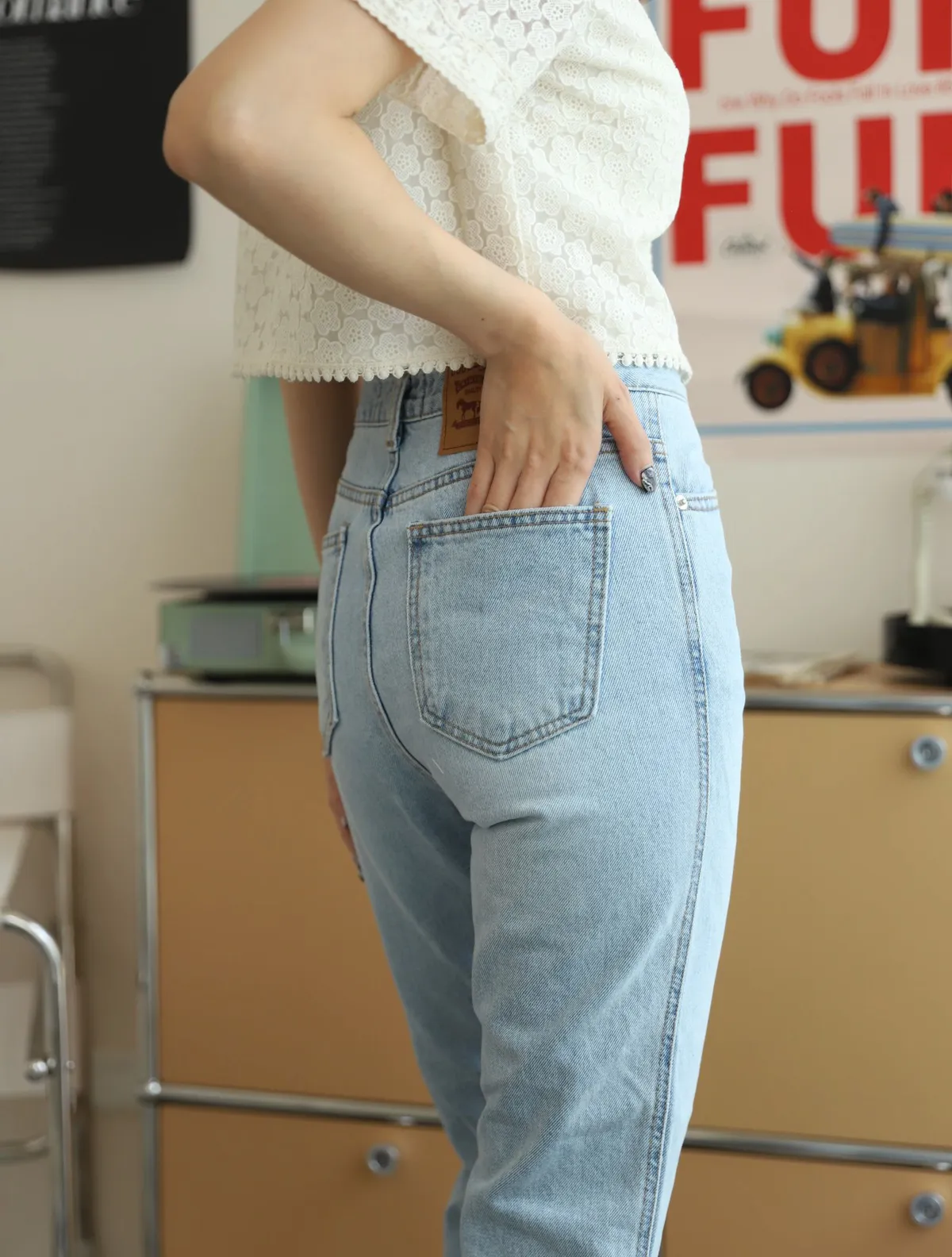 高端設計師 修身顯瘦復古水洗淺藍色直筒九分褲