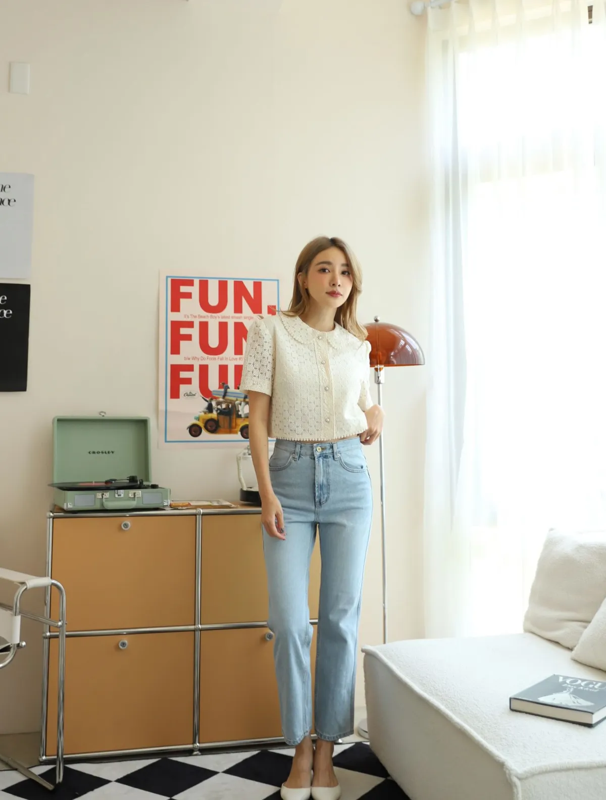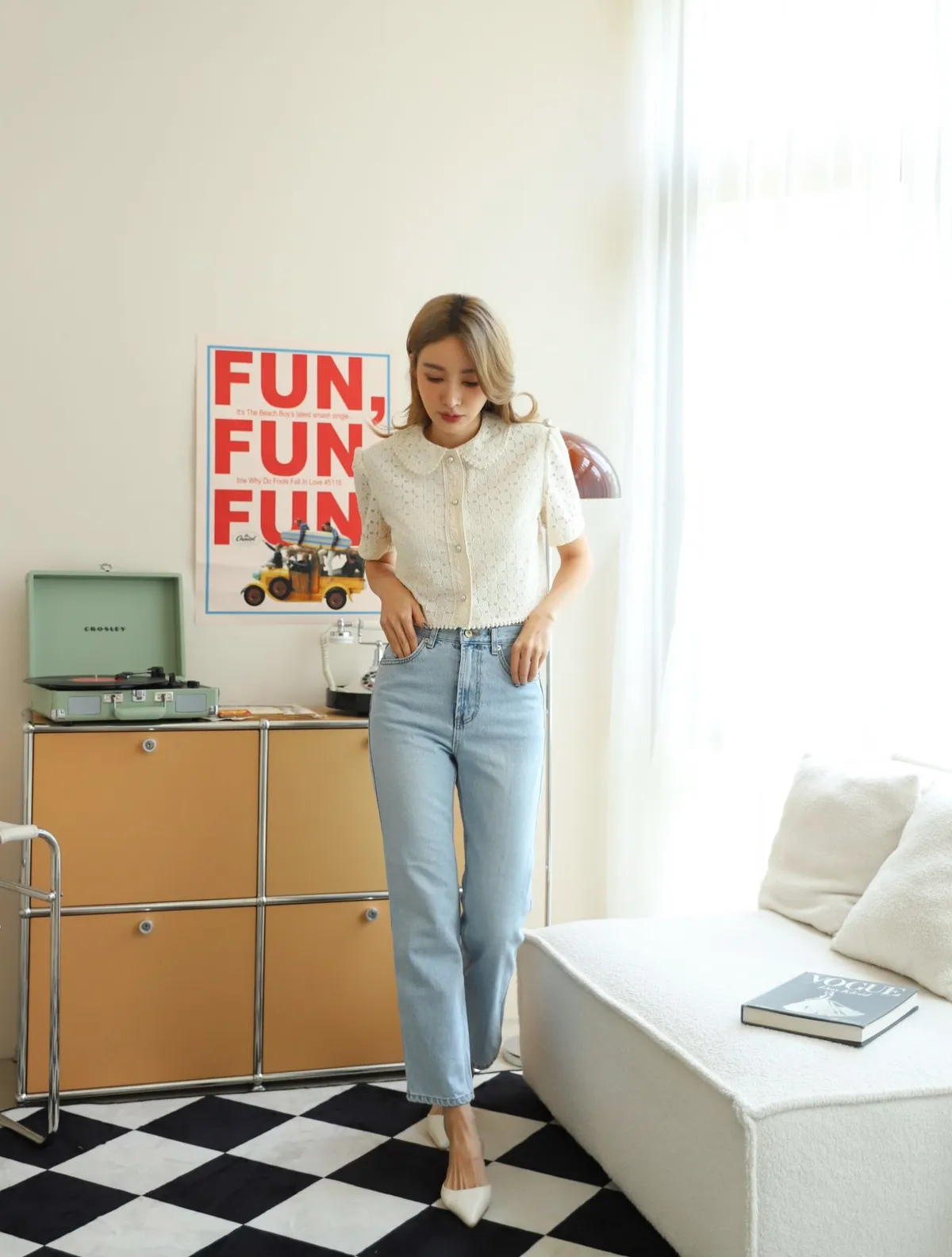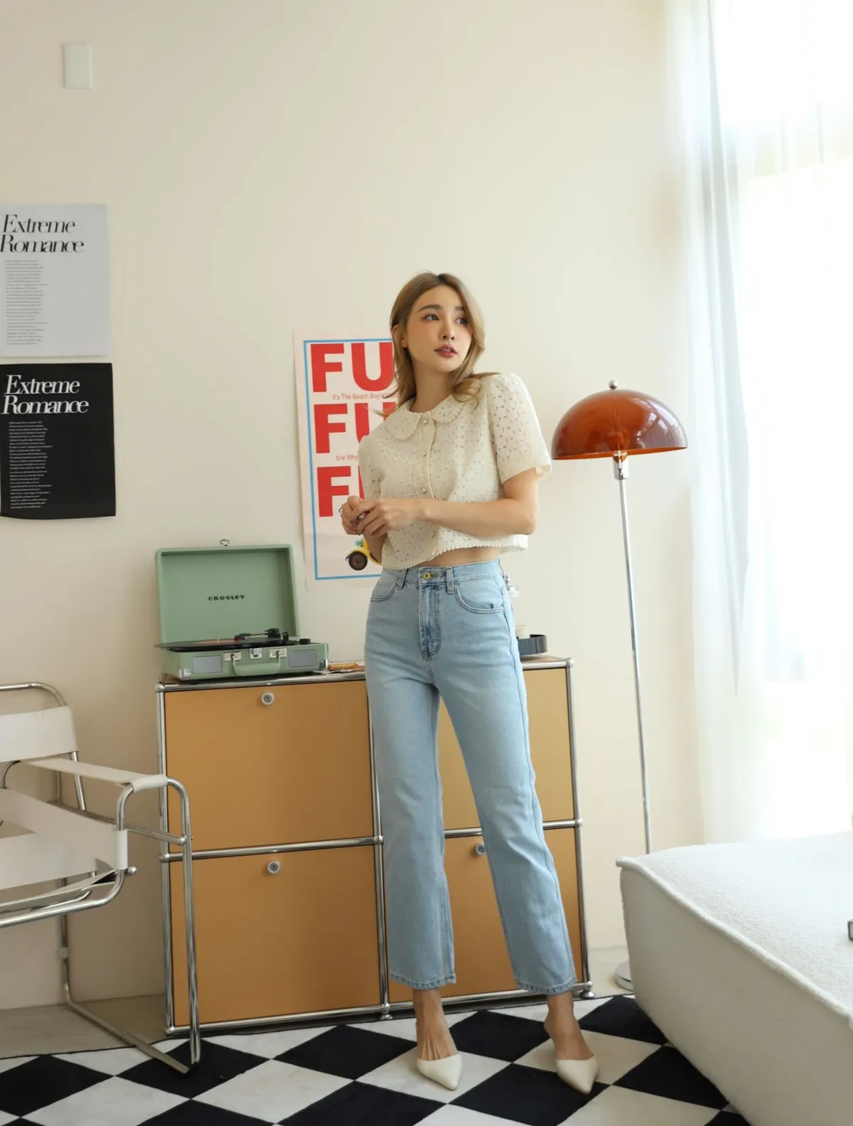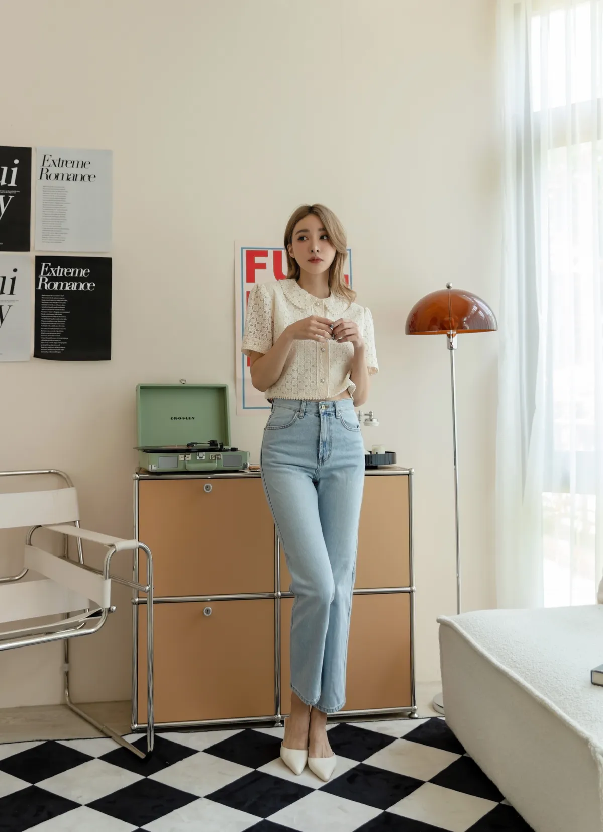 高端設計師 修身顯瘦復古水洗淺藍色直筒九分褲