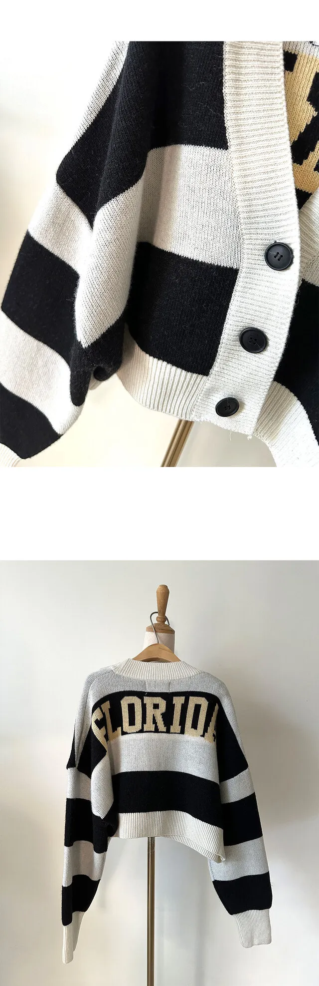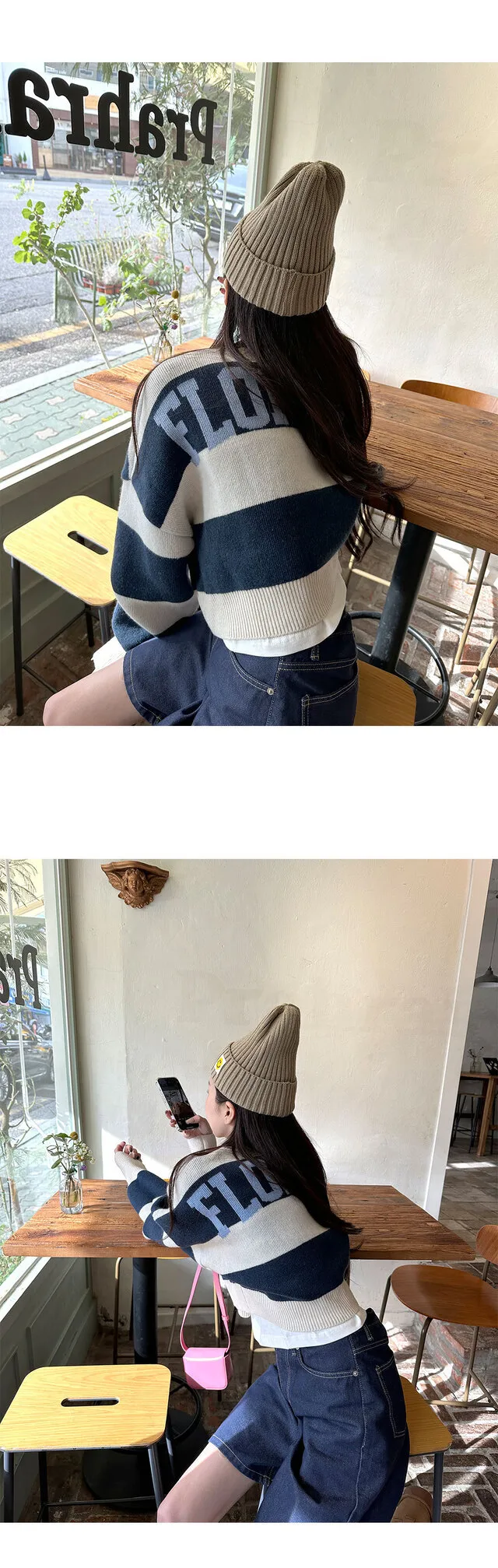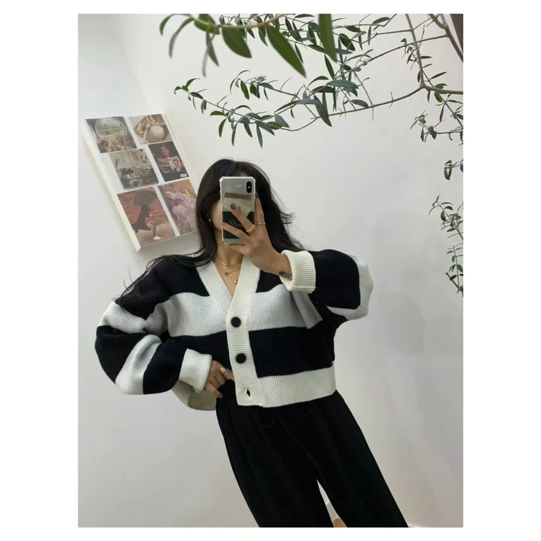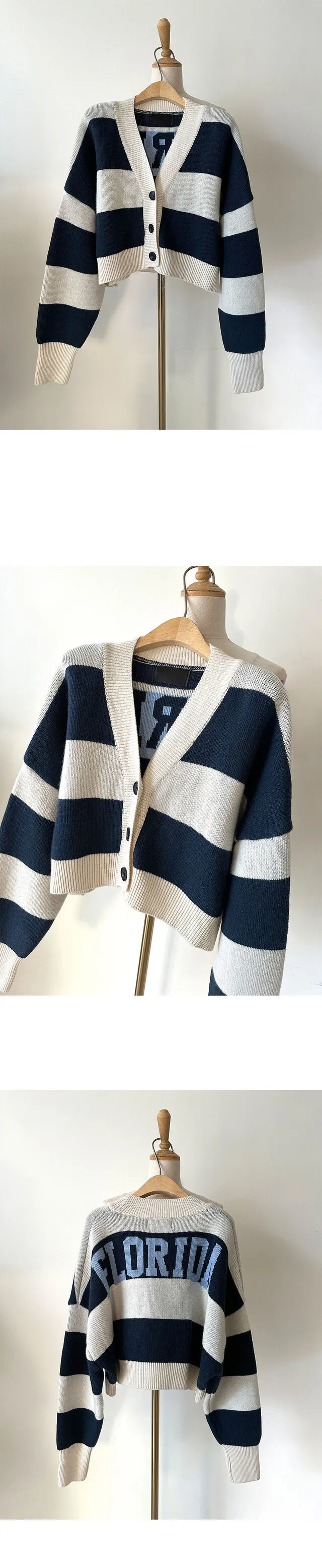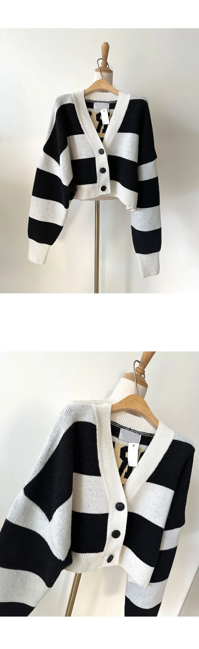 慵懶風條紋v領寬鬆短款羊毛開衫毛衣