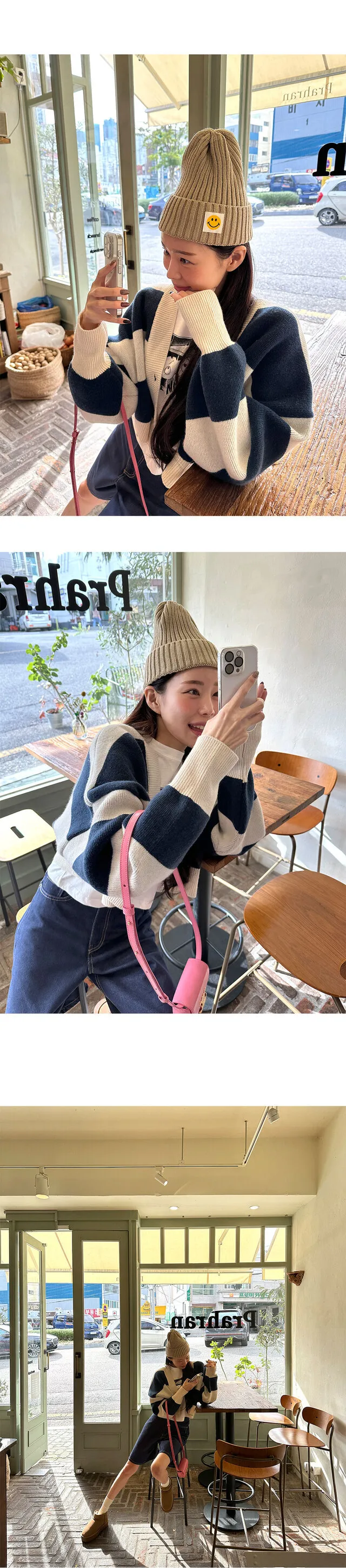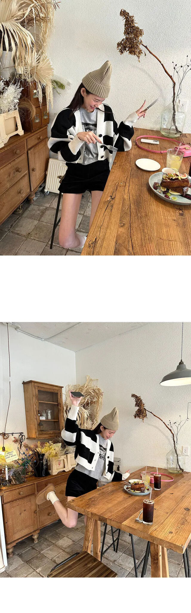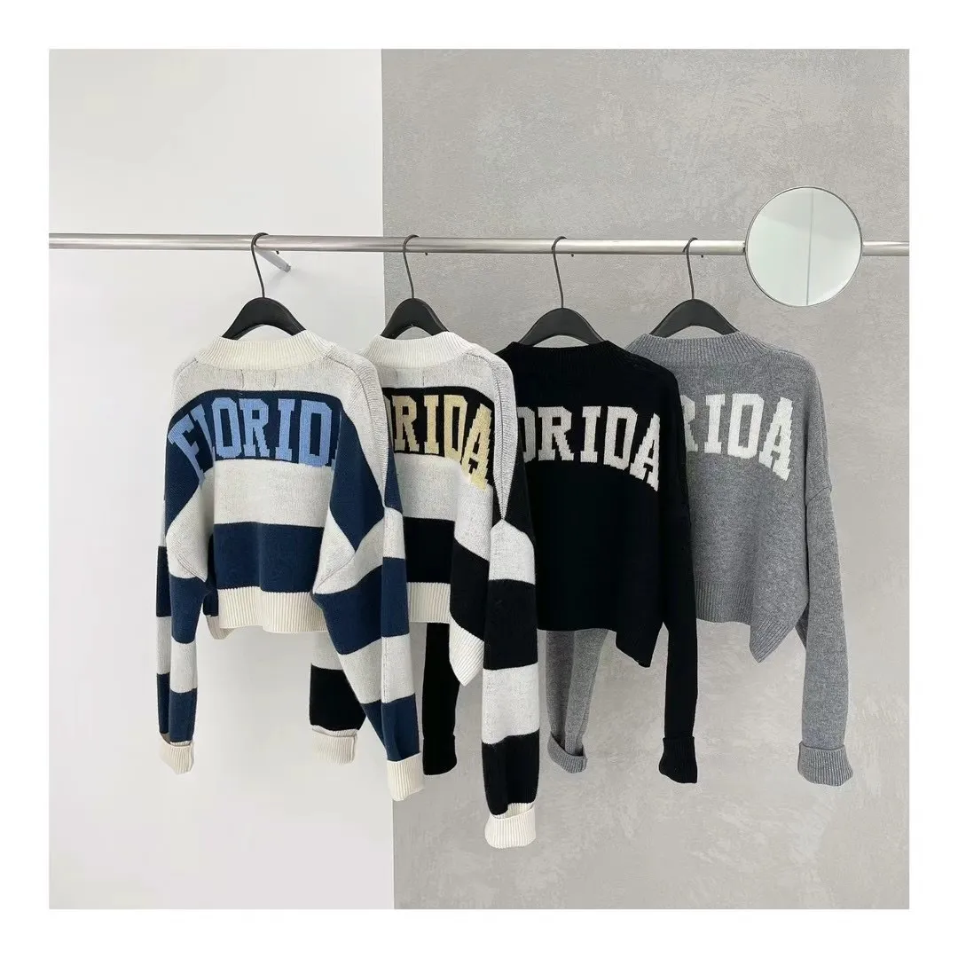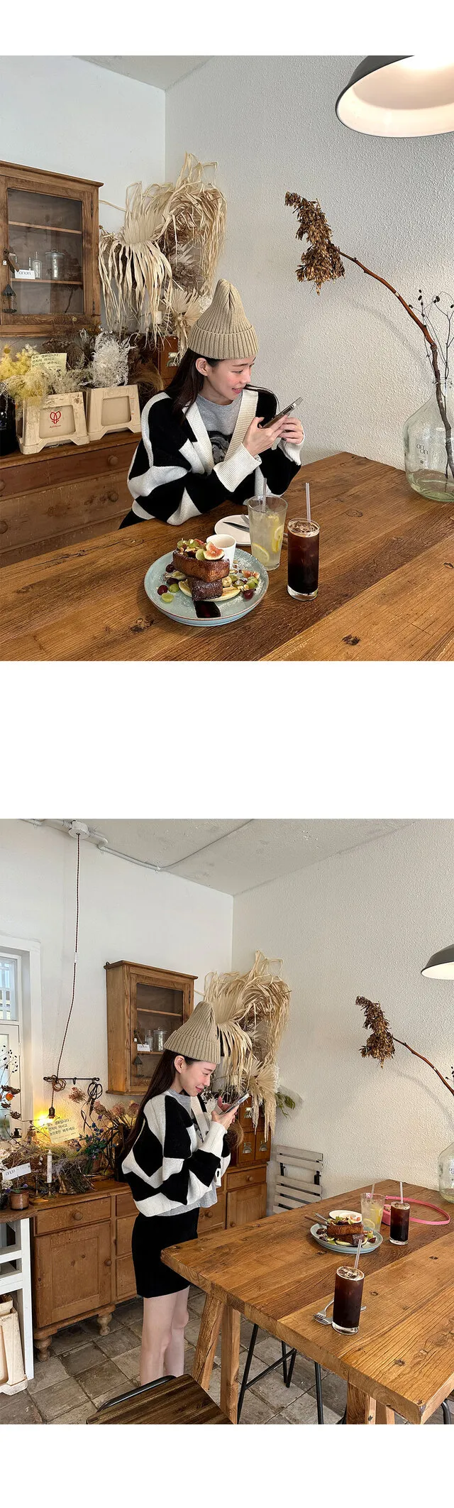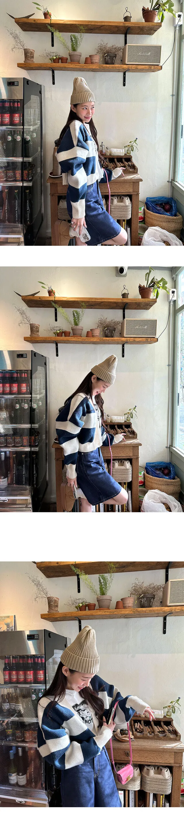 慵懶風條紋v領寬鬆短款羊毛開衫毛衣
