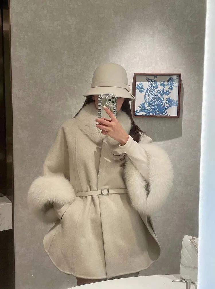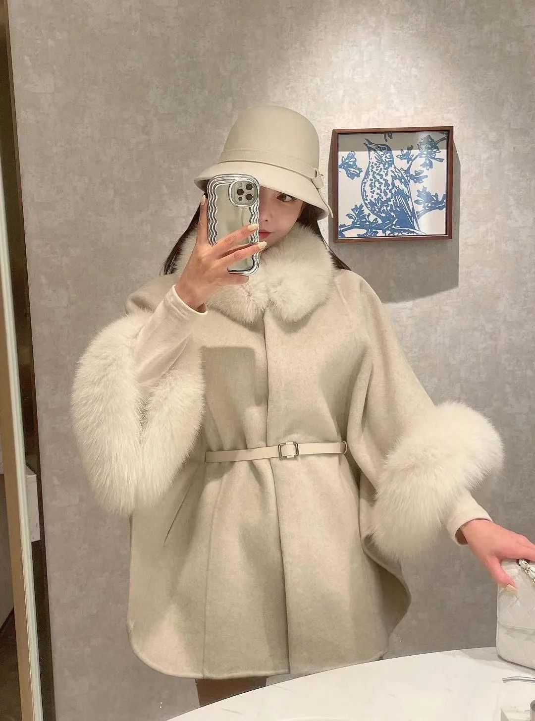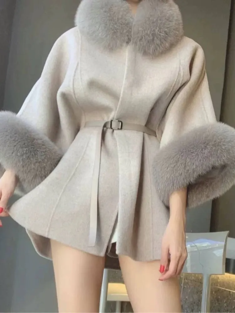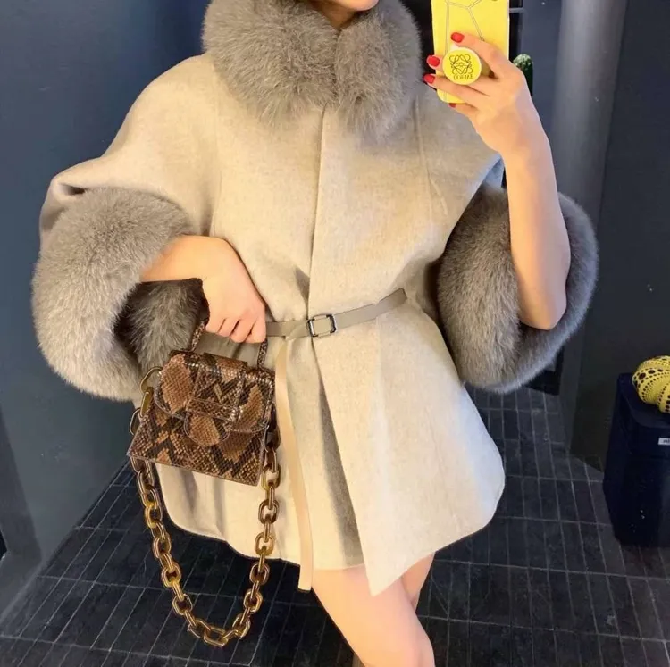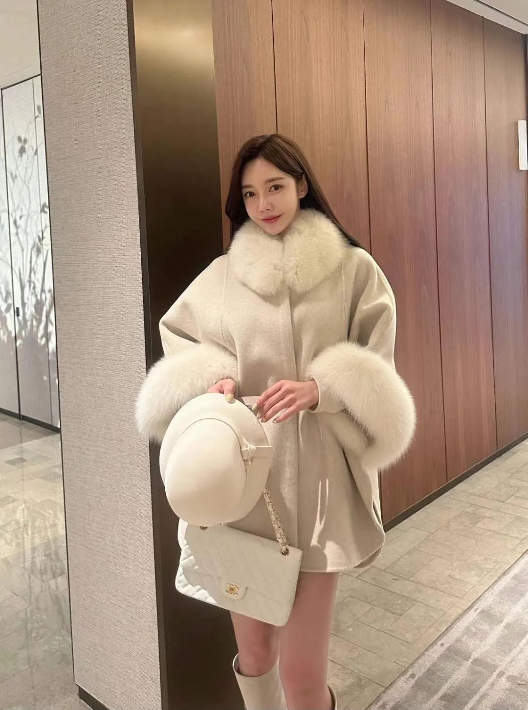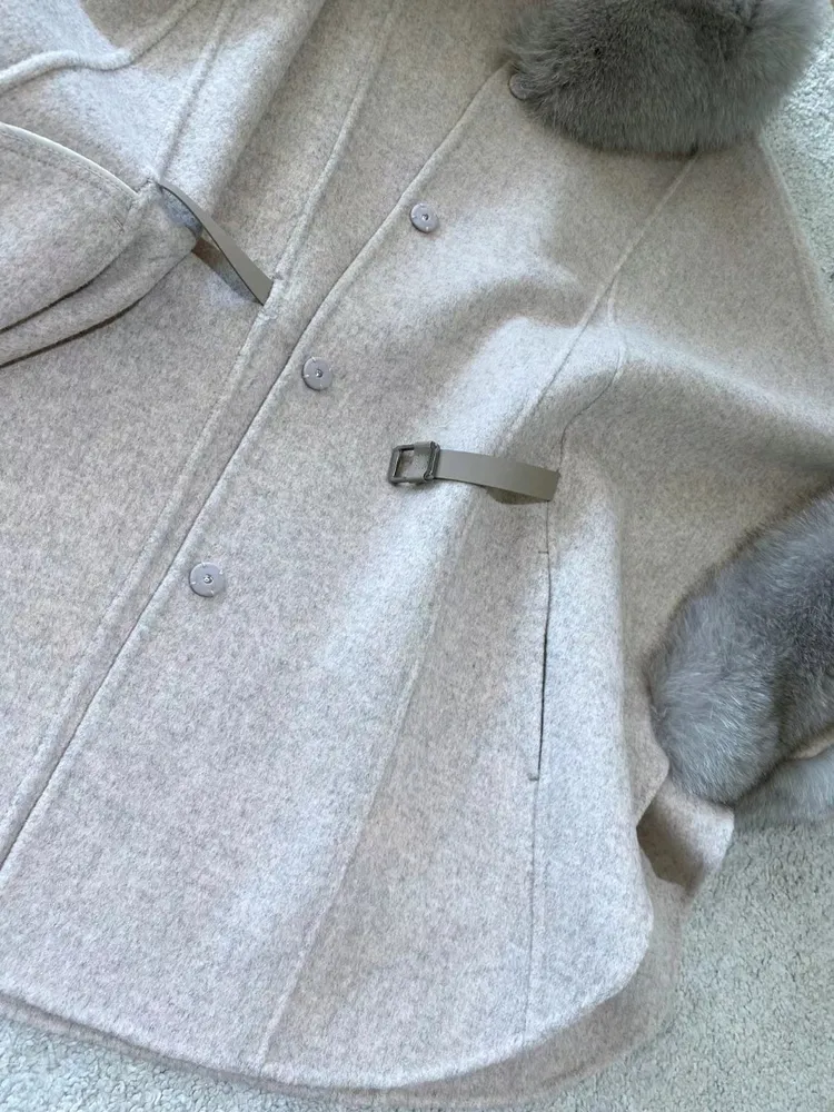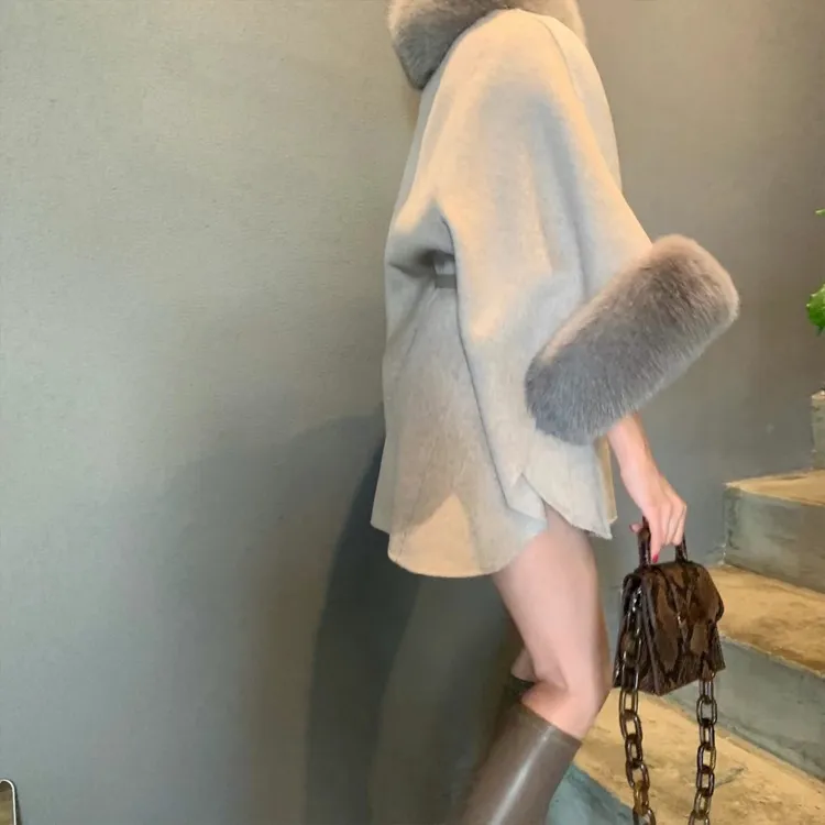 設計師品牌 名媛氣質真狐狸毛蝙蝠袖斗篷羊毛大衣外套