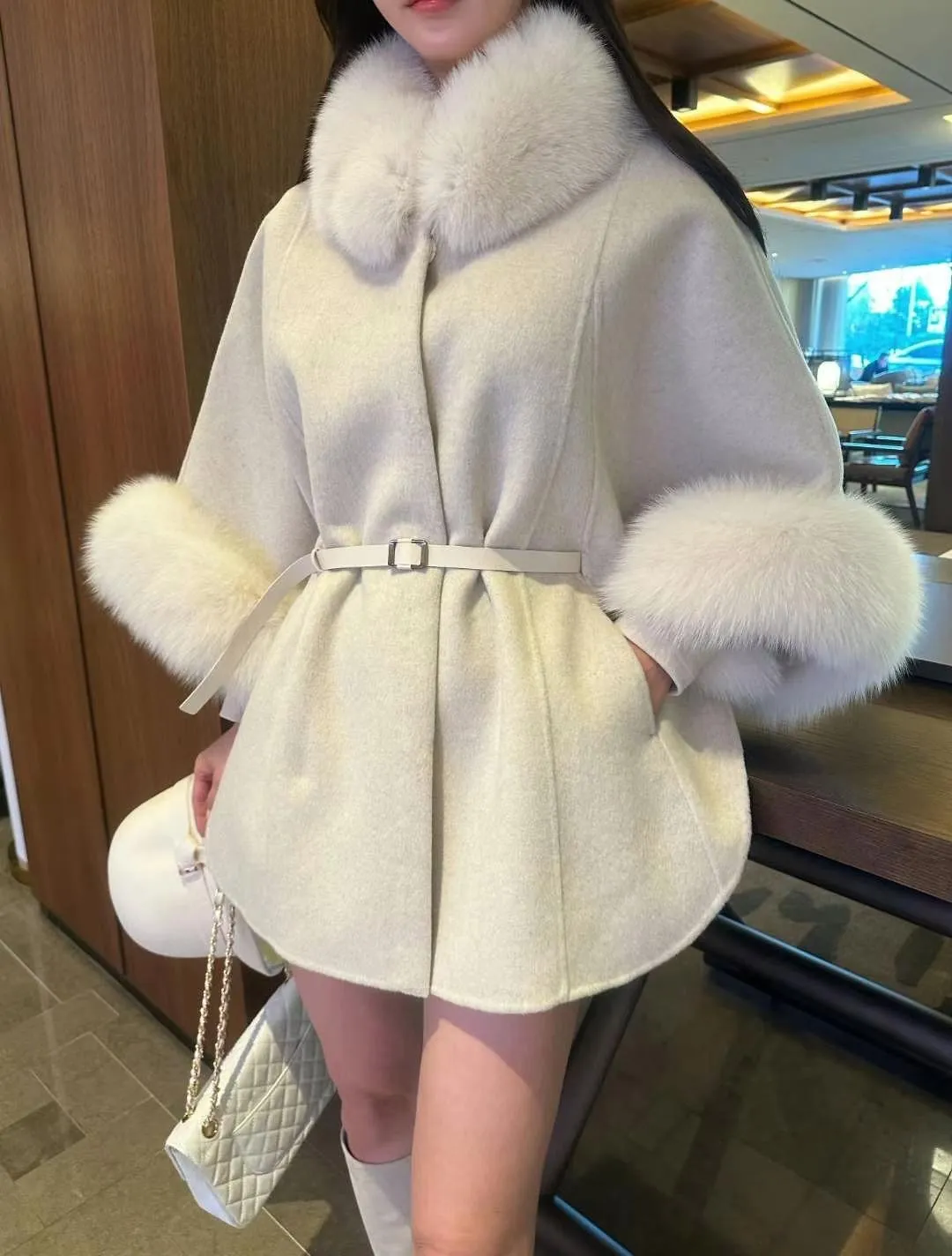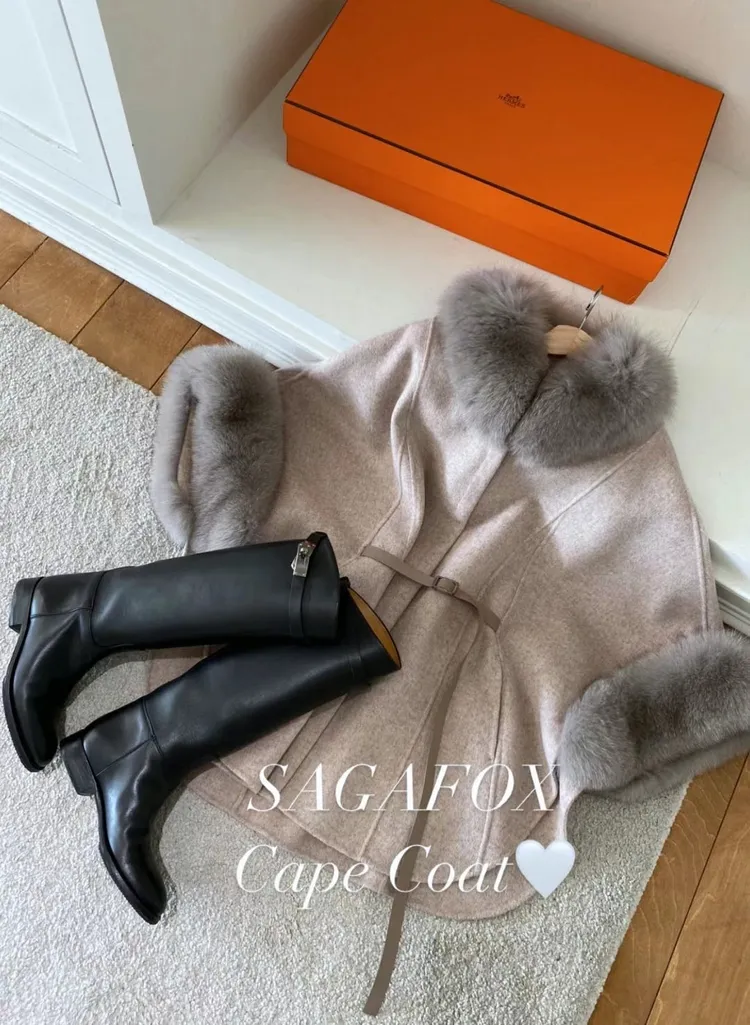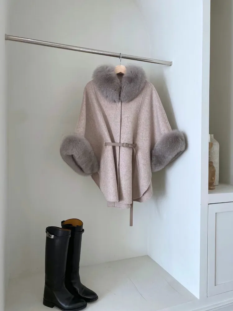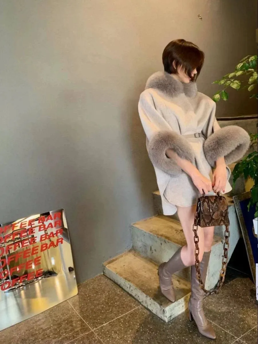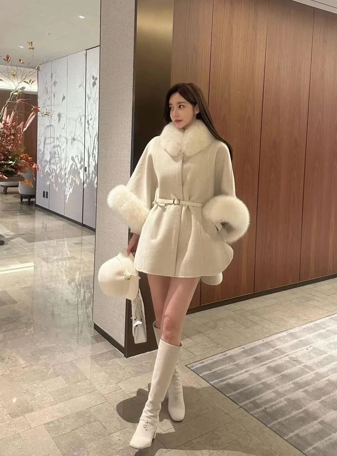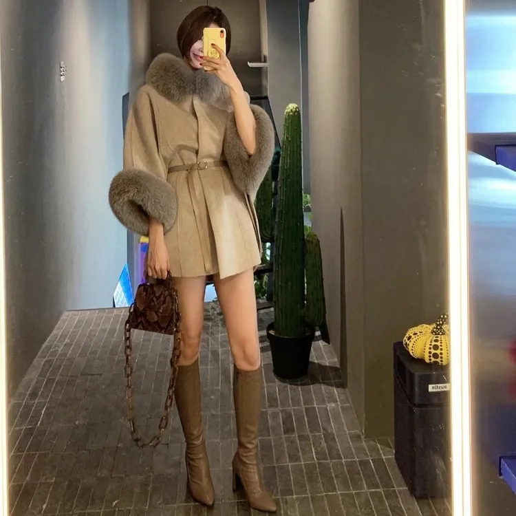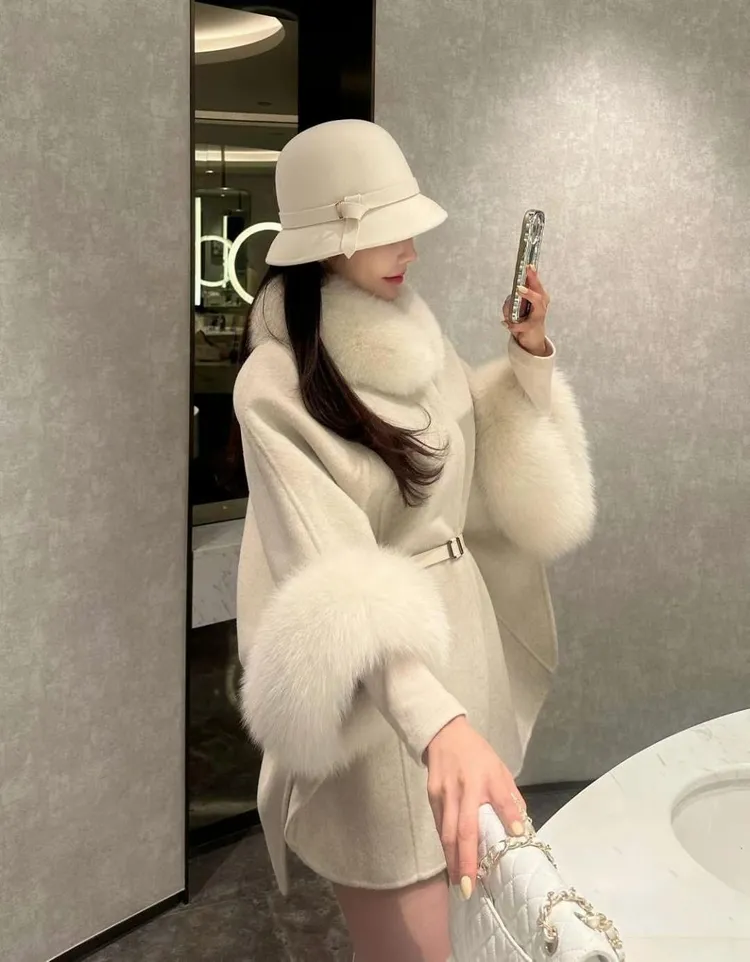 設計師品牌 名媛氣質真狐狸毛蝙蝠袖斗篷羊毛大衣外套