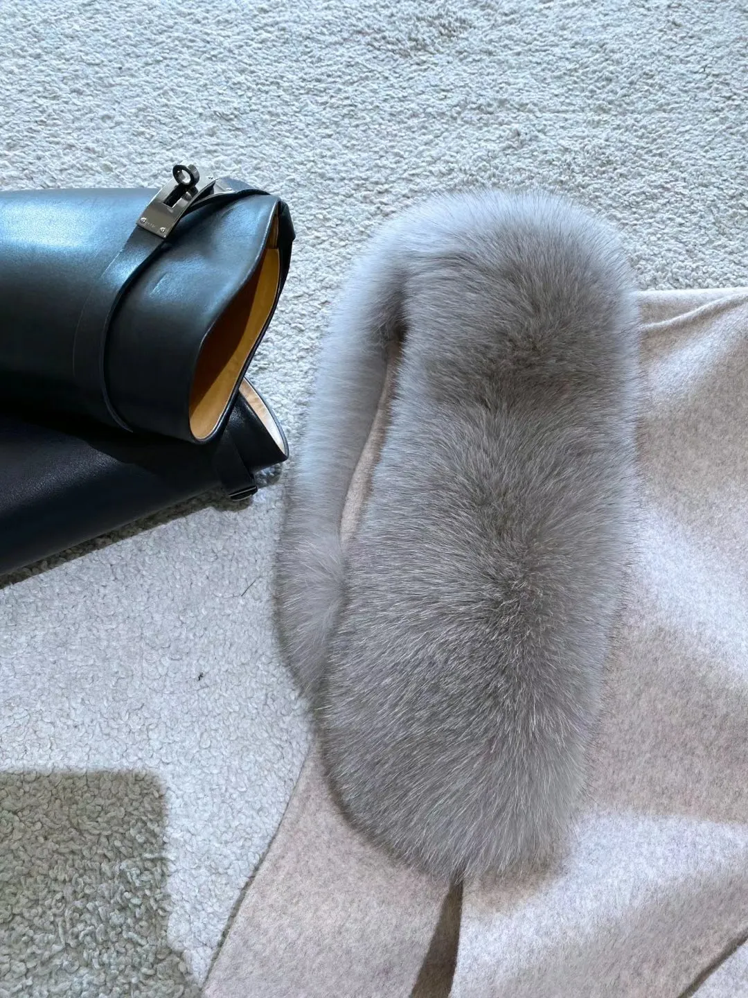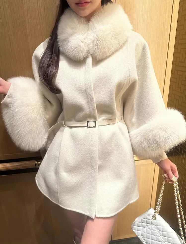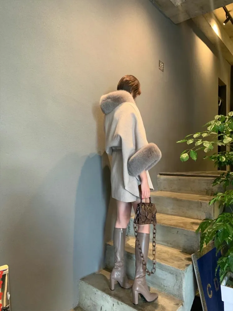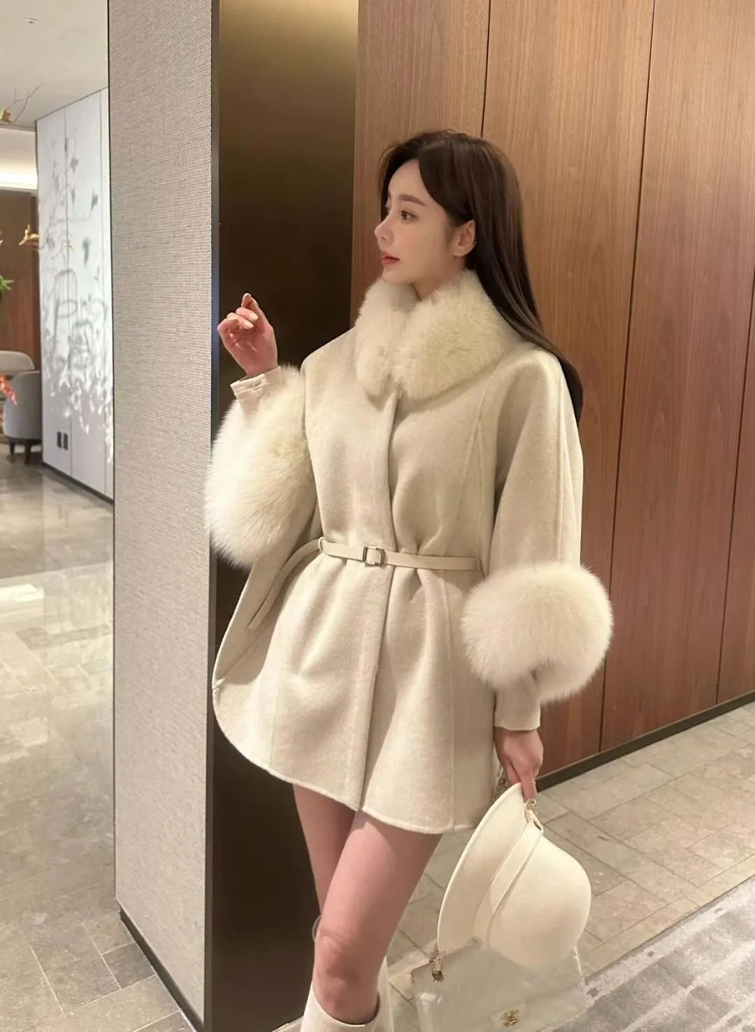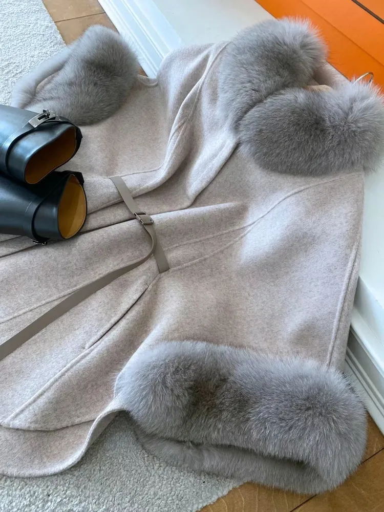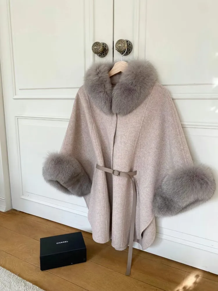 設計師品牌 名媛氣質真狐狸毛蝙蝠袖斗篷羊毛大衣外套