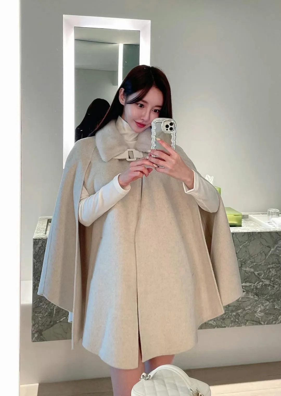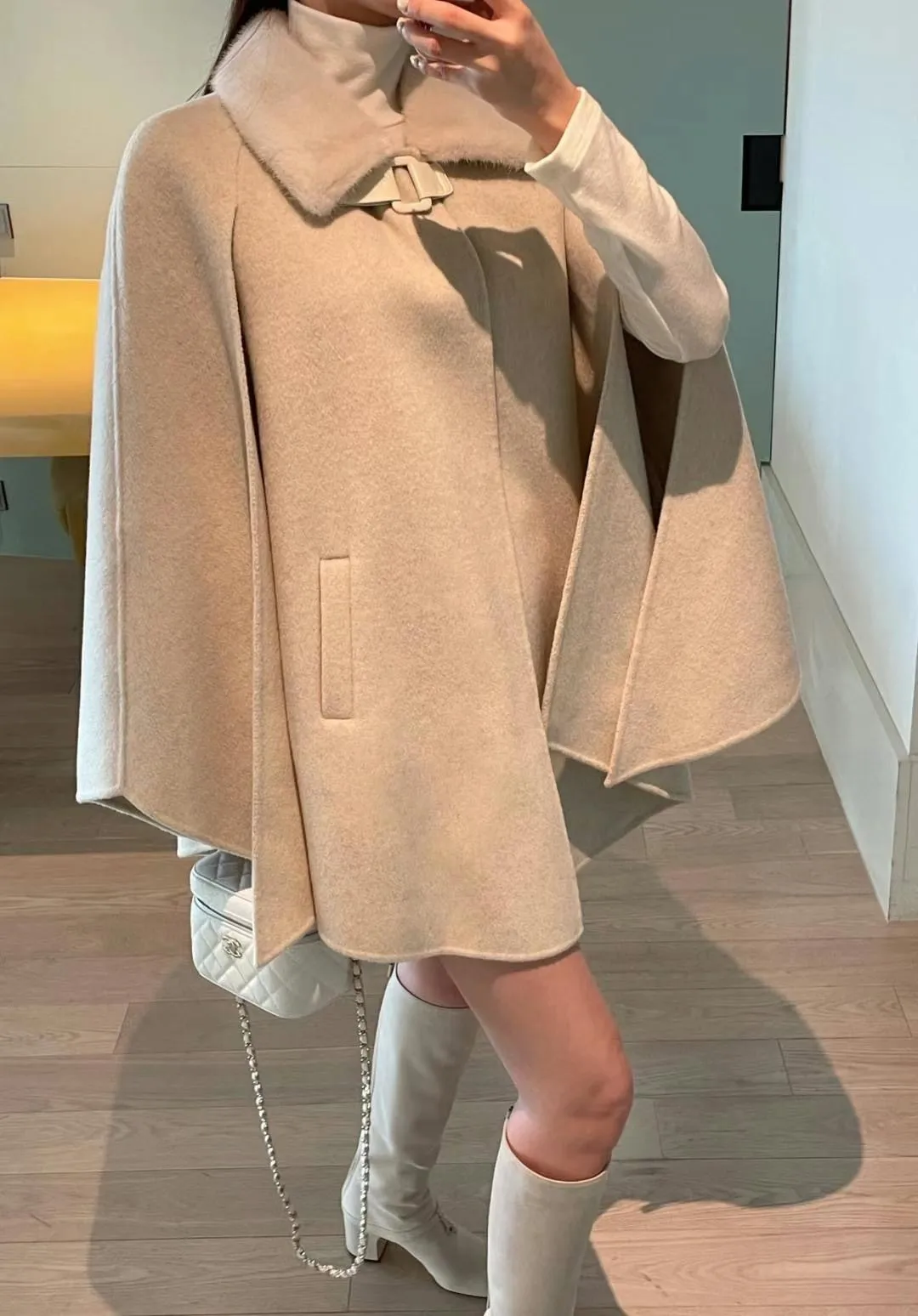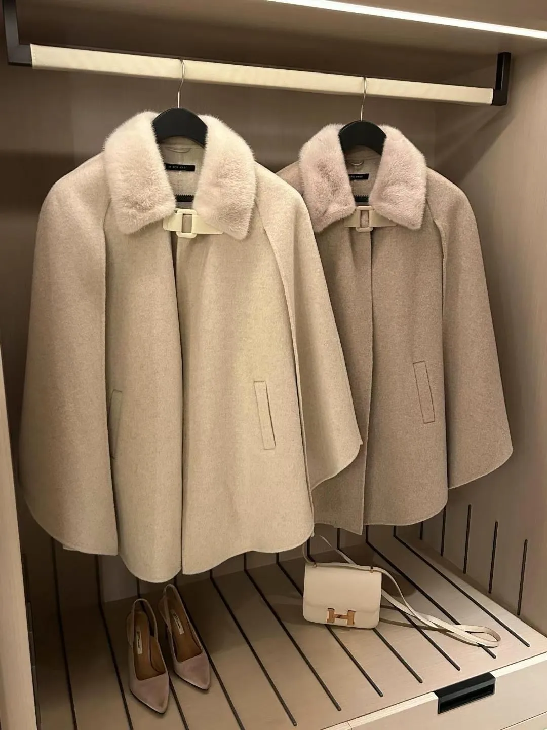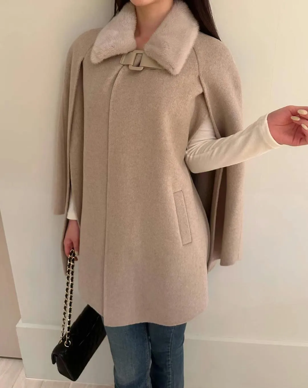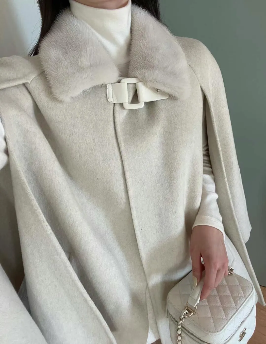 設計師品牌 氣質名媛高級手工製作handmade水貂毛領羊毛斗篷大衣外套
