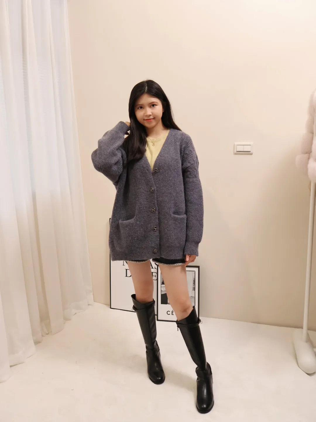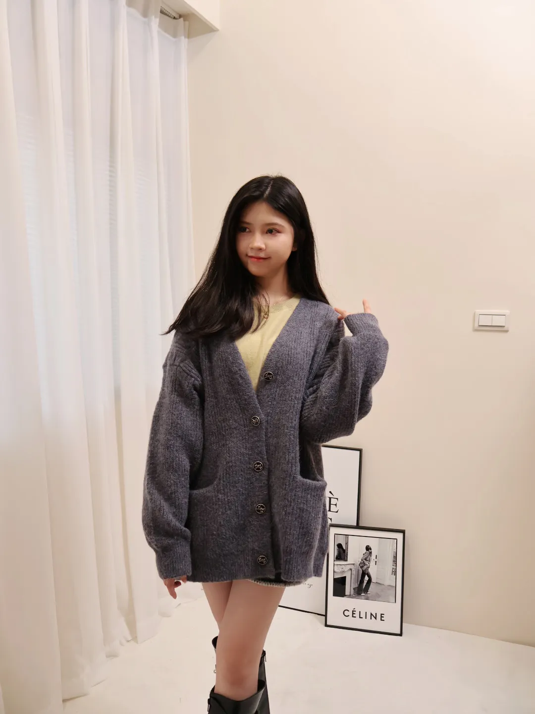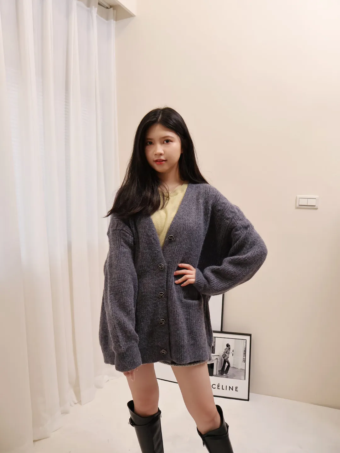 高品質V領羊毛寬鬆排釦針織開衫外套
