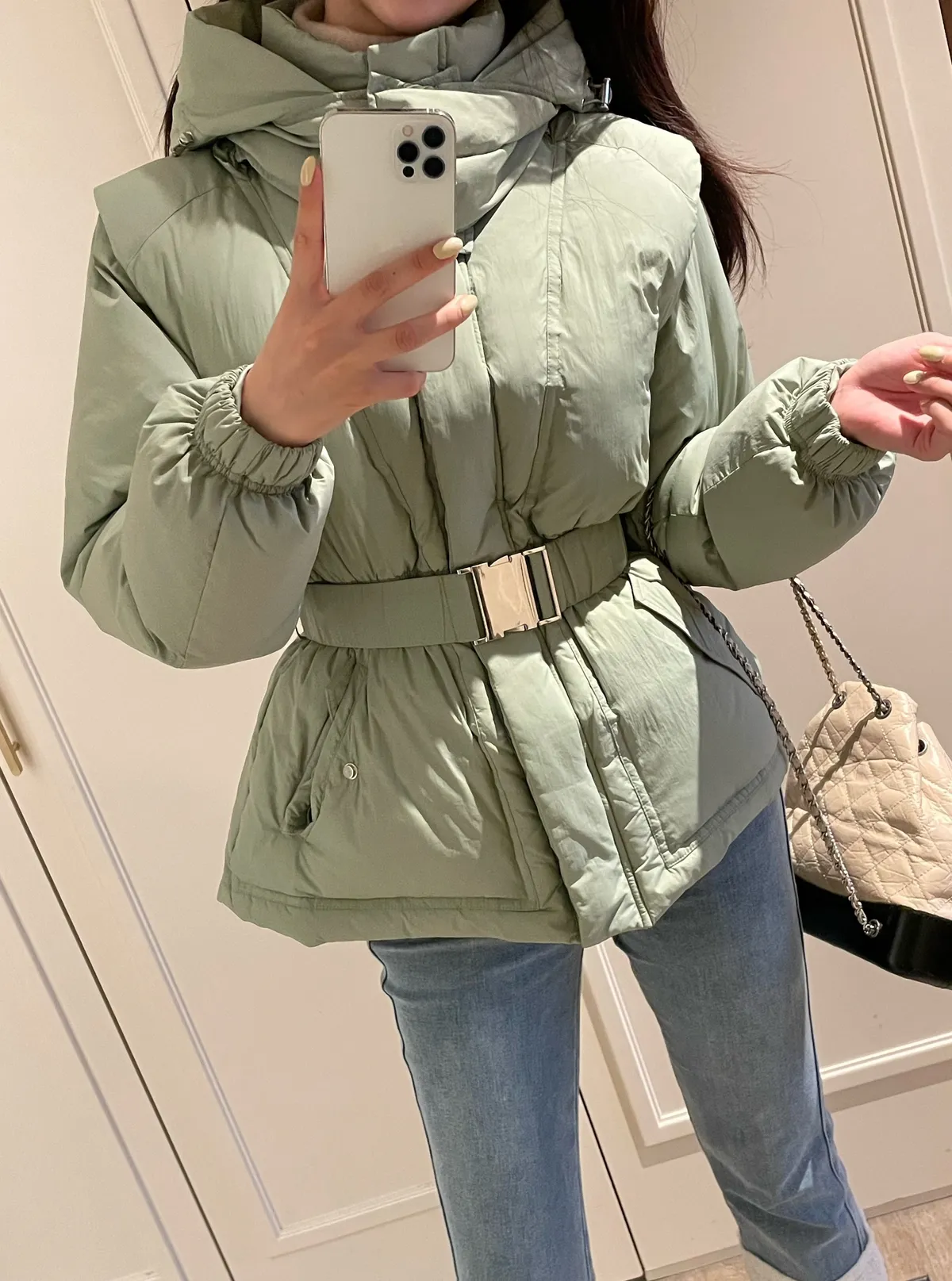 設計師品牌 鴨絨100%重工連帽收腰腰帶羽絨外套