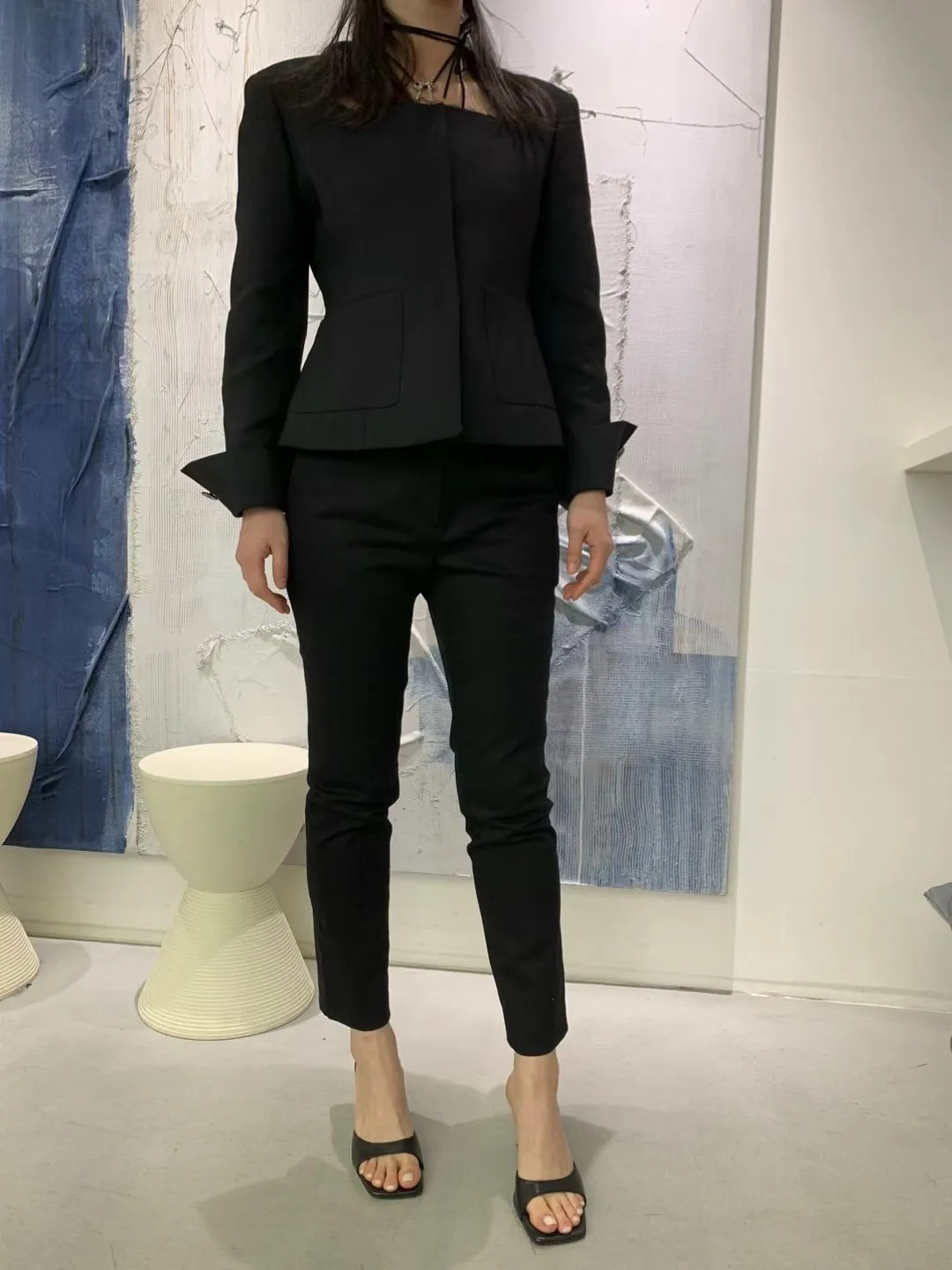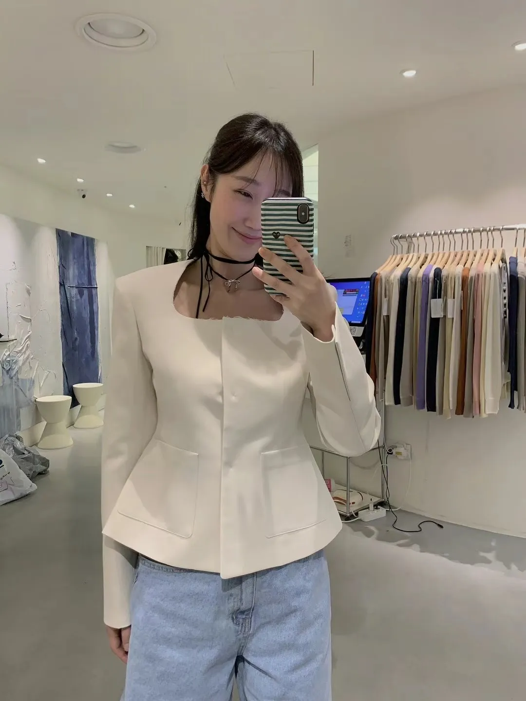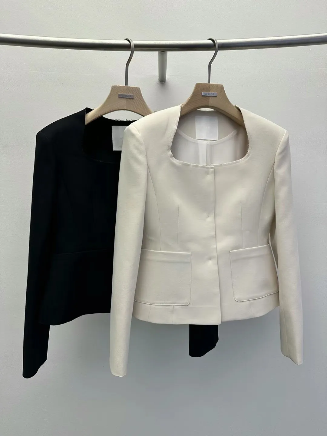 高端設計師品牌 毛邊剪裁收腰方領短西裝外套
