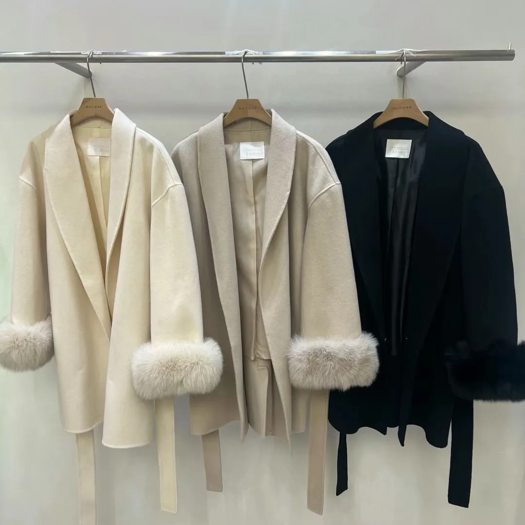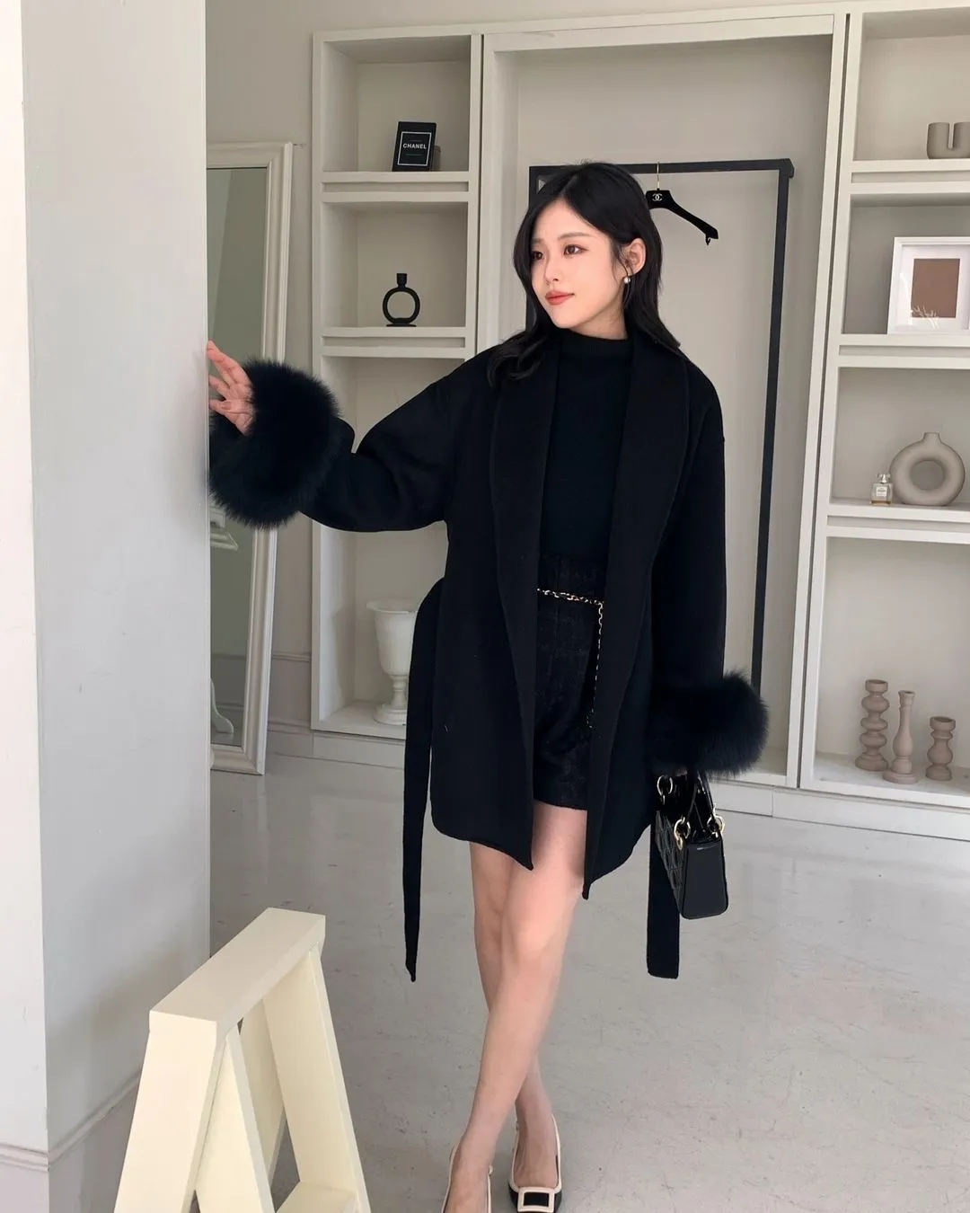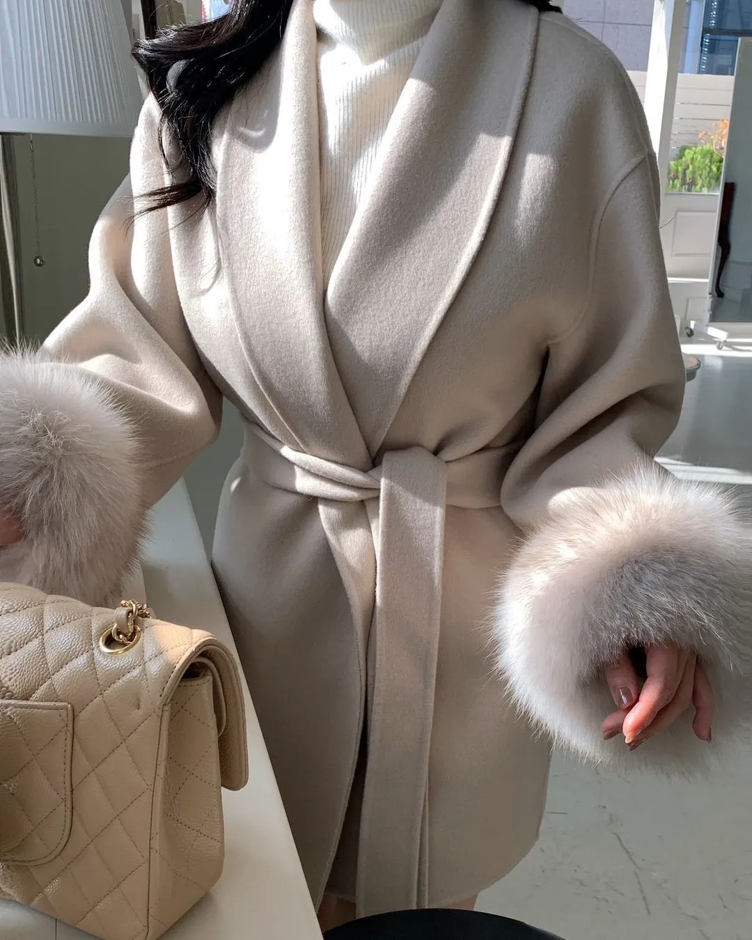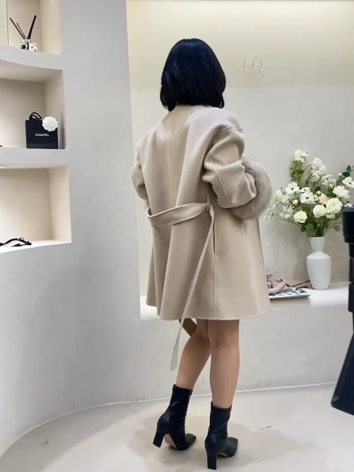 手工大衣 羊毛100%袖口狐狸毛修身綁帶中長版大衣外套