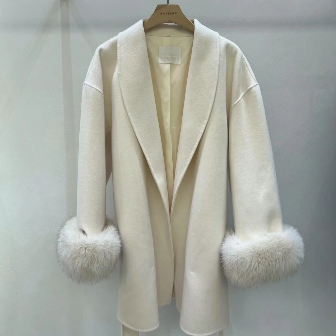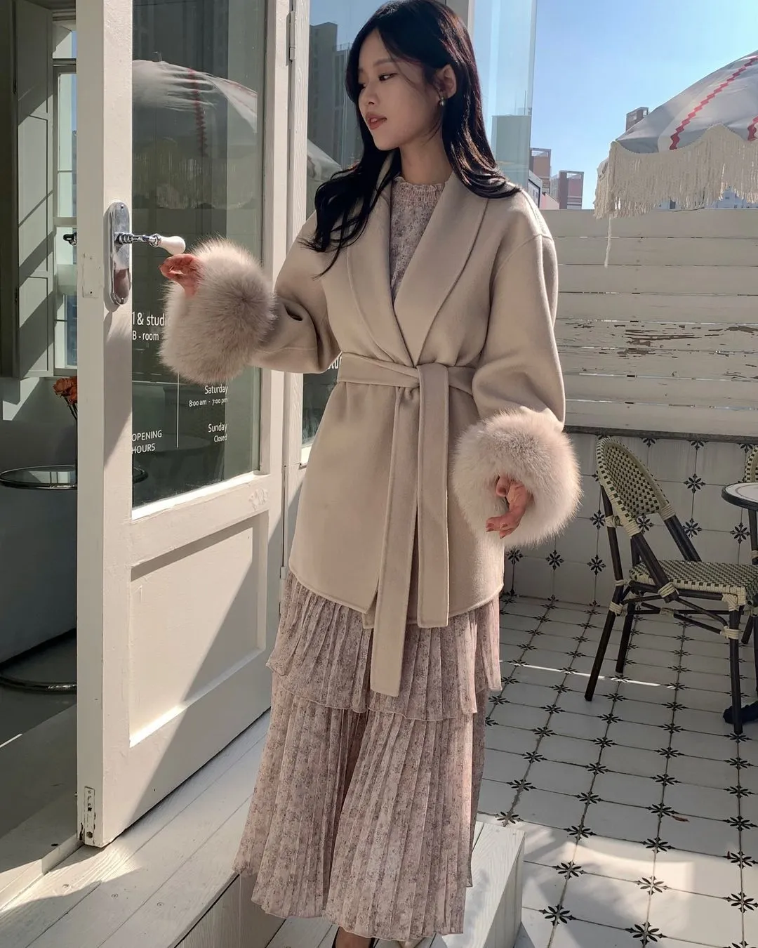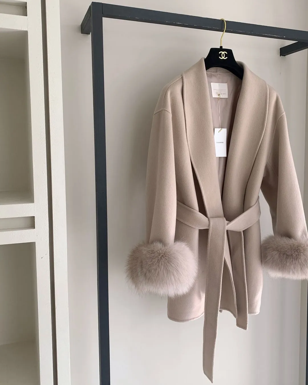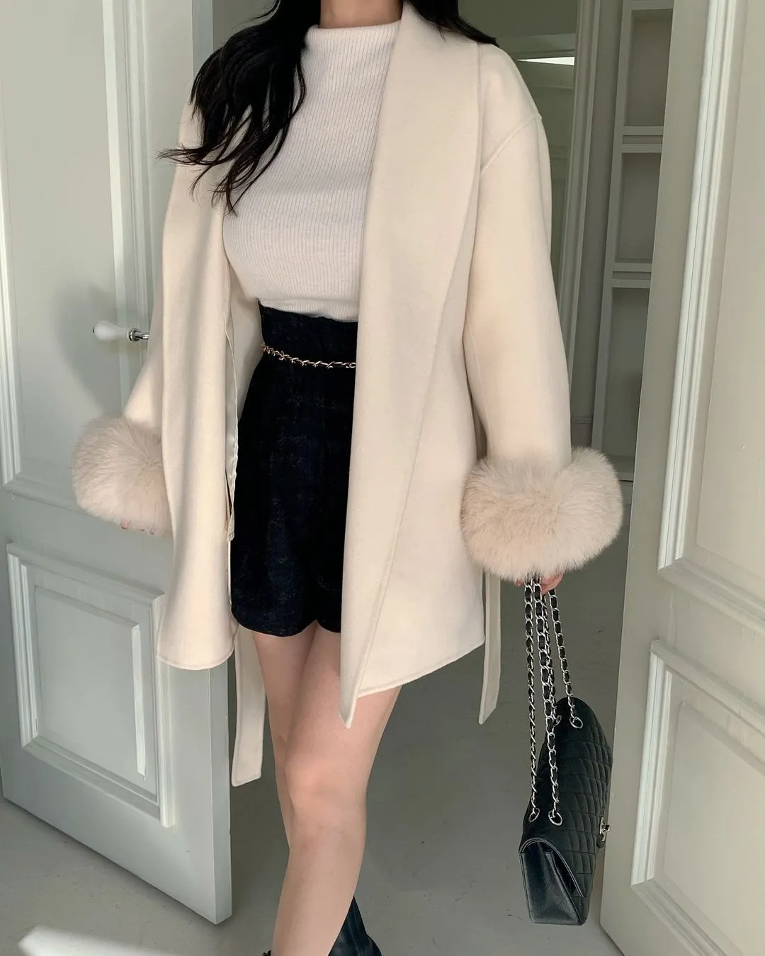 手工大衣 羊毛100%袖口狐狸毛修身綁帶中長版大衣外套