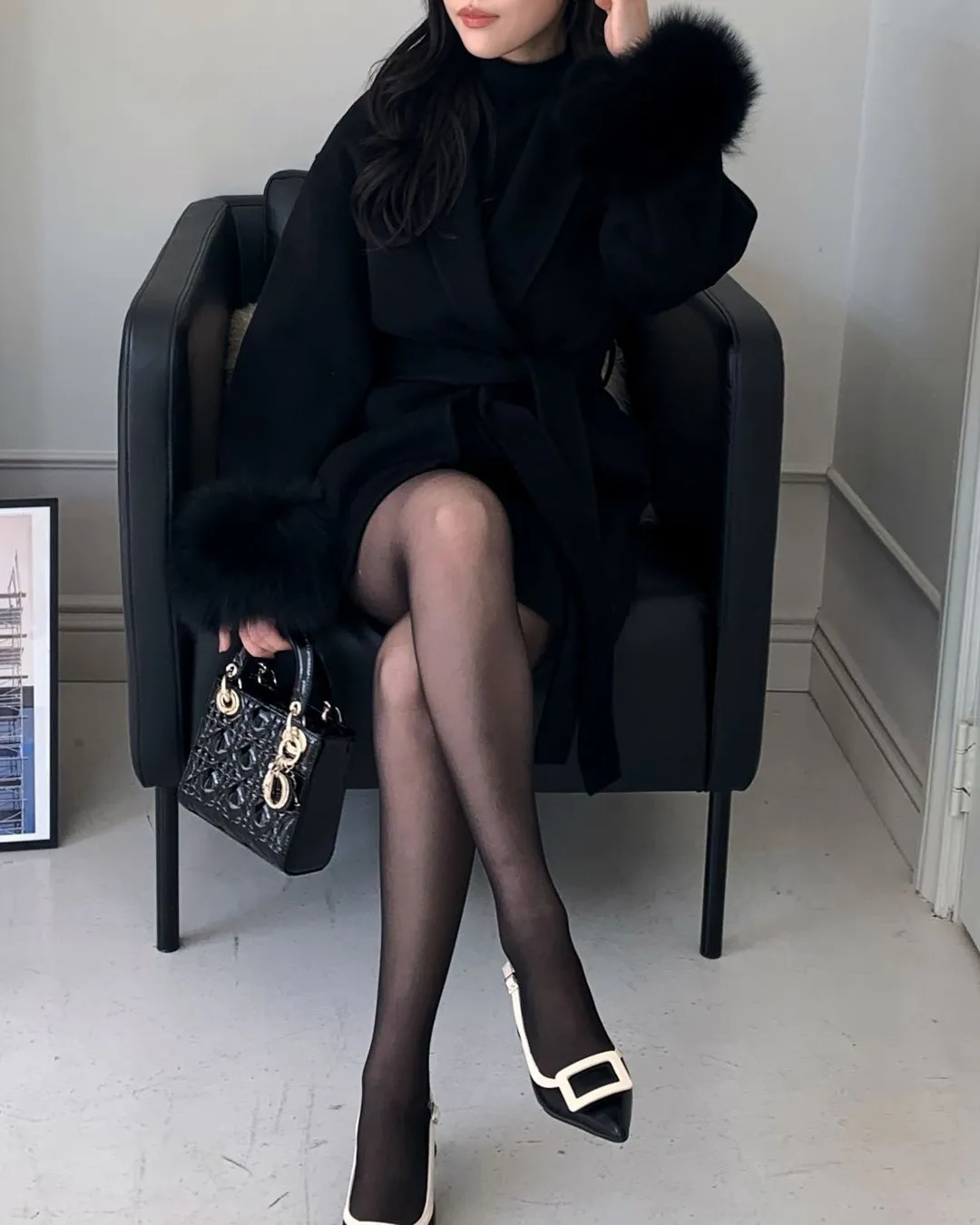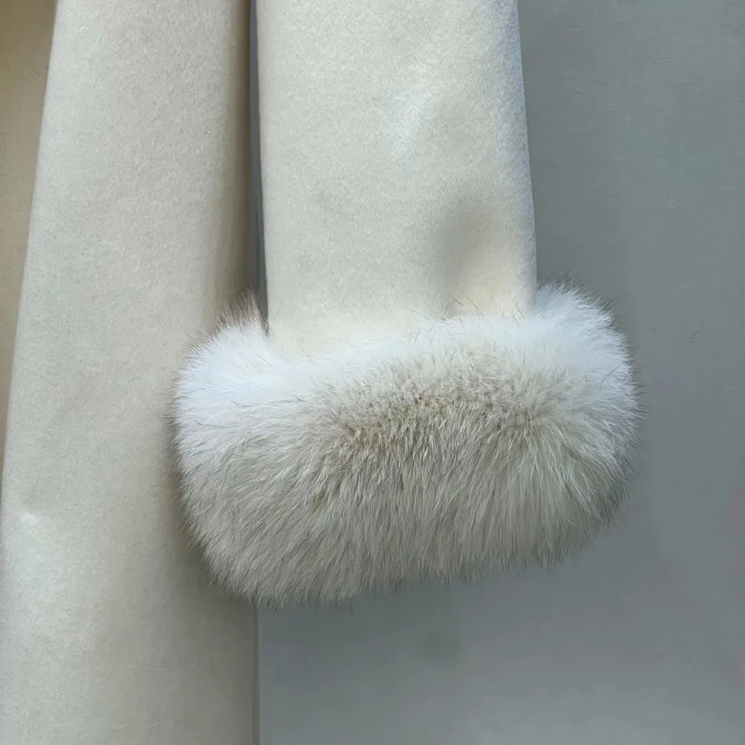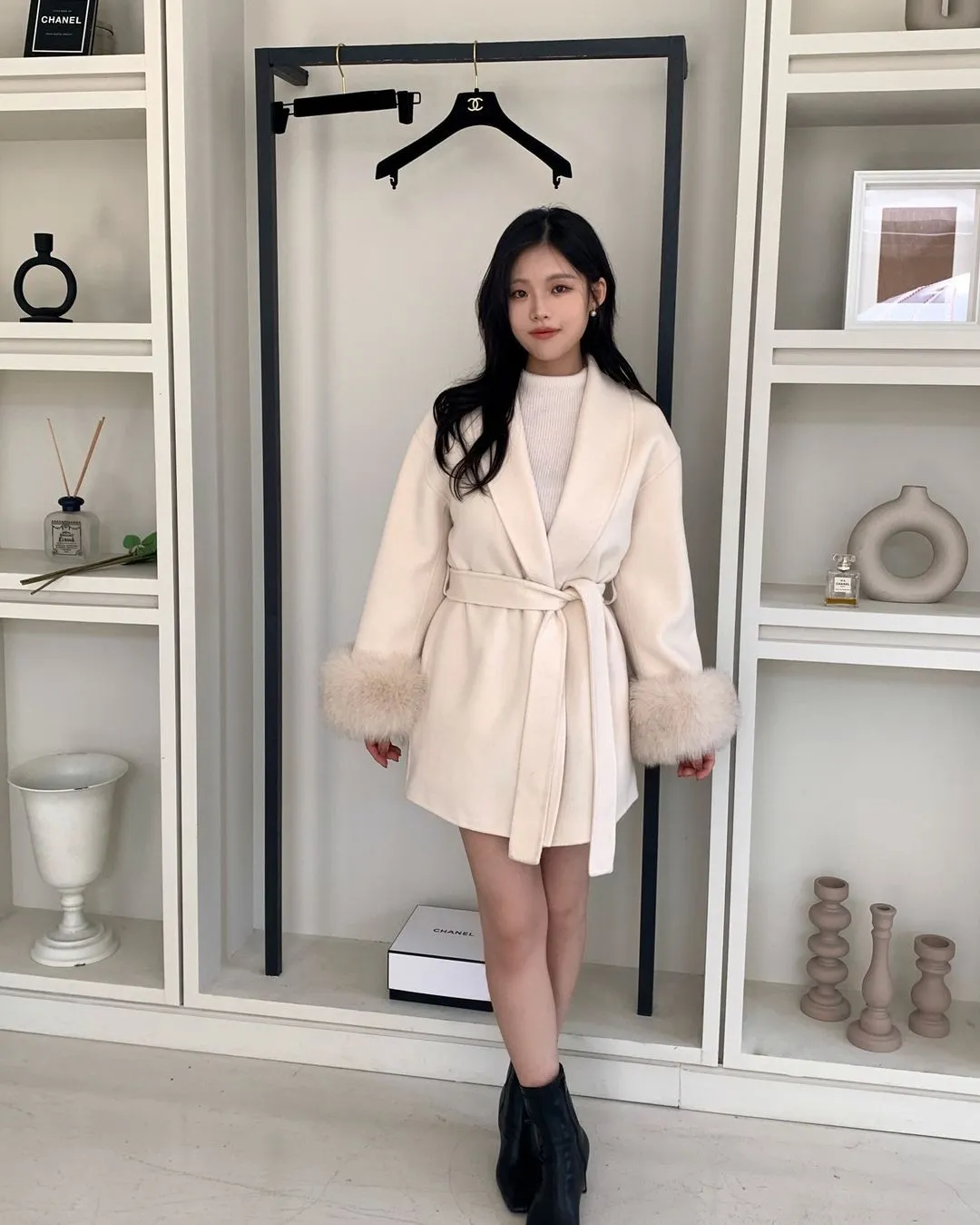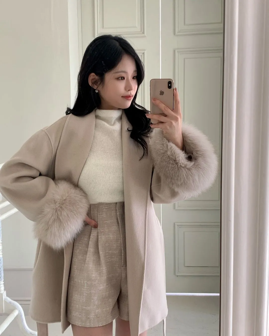 手工大衣 羊毛100%袖口狐狸毛修身綁帶中長版大衣外套