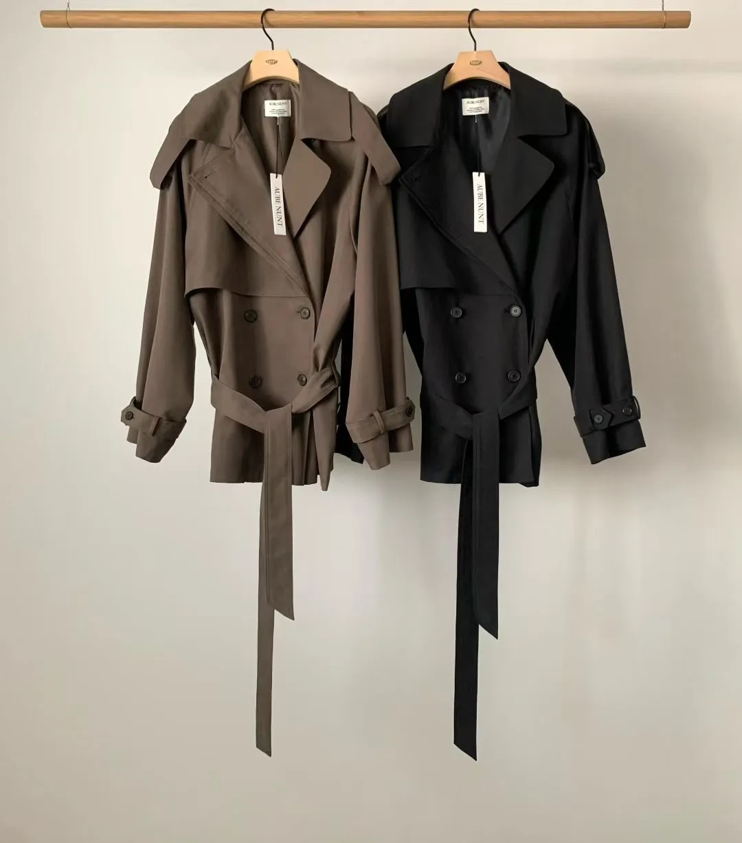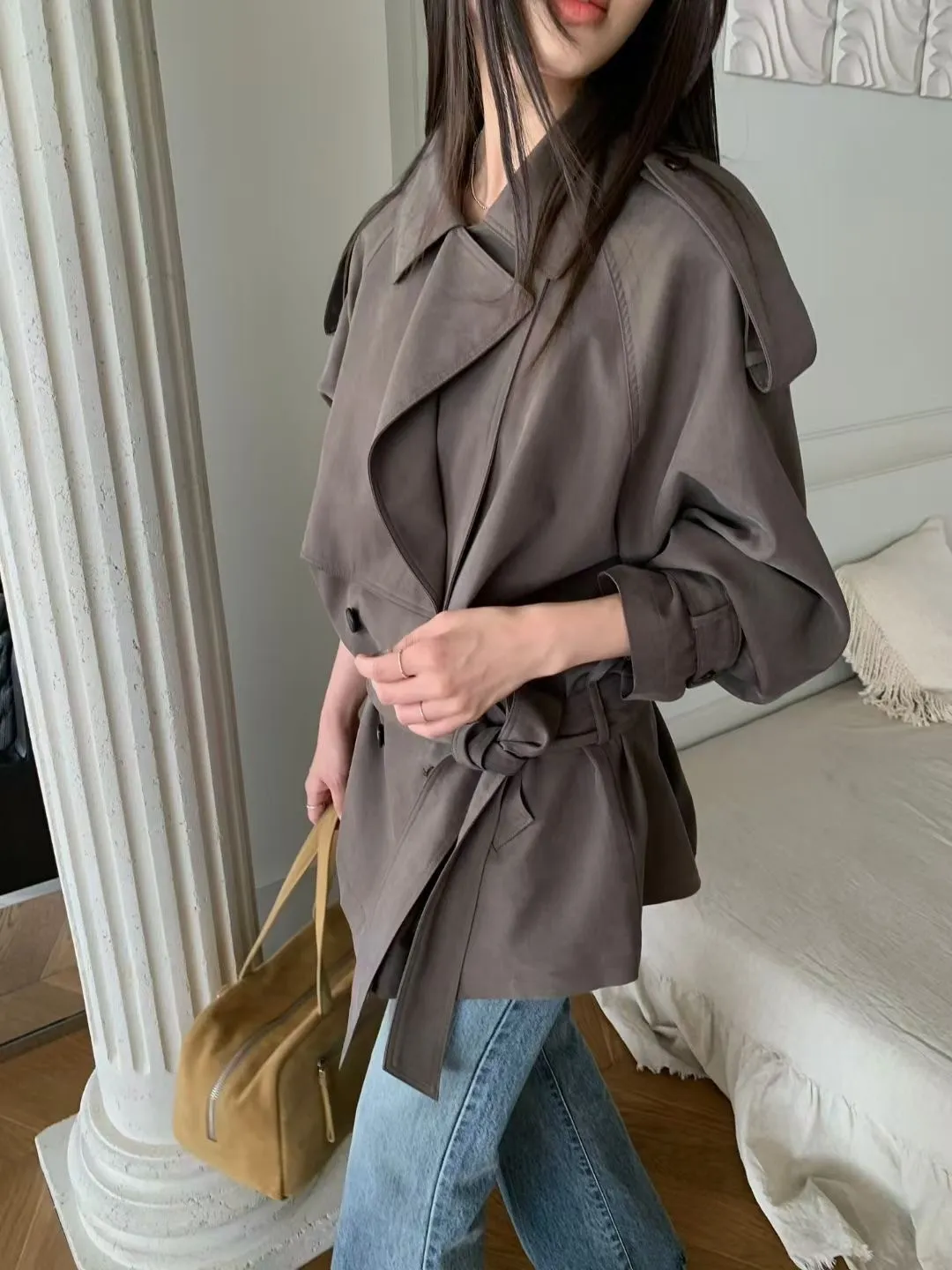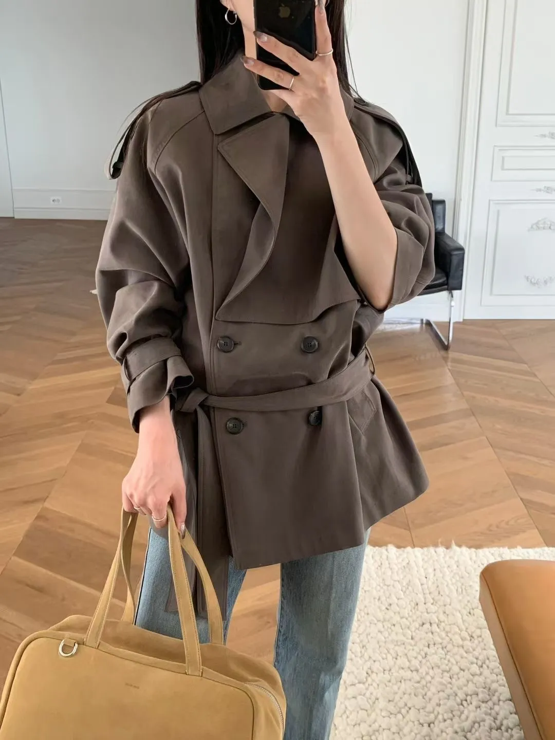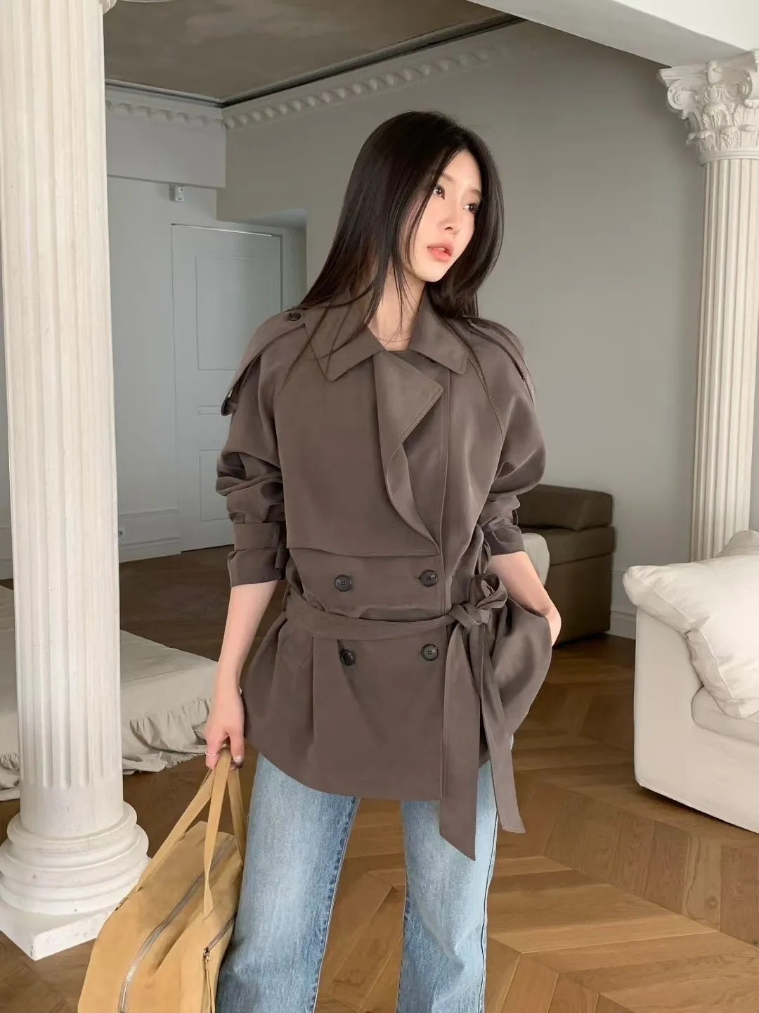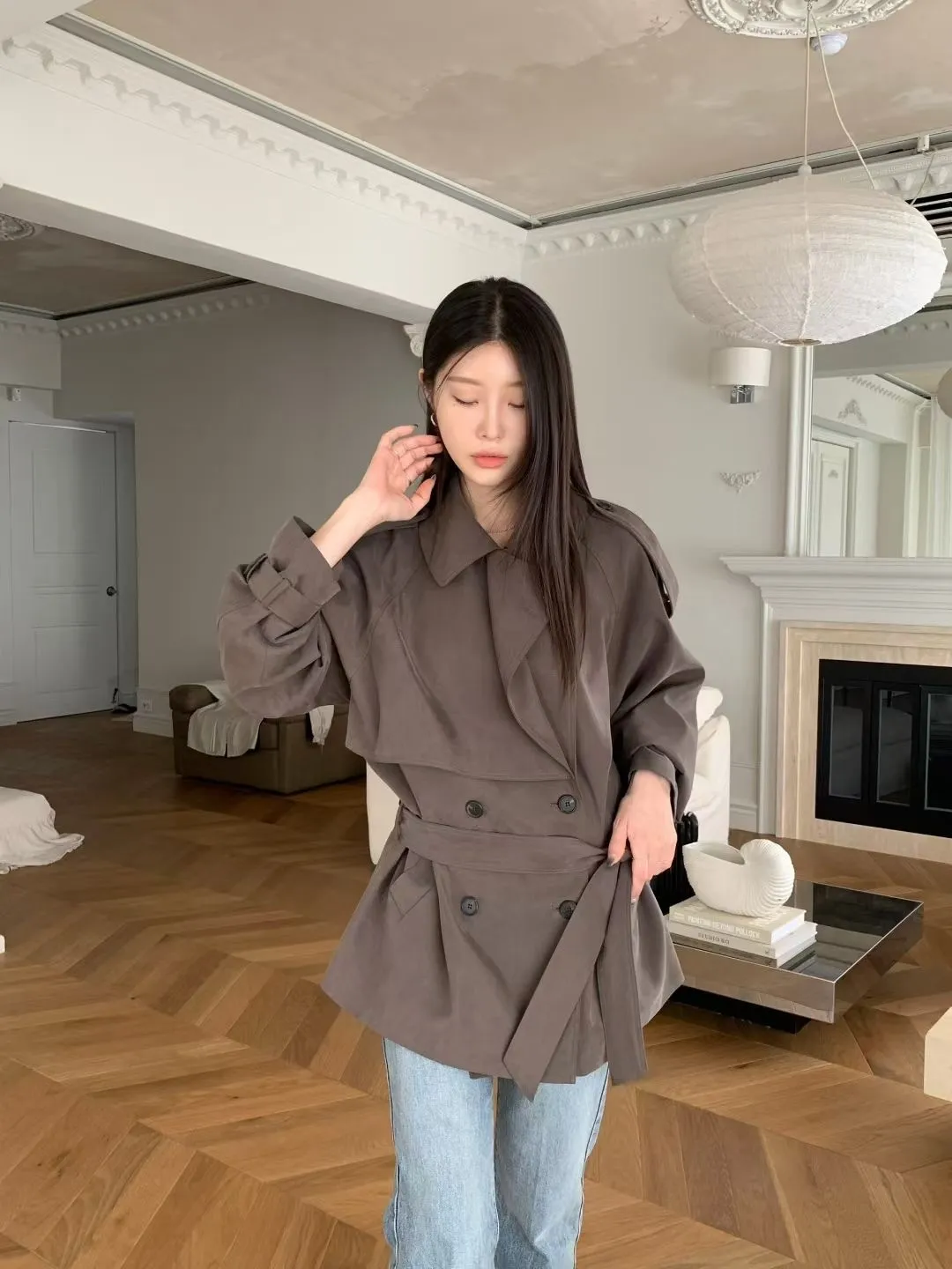 俐落感雙排扣綁帶短版風衣外套