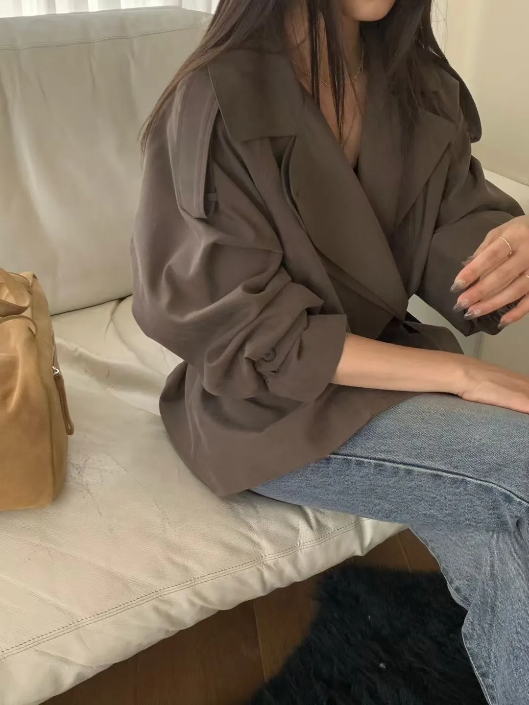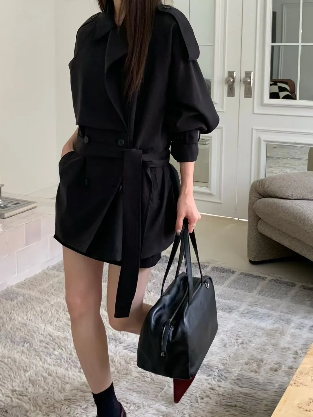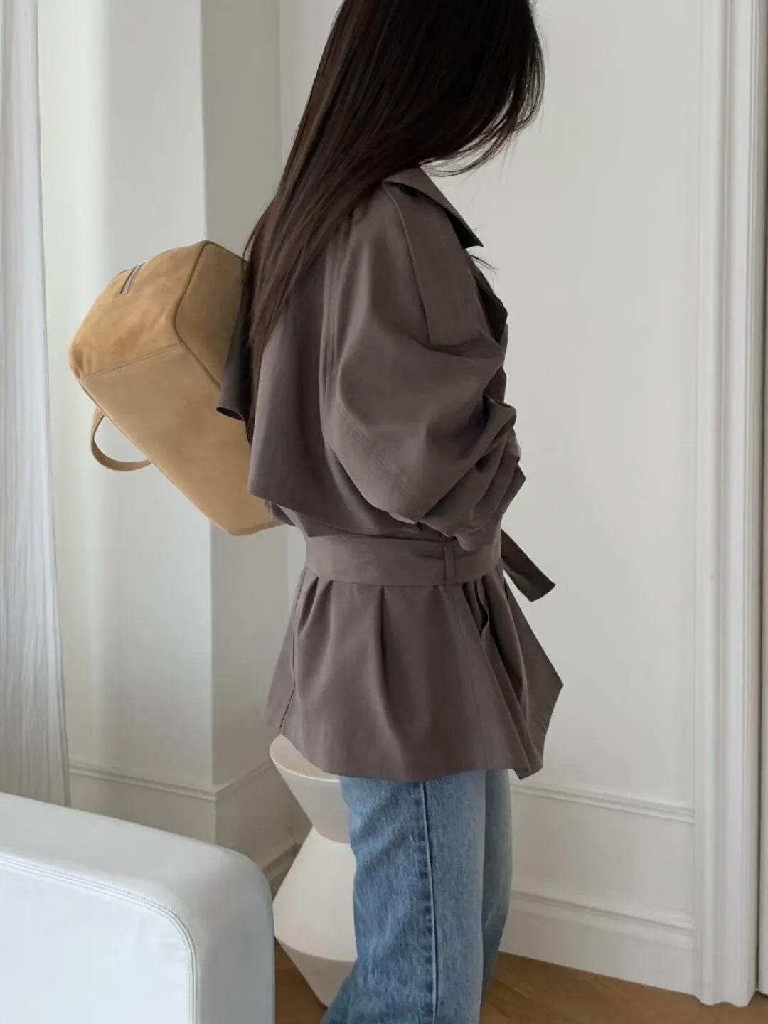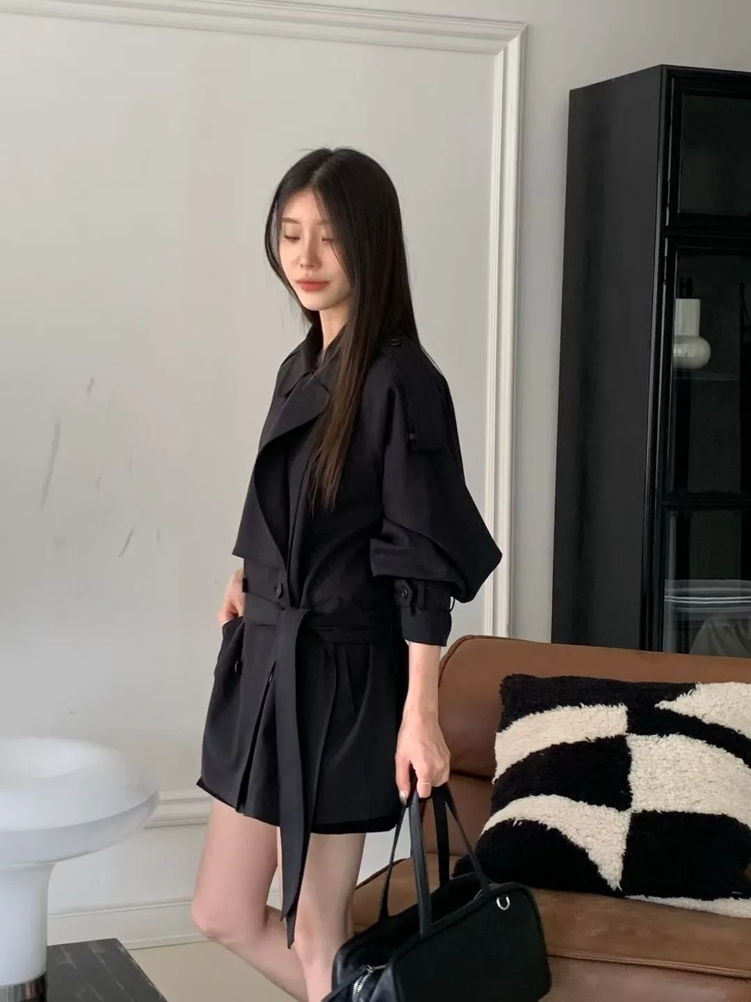 俐落感雙排扣綁帶短版風衣外套