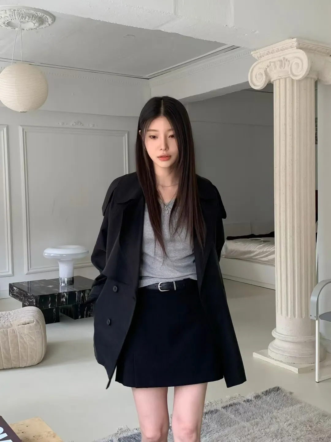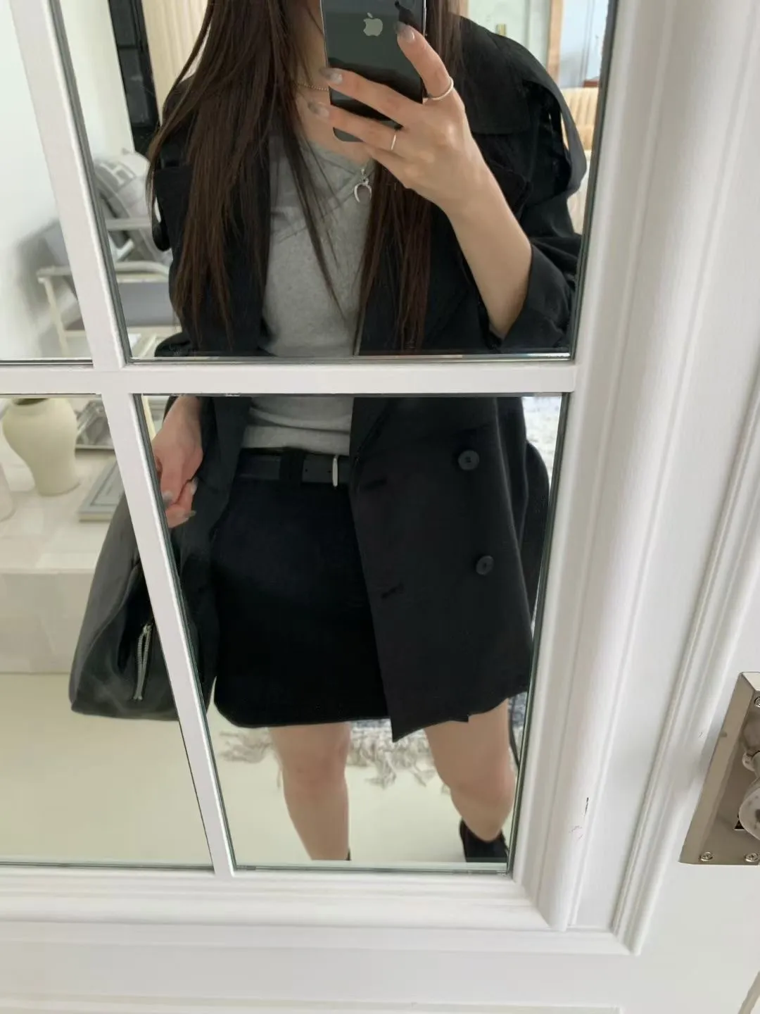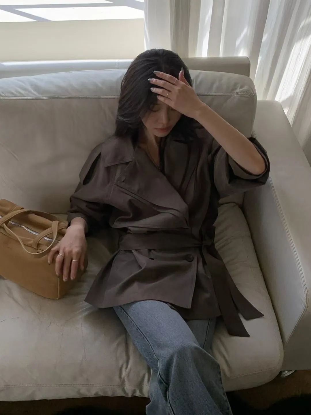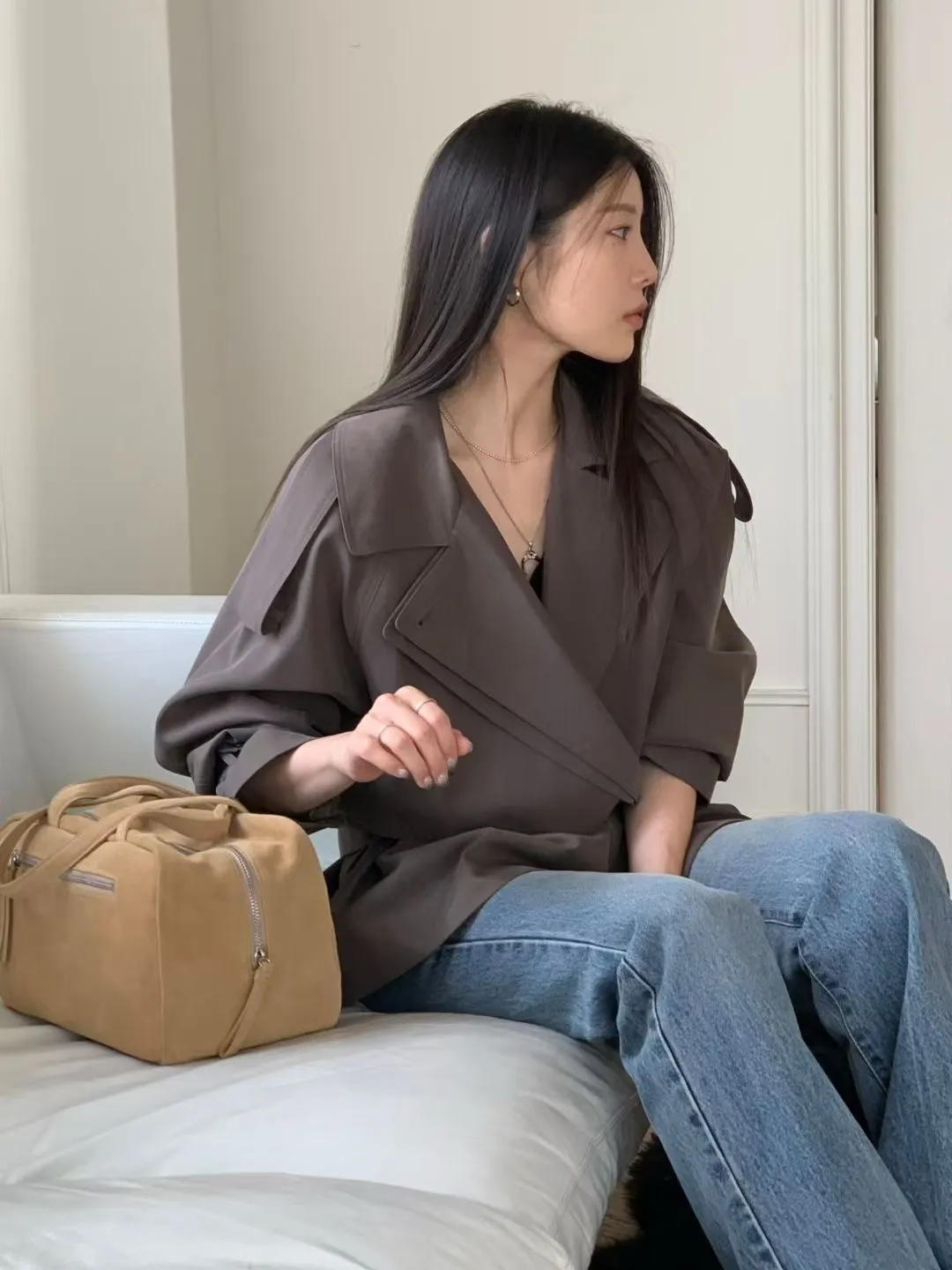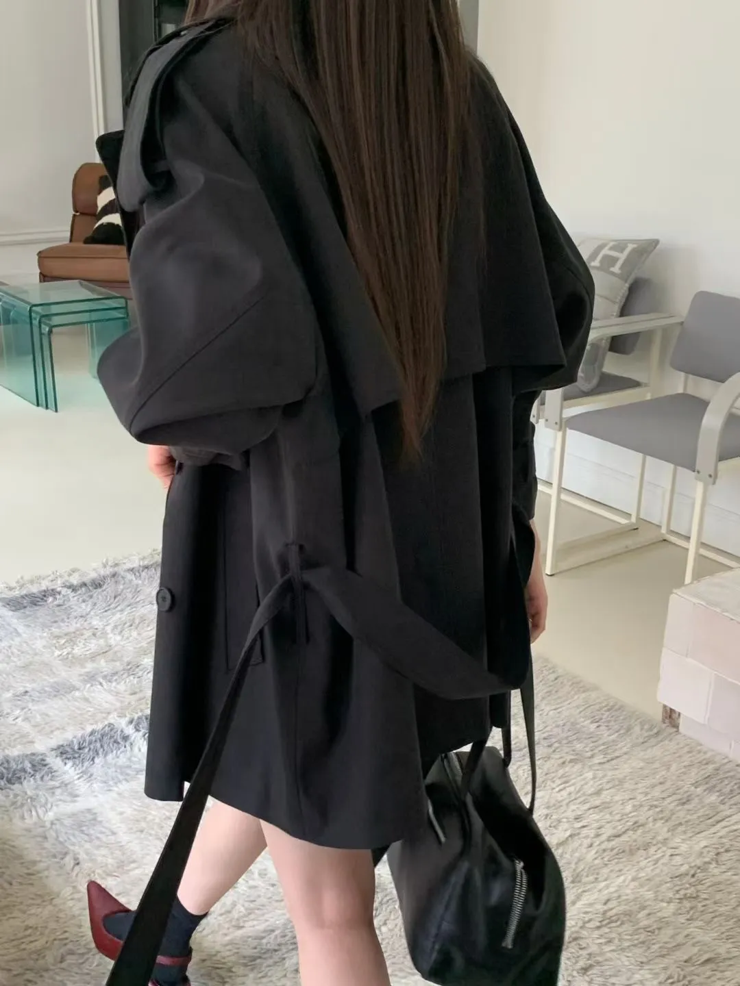 俐落感雙排扣綁帶短版風衣外套