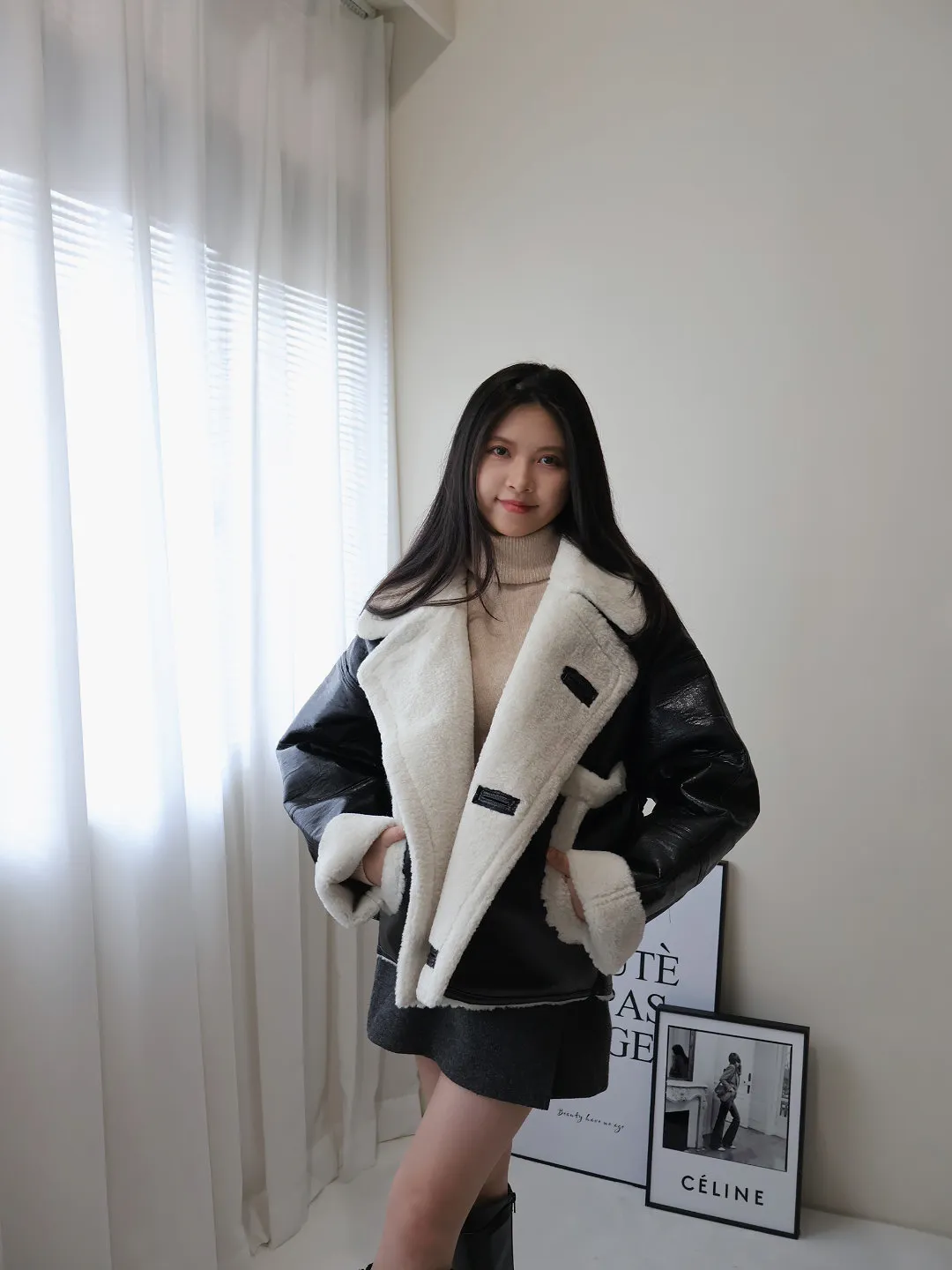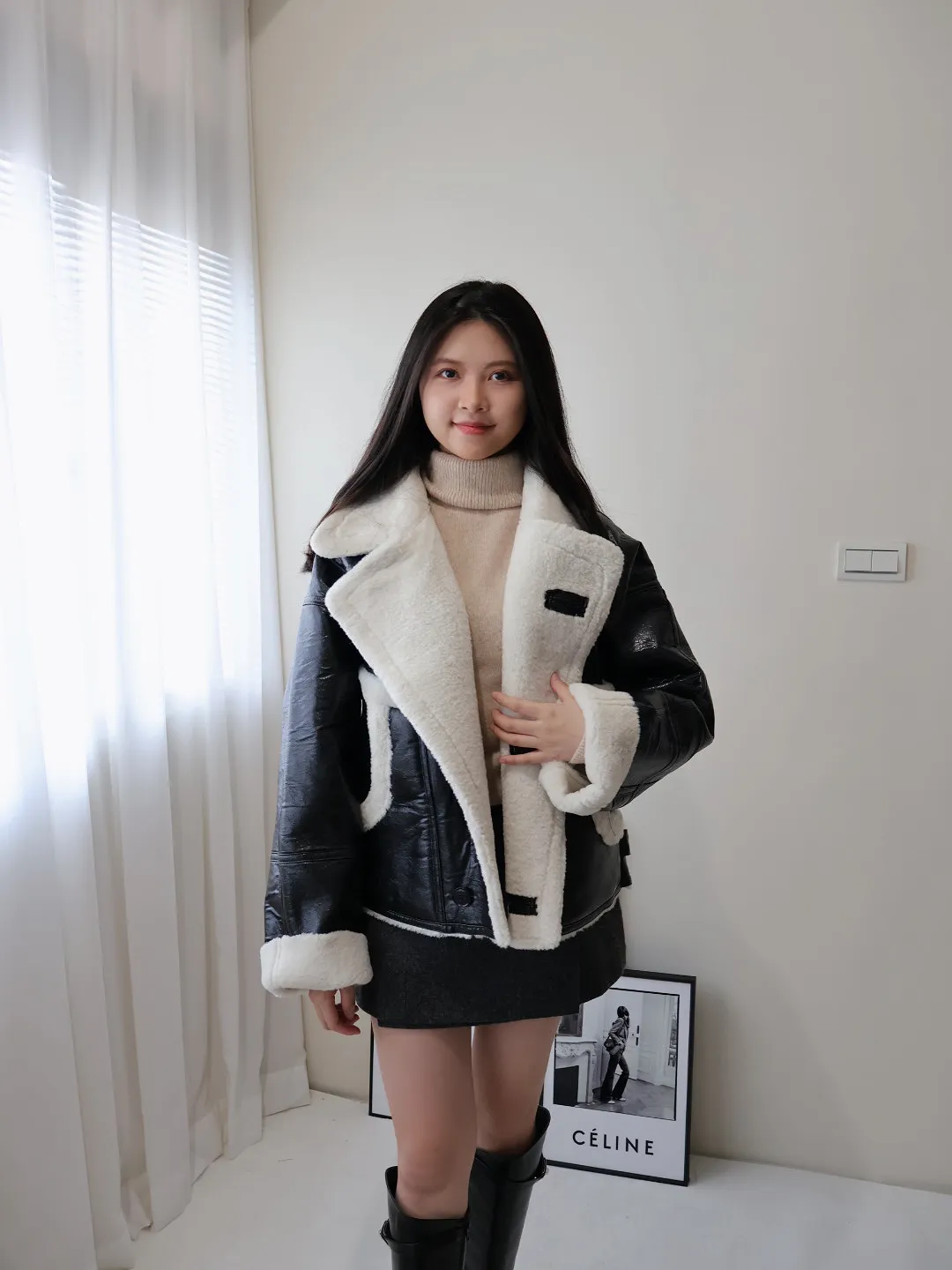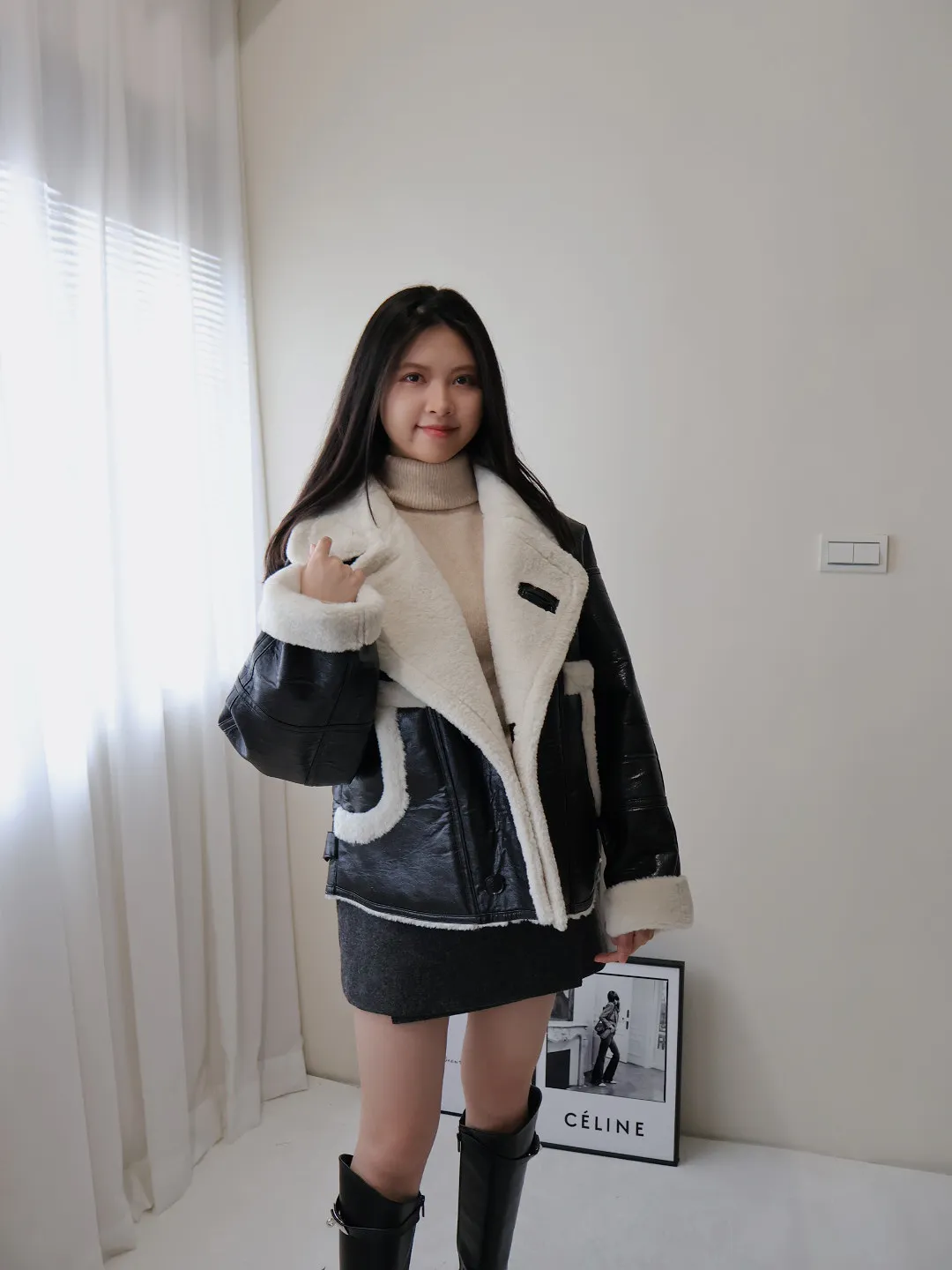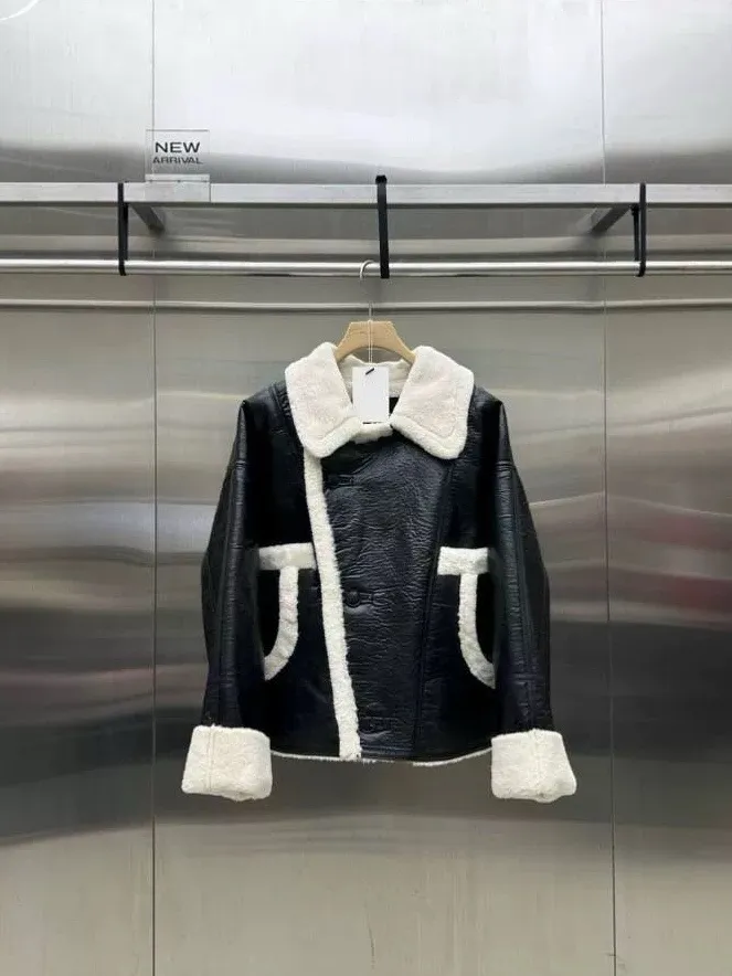 設計師品牌 翻領重工皮毛一體加絨pu皮外套