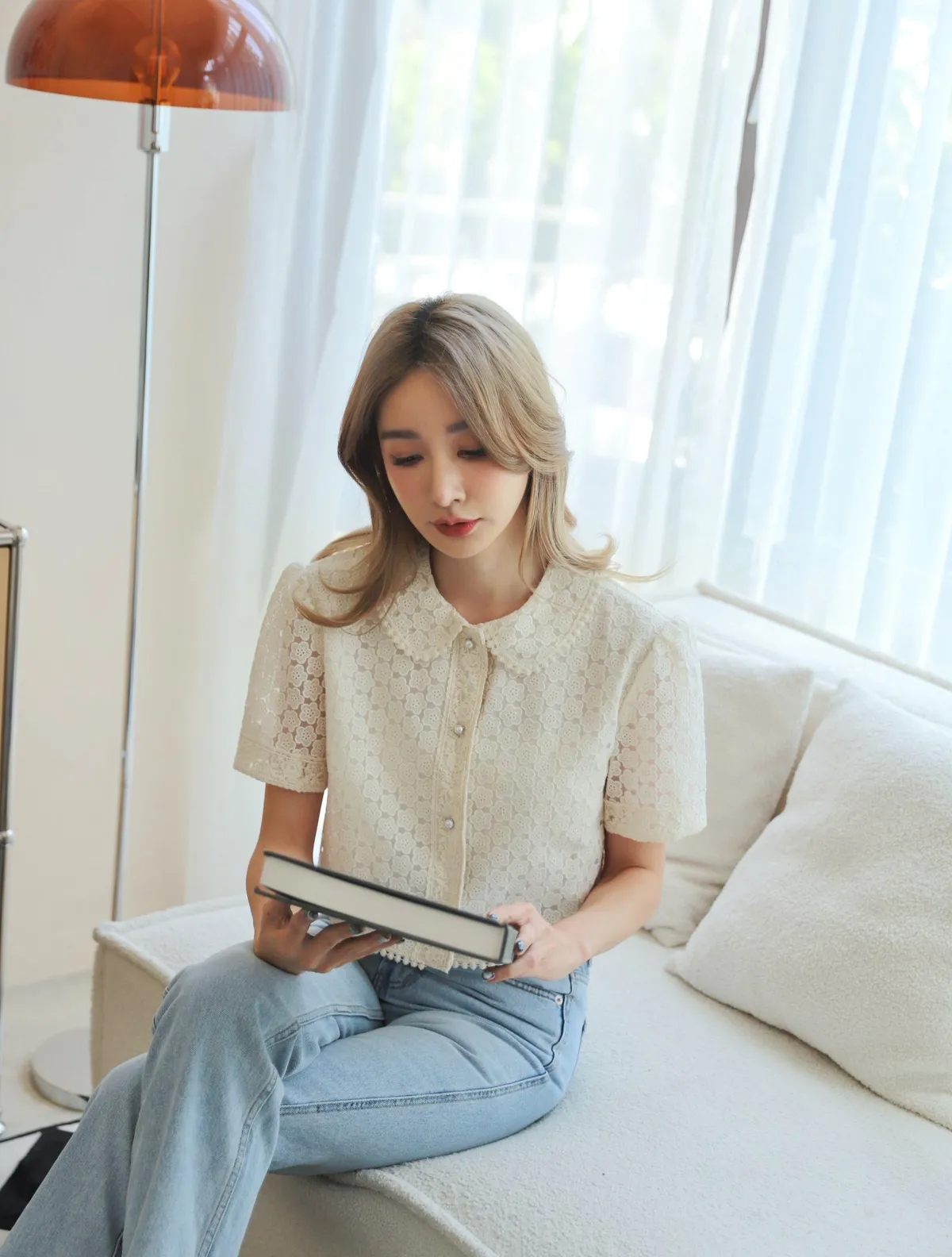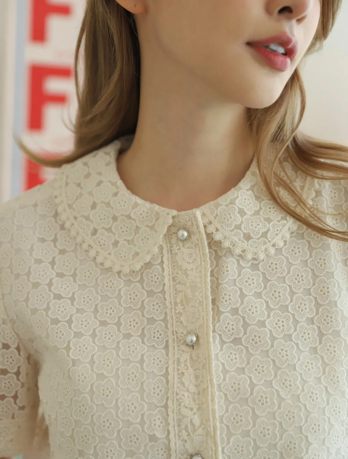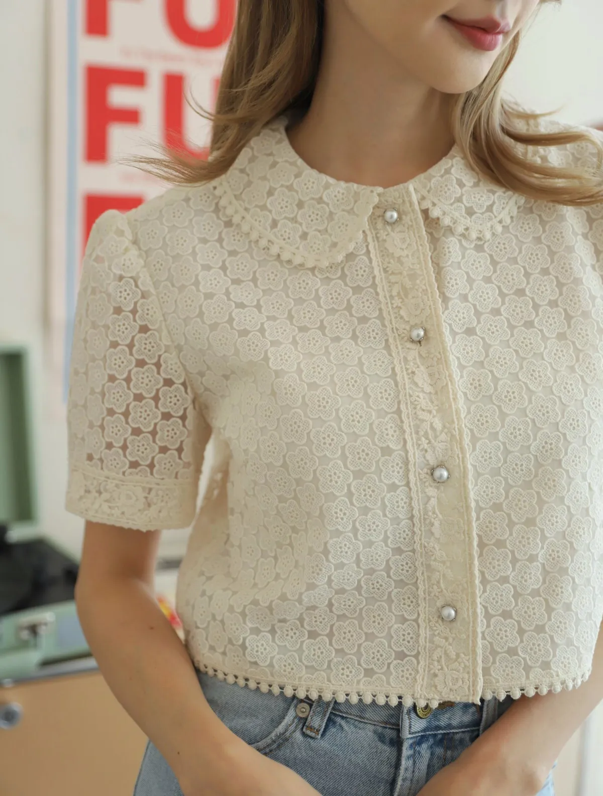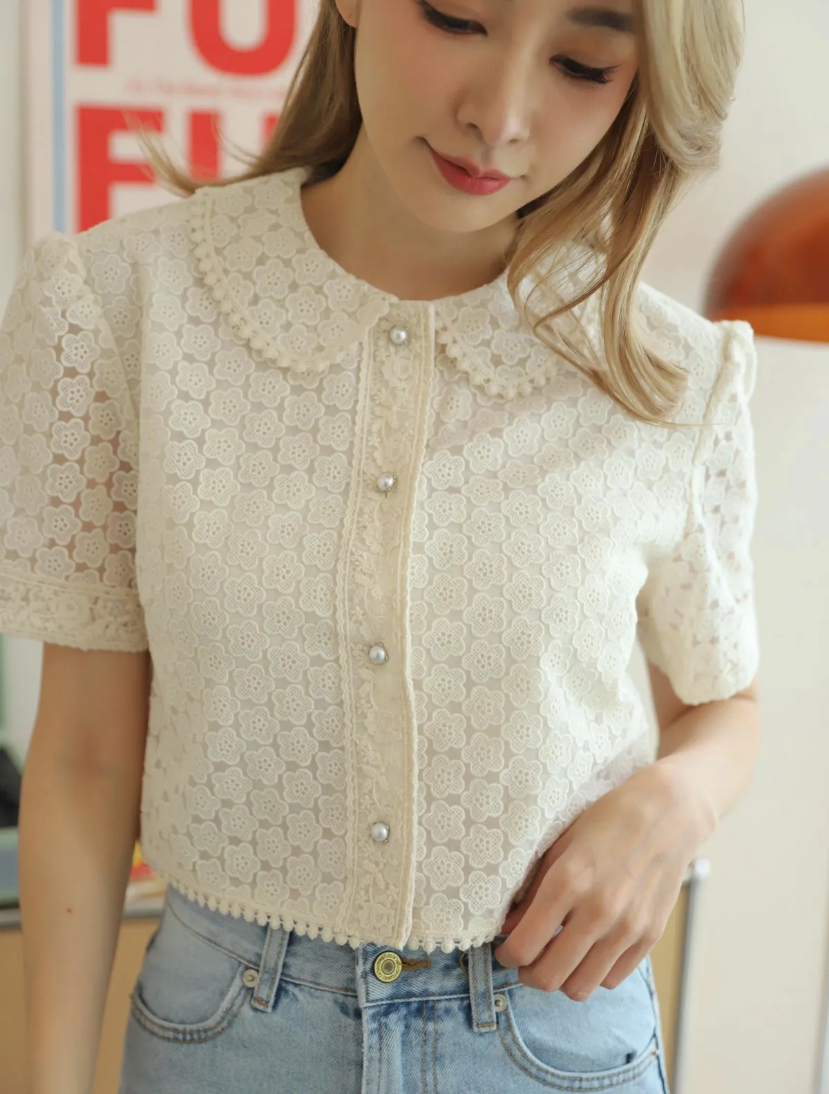 高端設計師品牌 公主風甜美短袖娃娃領珍珠釦蕾絲勾花上衣