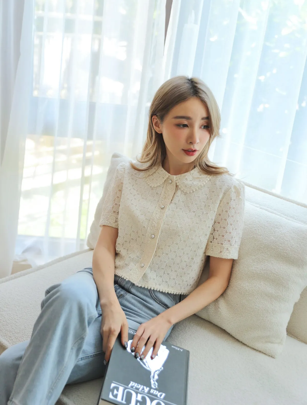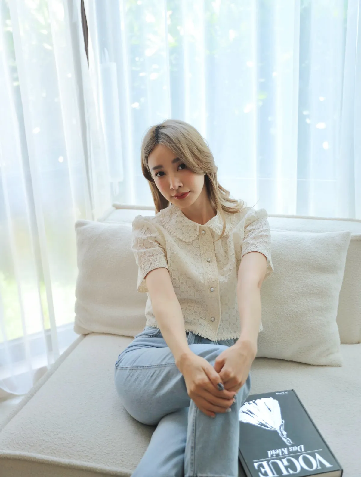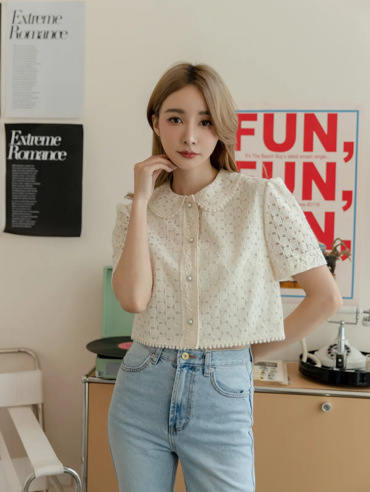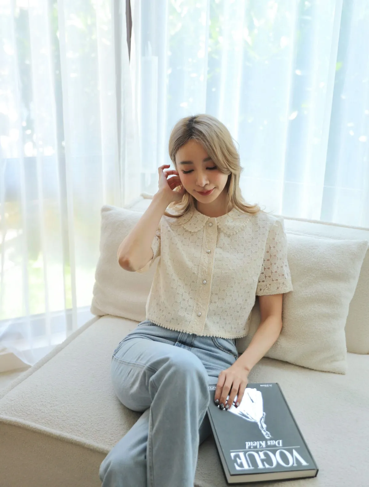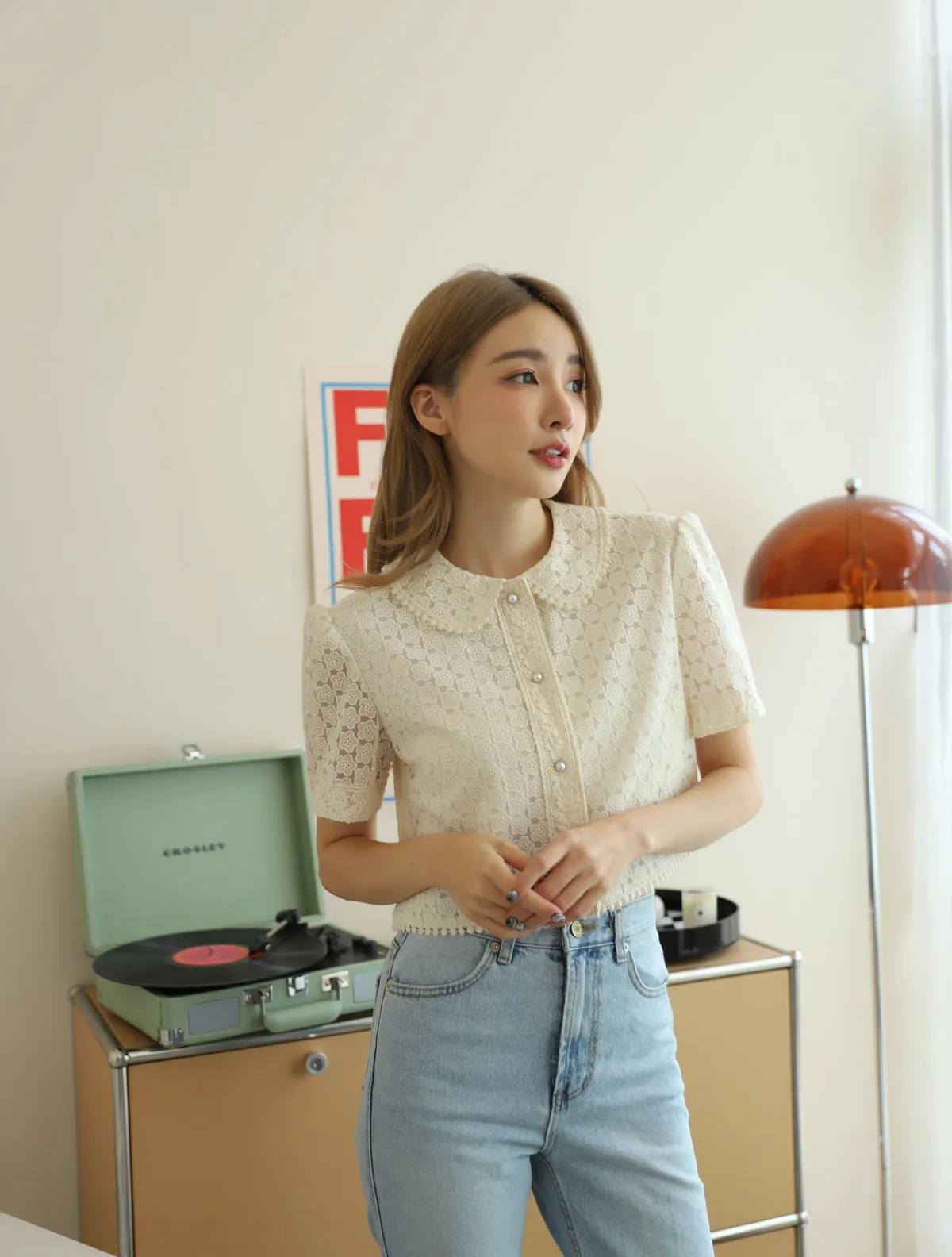 高端設計師品牌 公主風甜美短袖娃娃領珍珠釦蕾絲勾花上衣