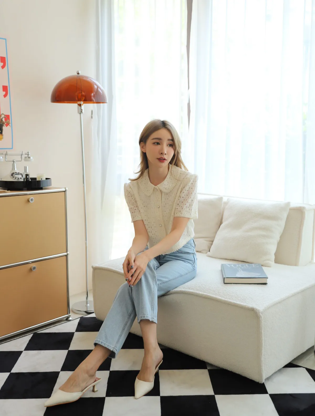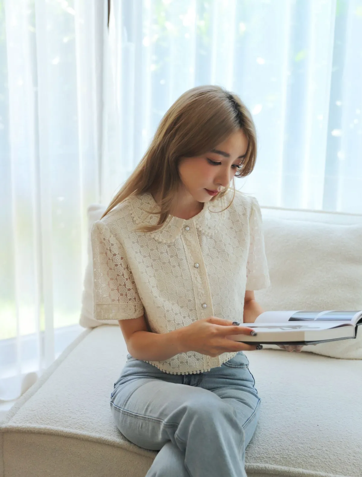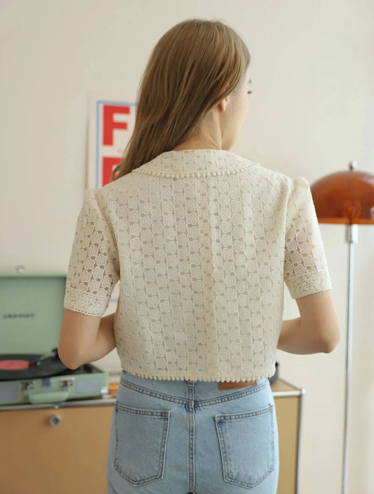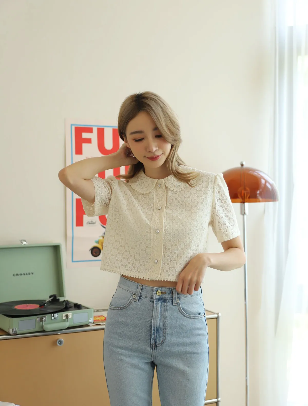 高端設計師品牌 公主風甜美短袖娃娃領珍珠釦蕾絲勾花上衣