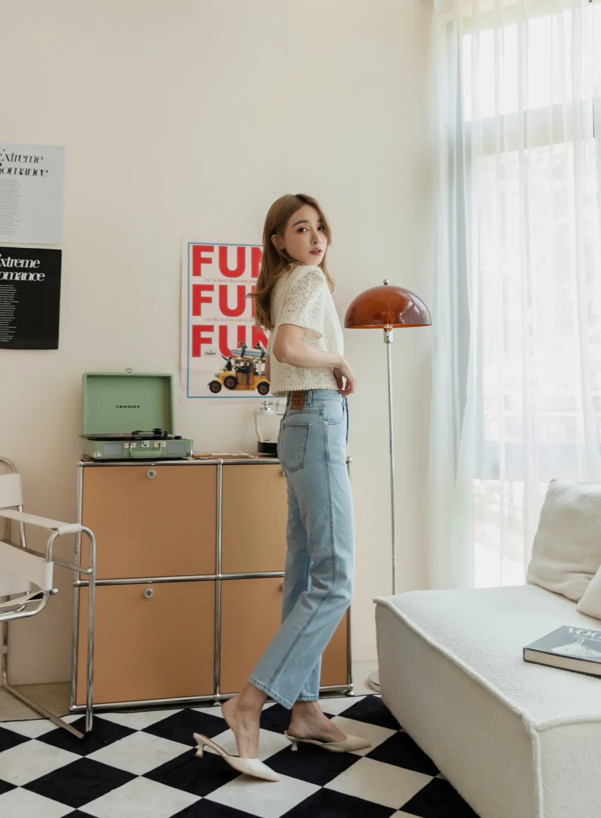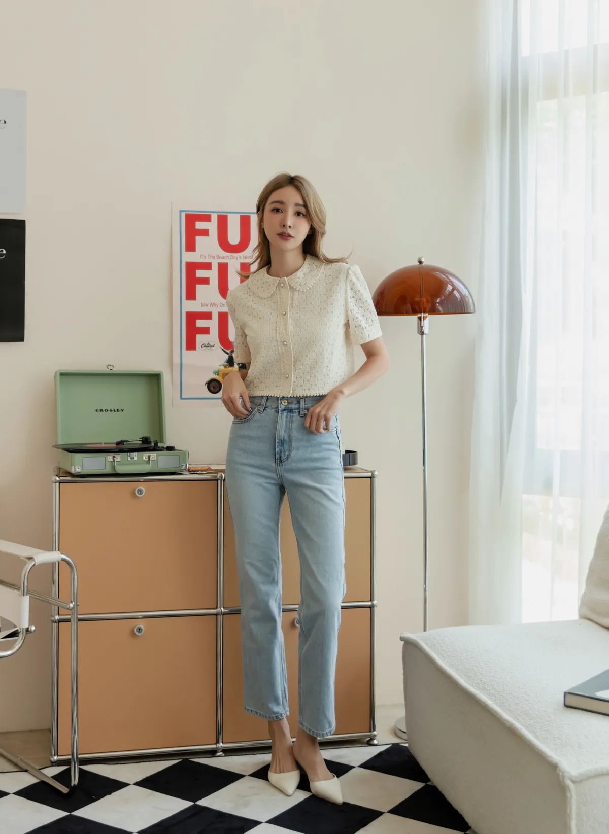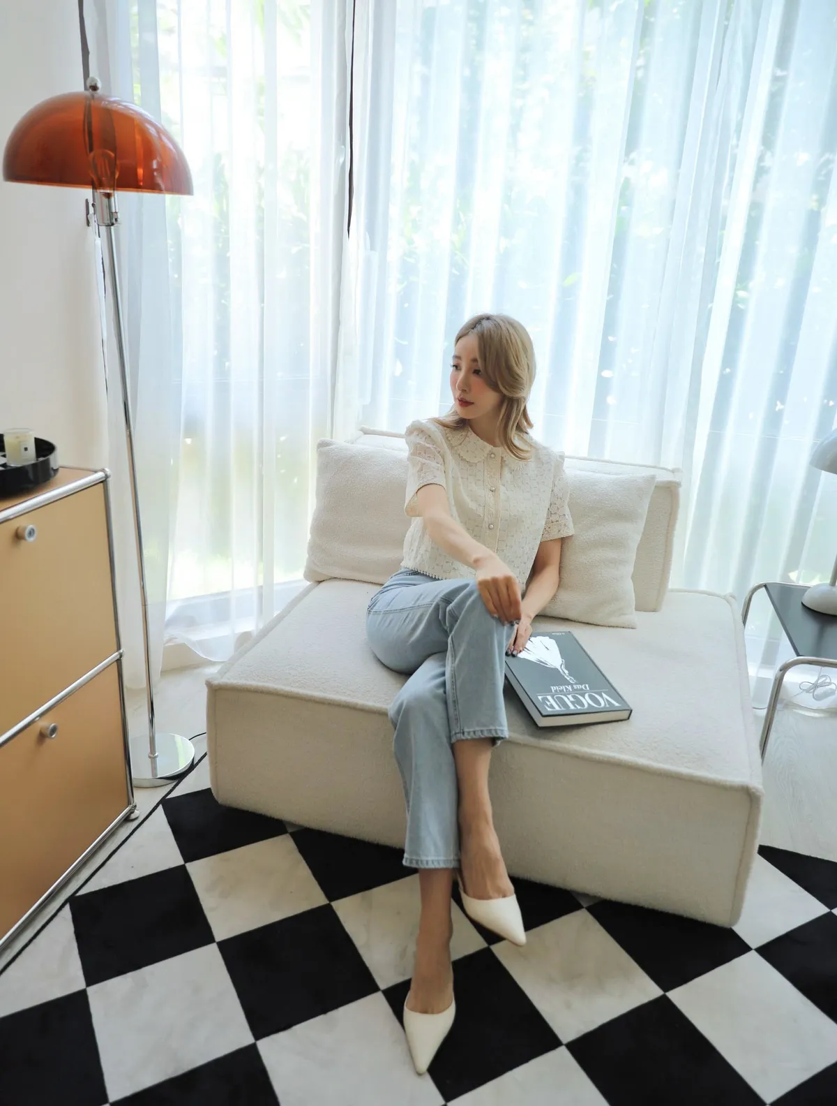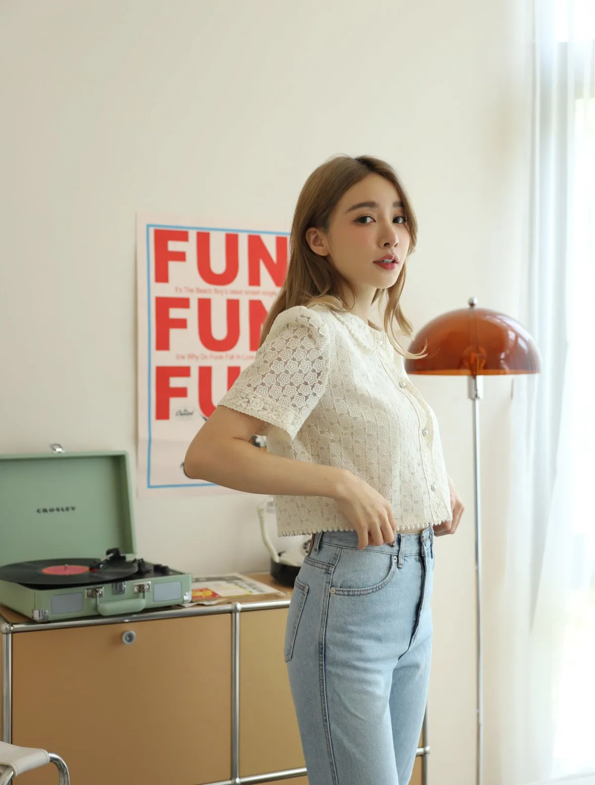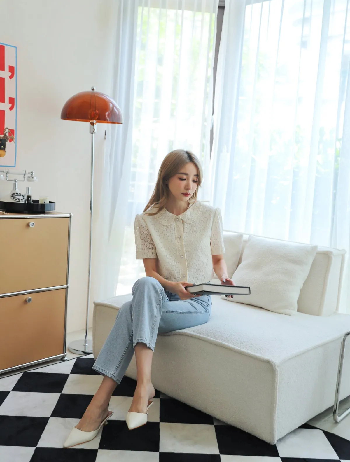 高端設計師品牌 公主風甜美短袖娃娃領珍珠釦蕾絲勾花上衣
