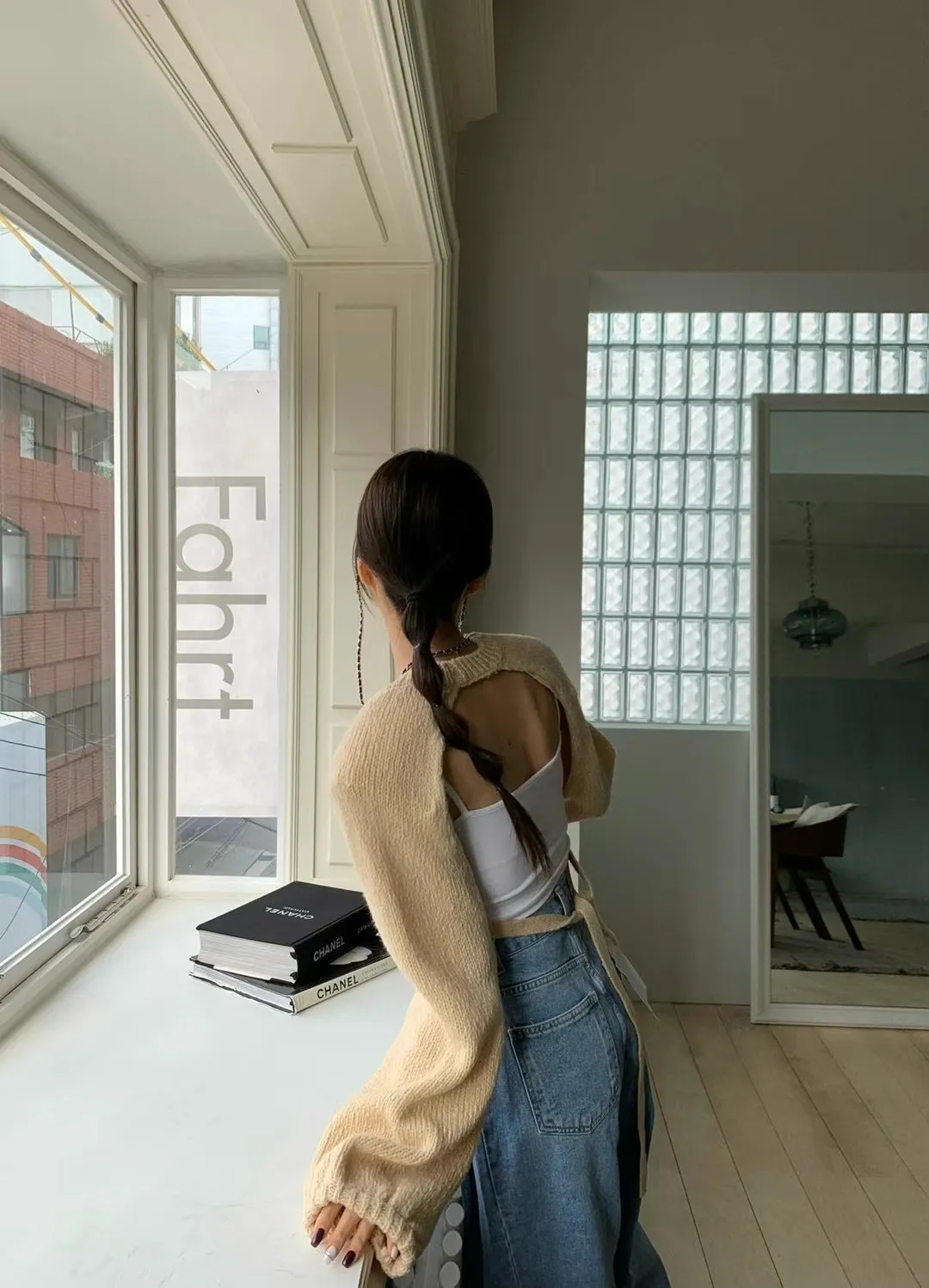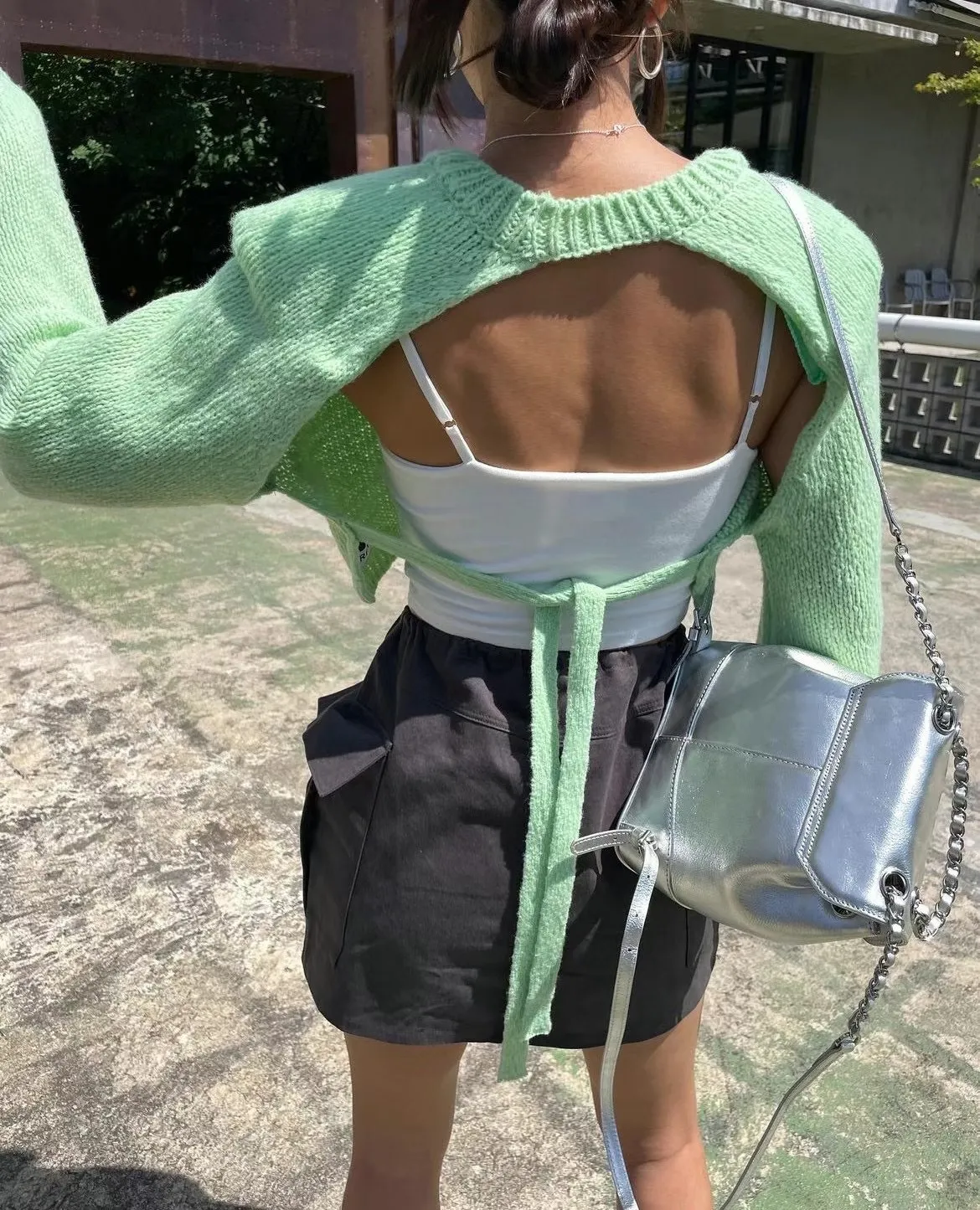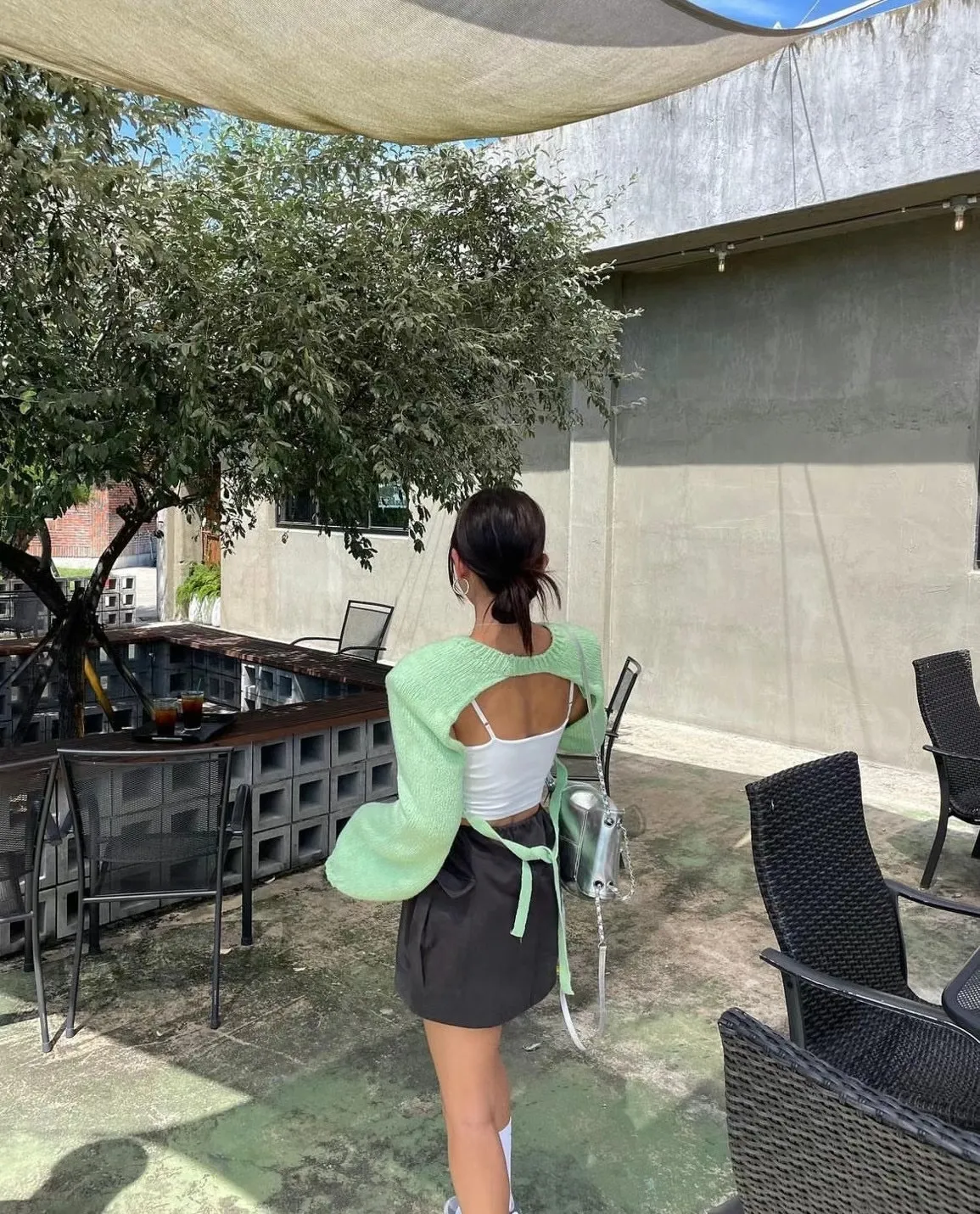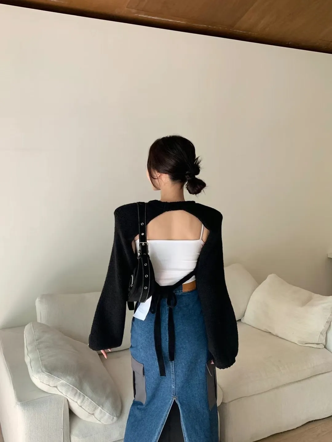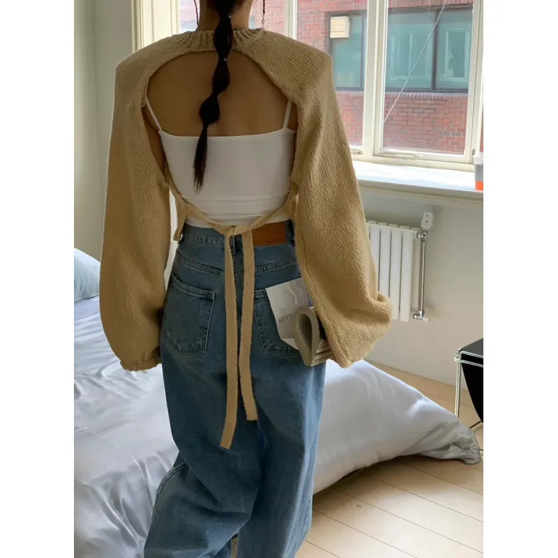 兩面穿設計 綁帶寬袖針織上衣外套 四色 短版上衣 外罩