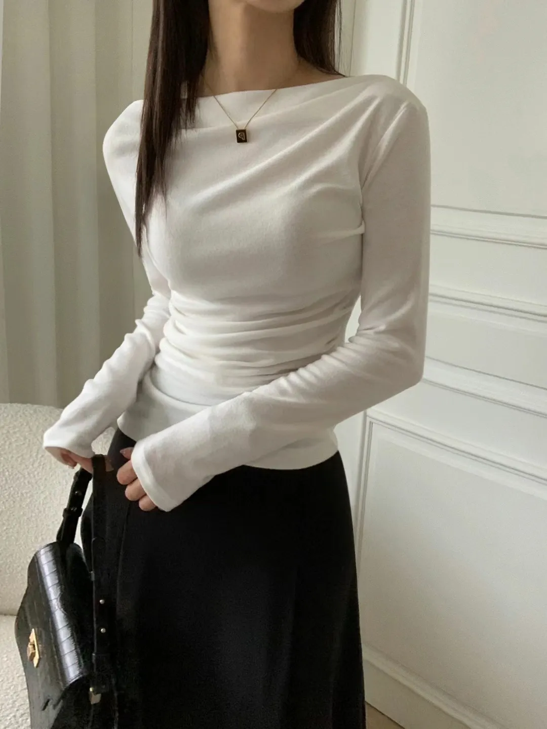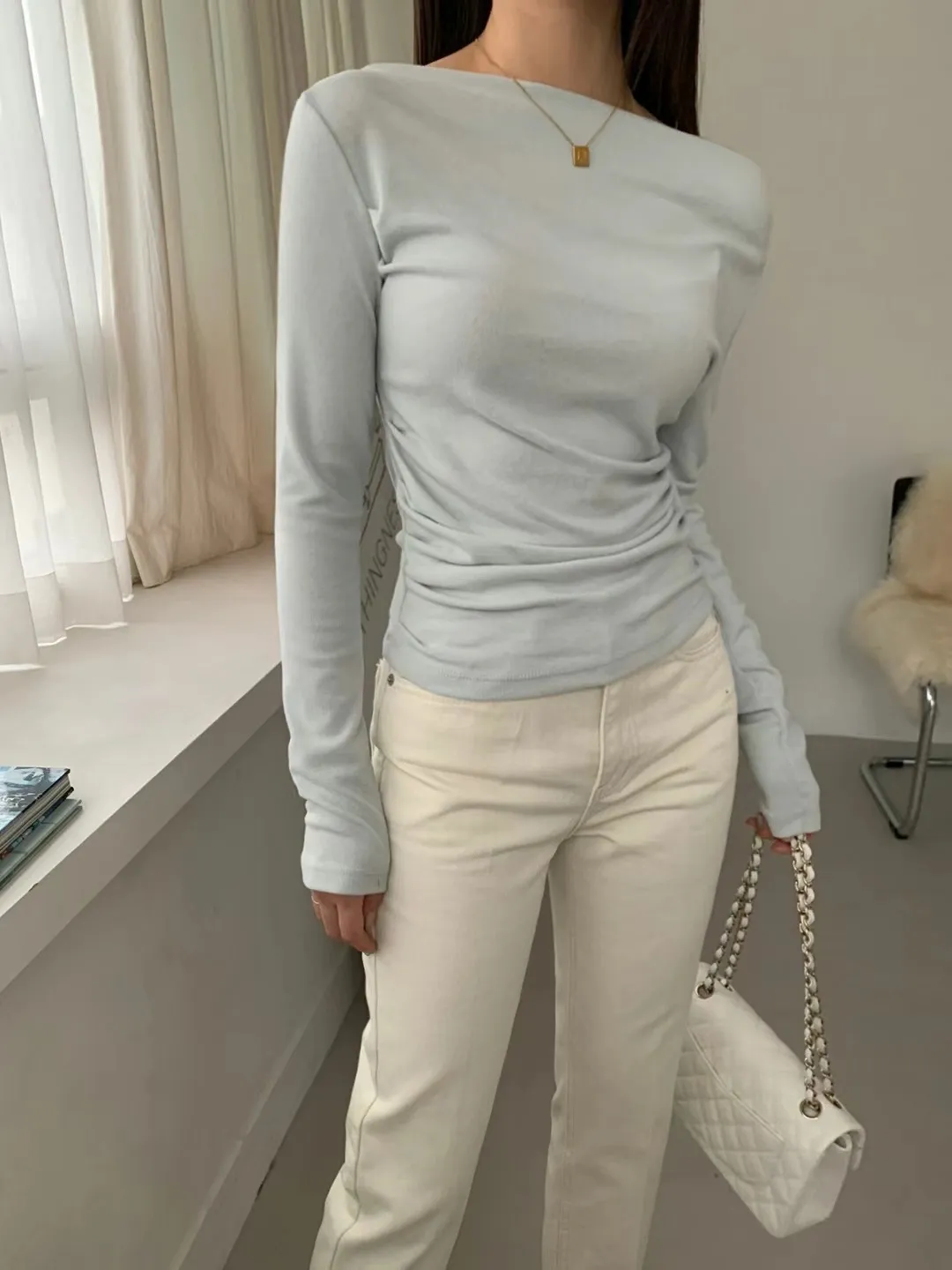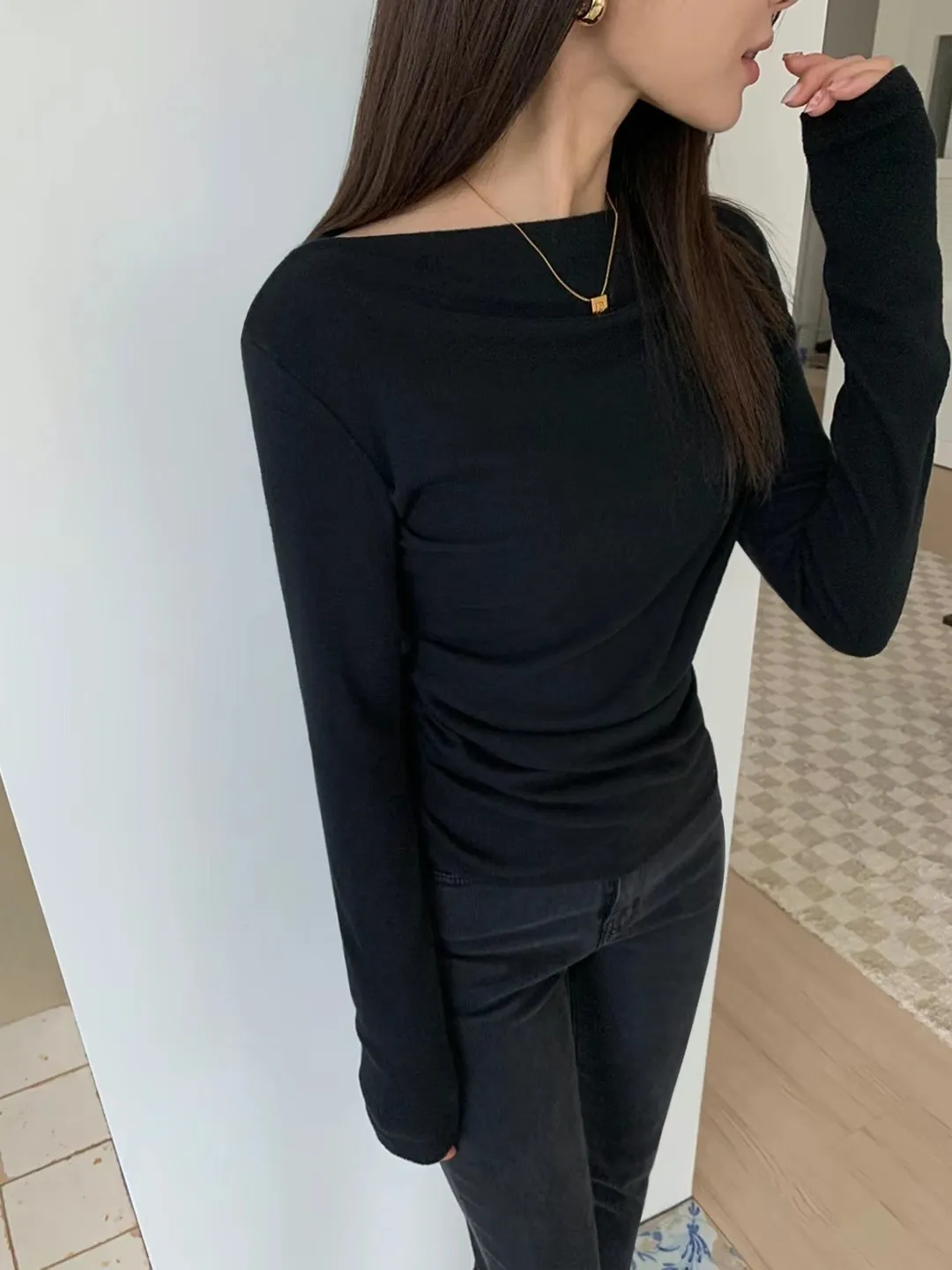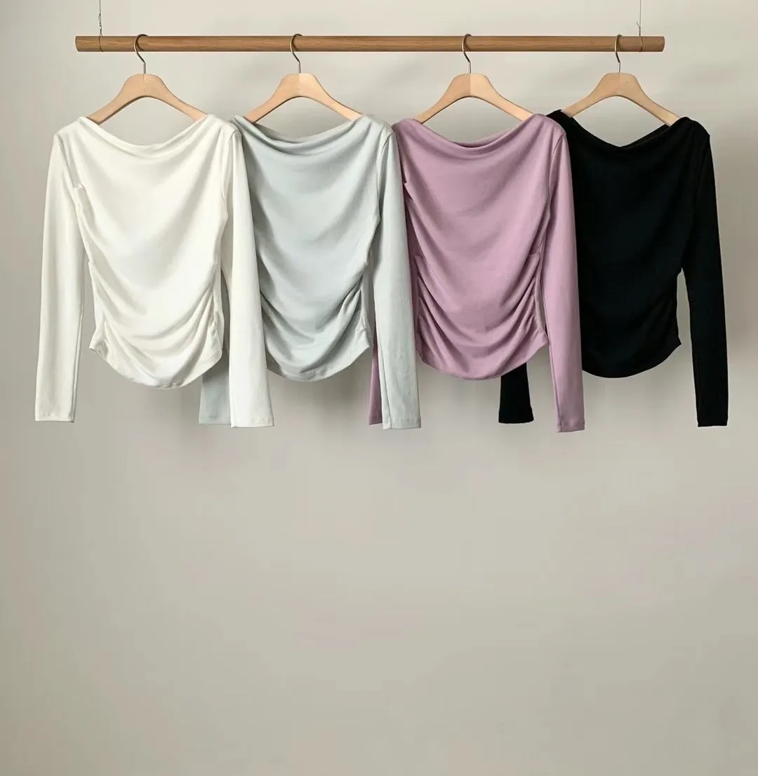 設計師款小性感一字領抓腰合身長袖T Q彈棉柔