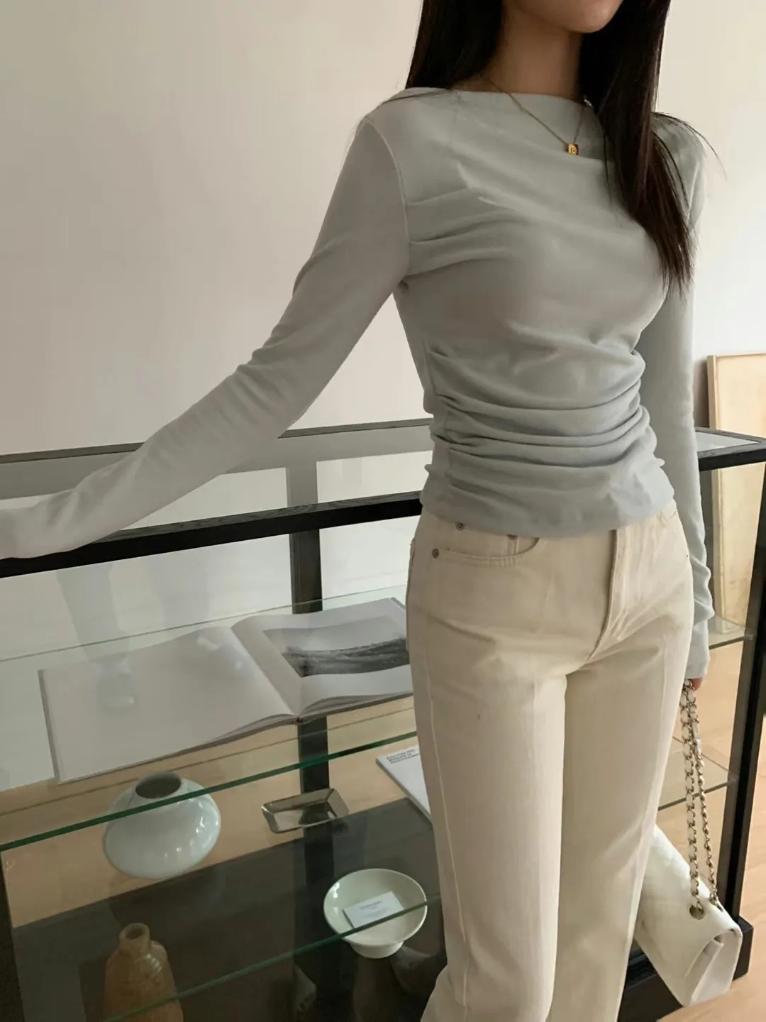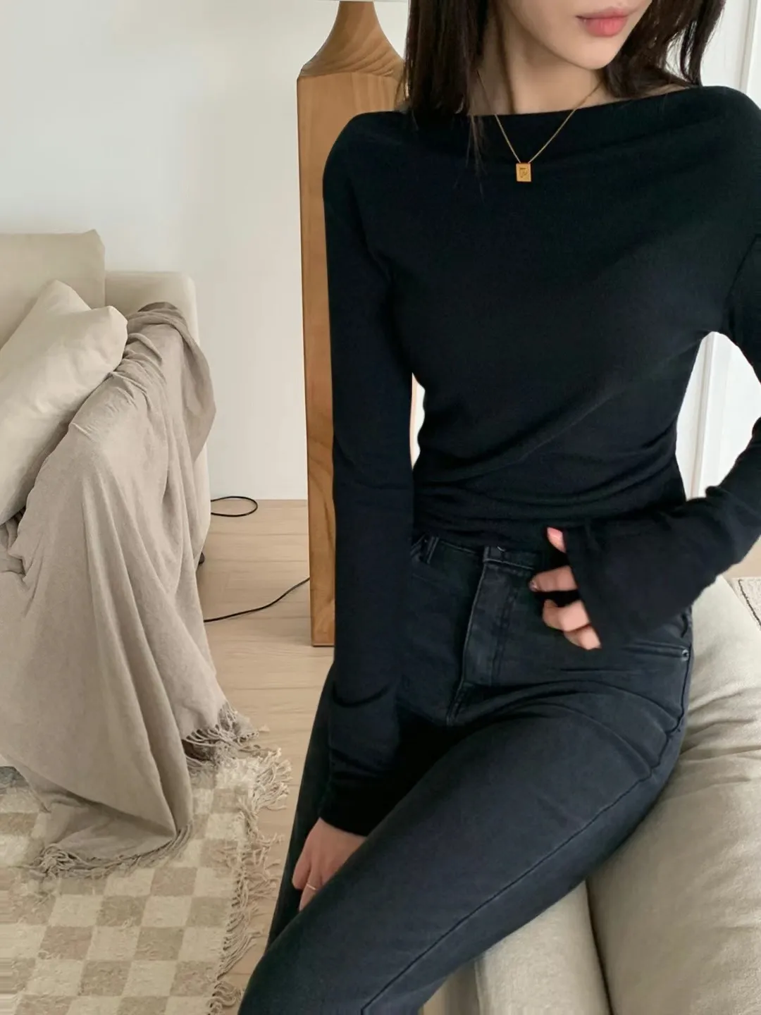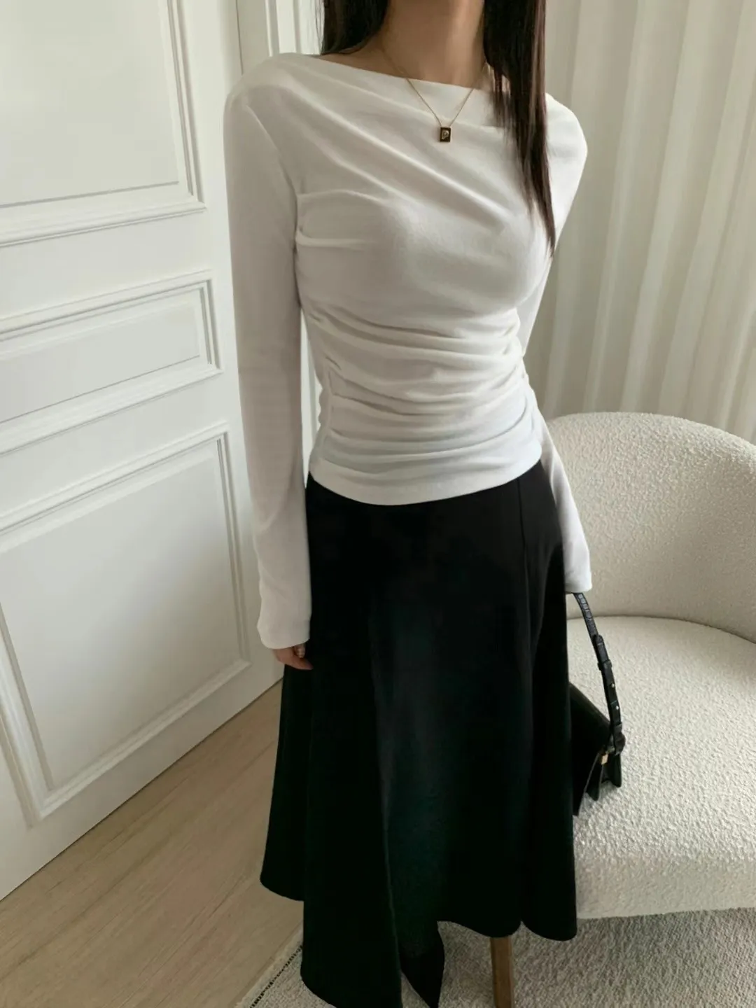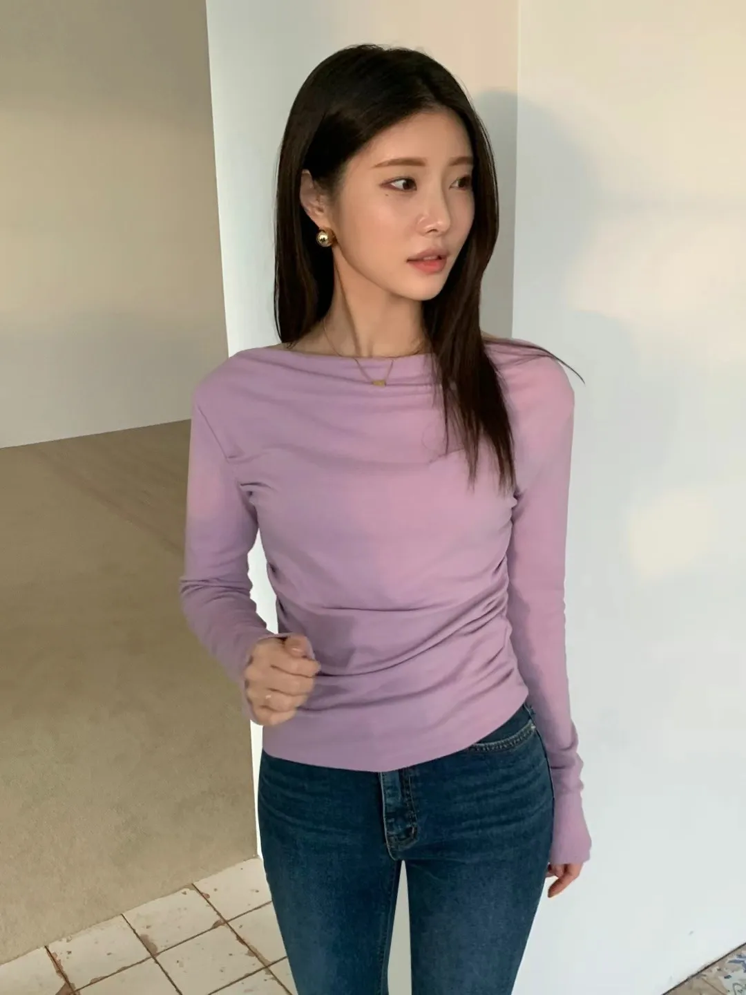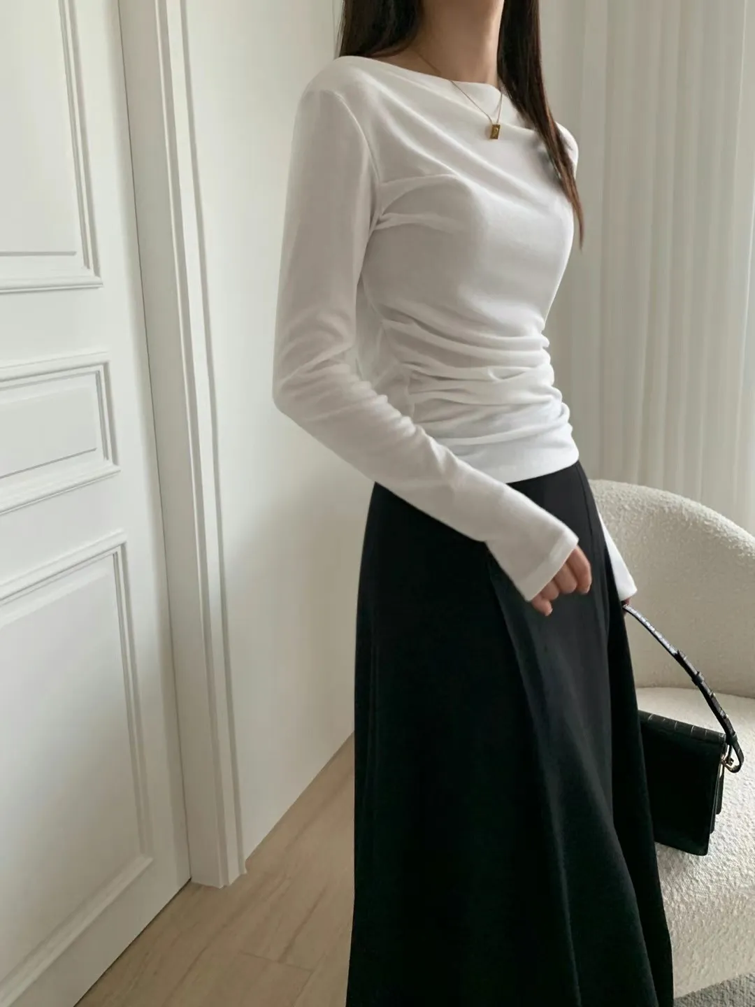 設計師款小性感一字領抓腰合身長袖T Q彈棉柔