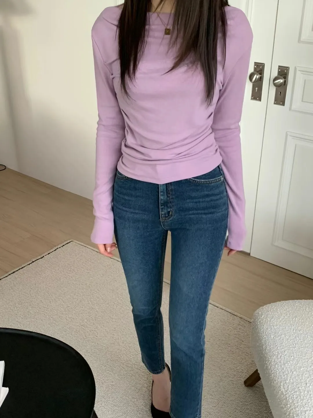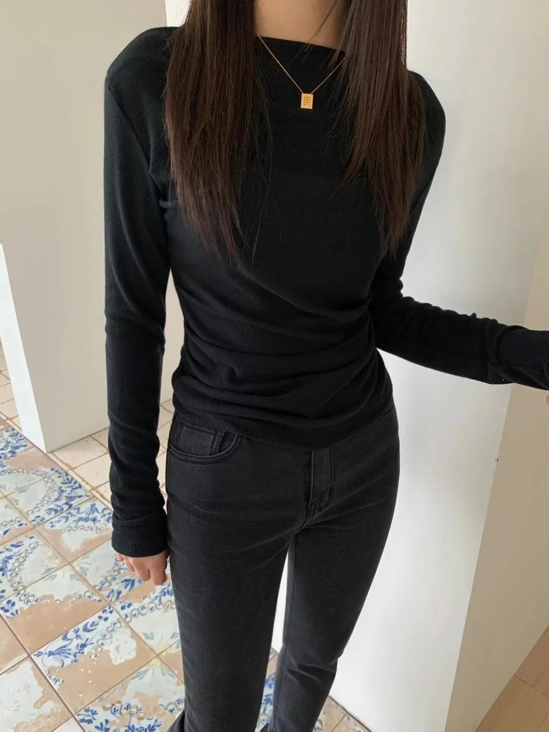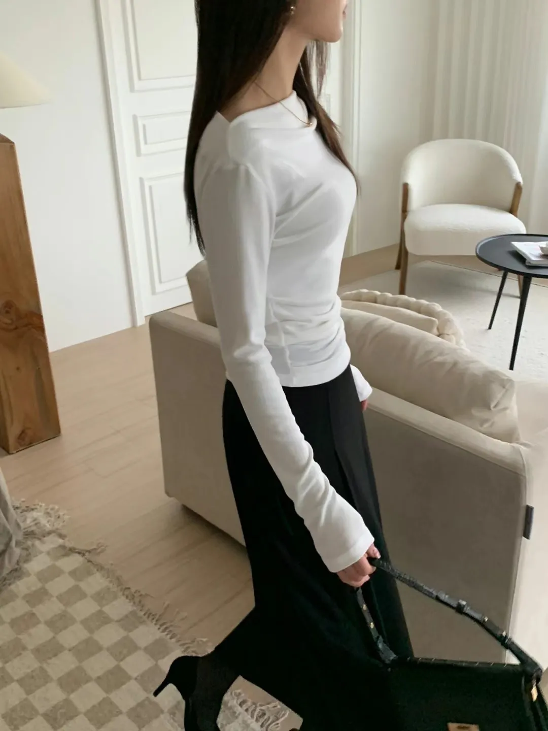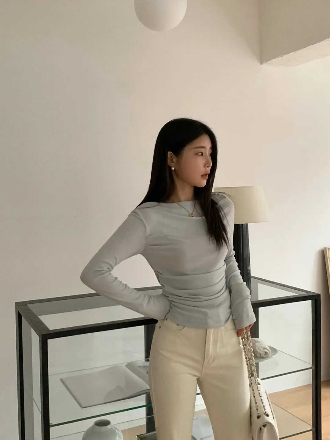 設計師款小性感一字領抓腰合身長袖T Q彈棉柔