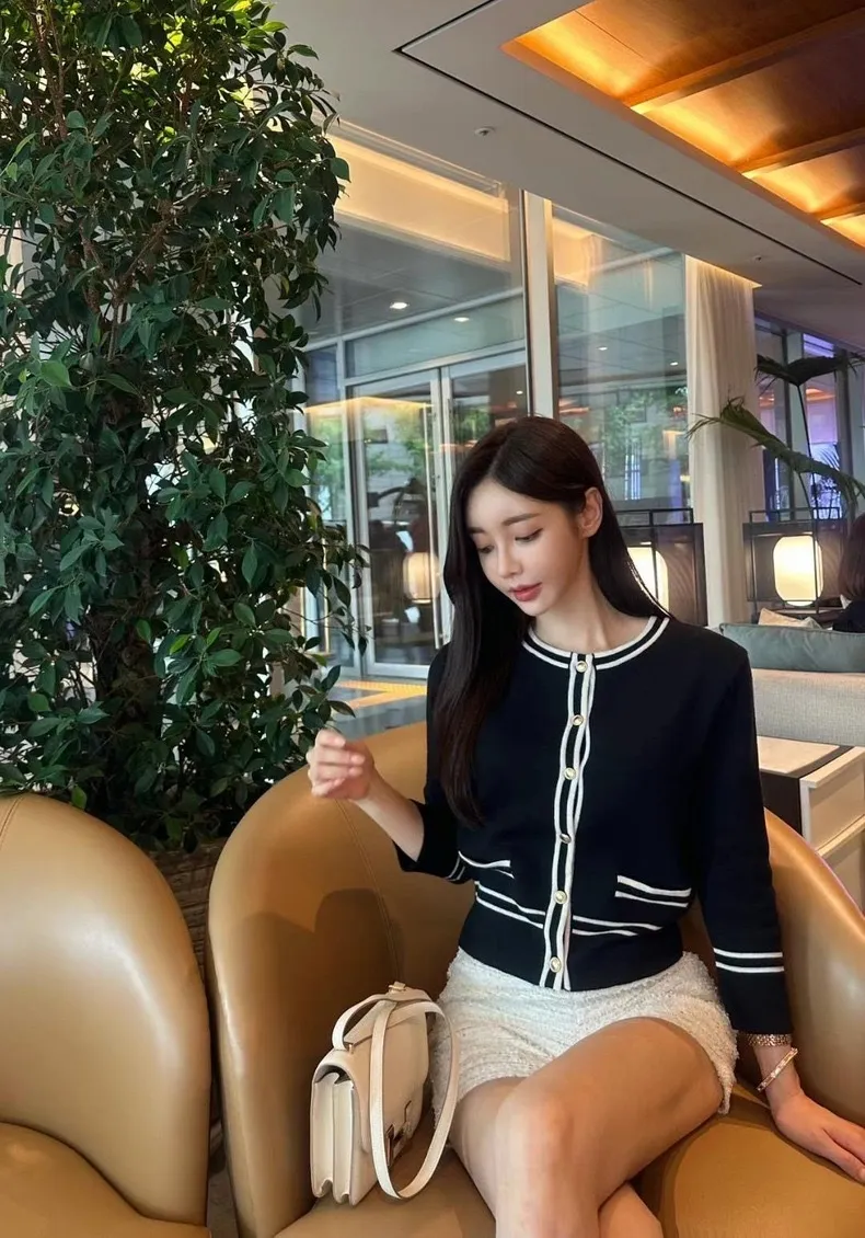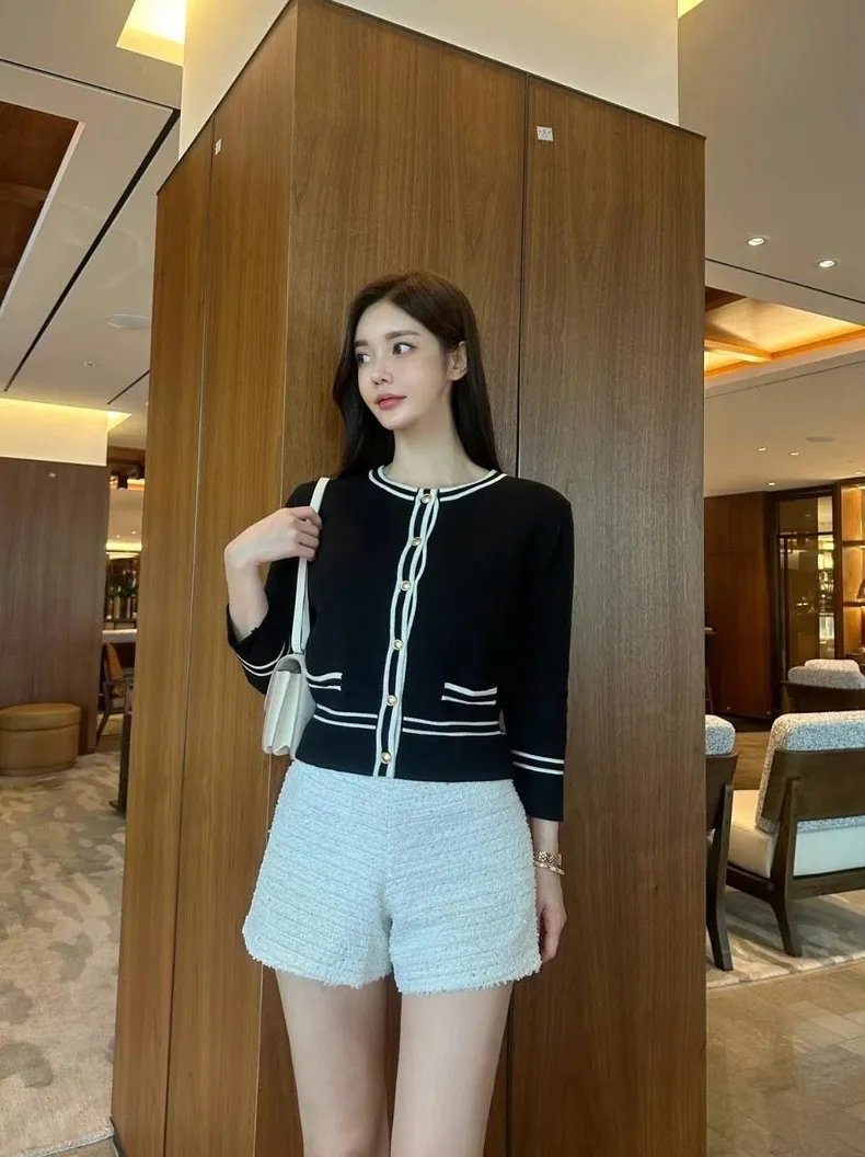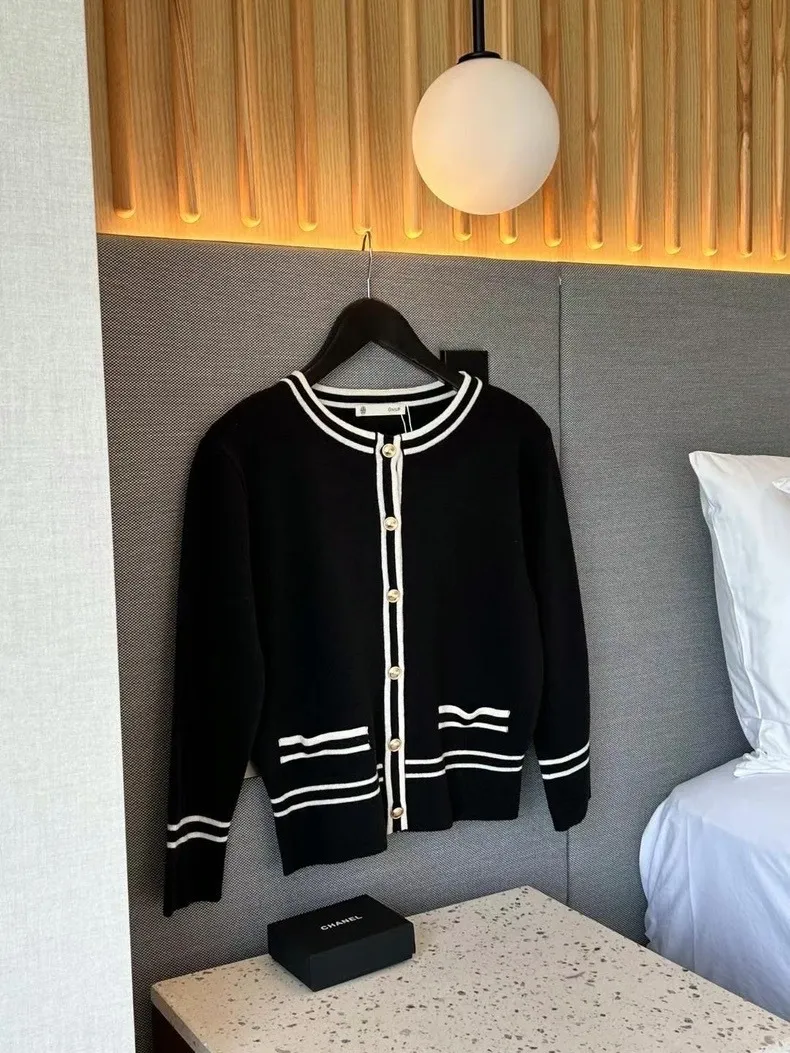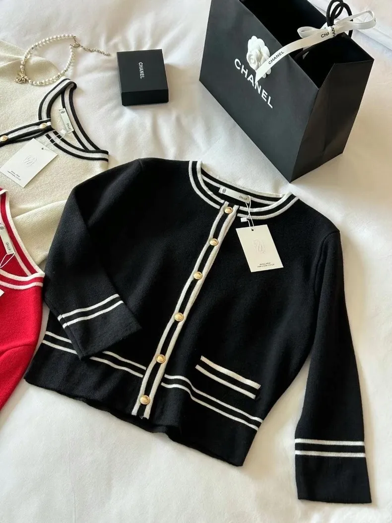 設計師品牌 小香風拼色鑲邊圓領小金釦羊毛針織衫