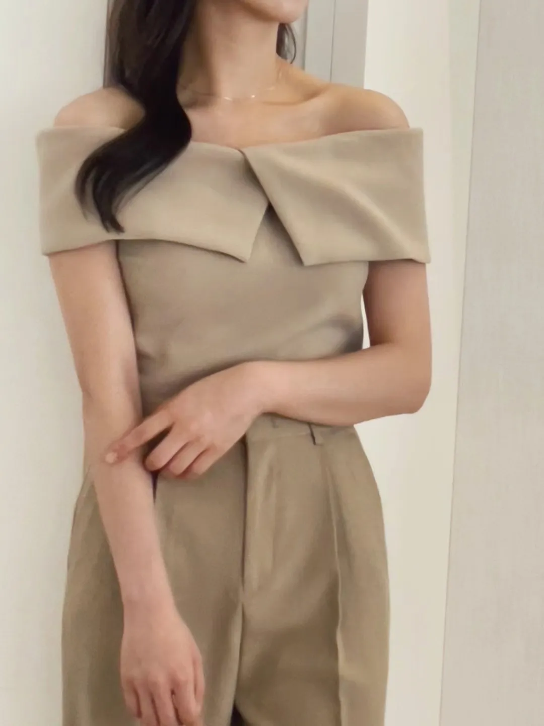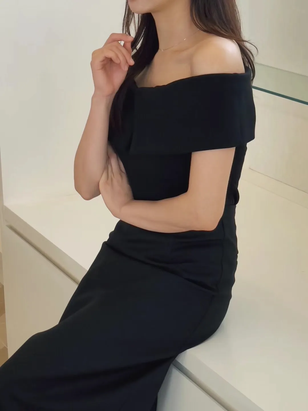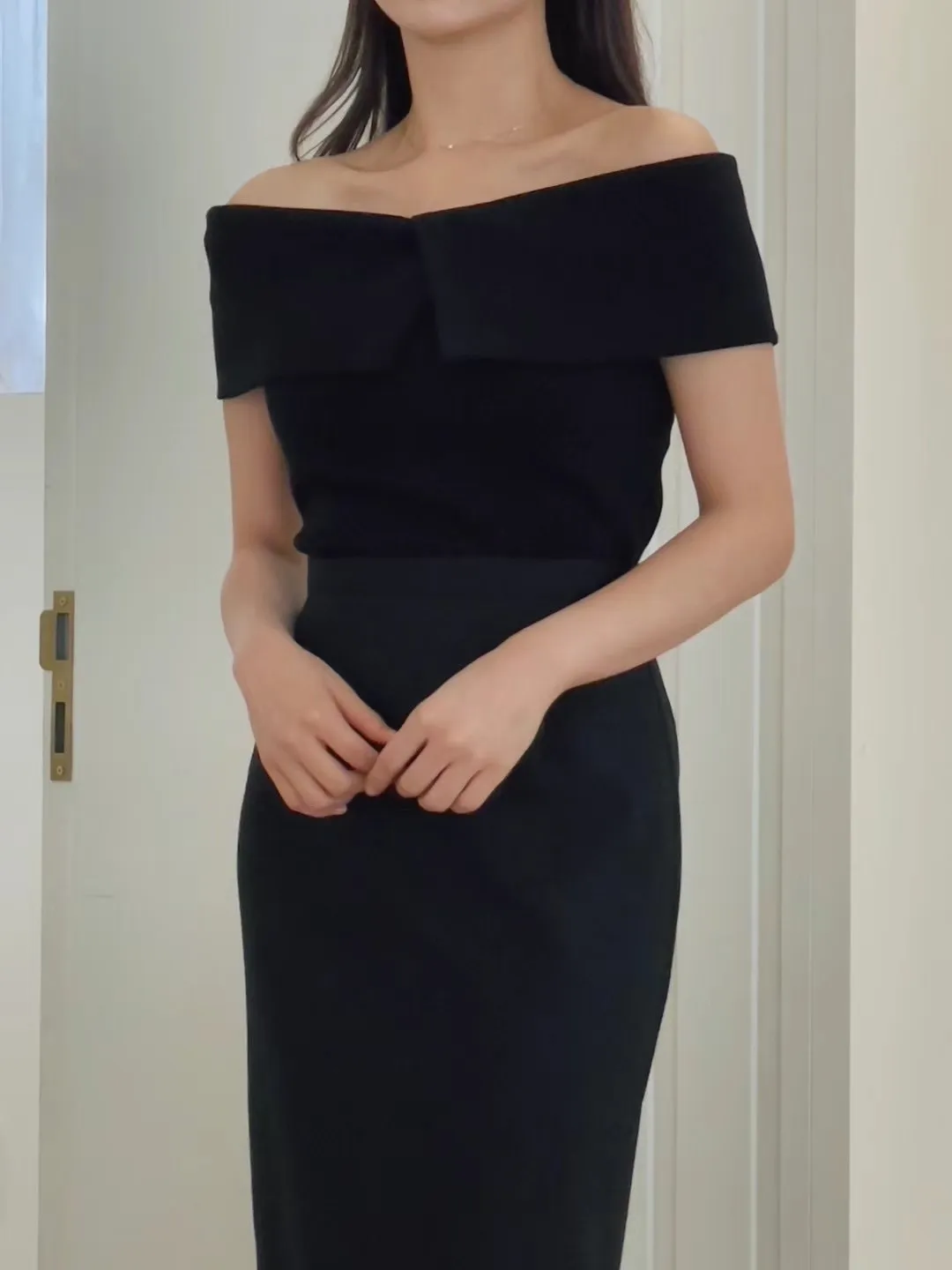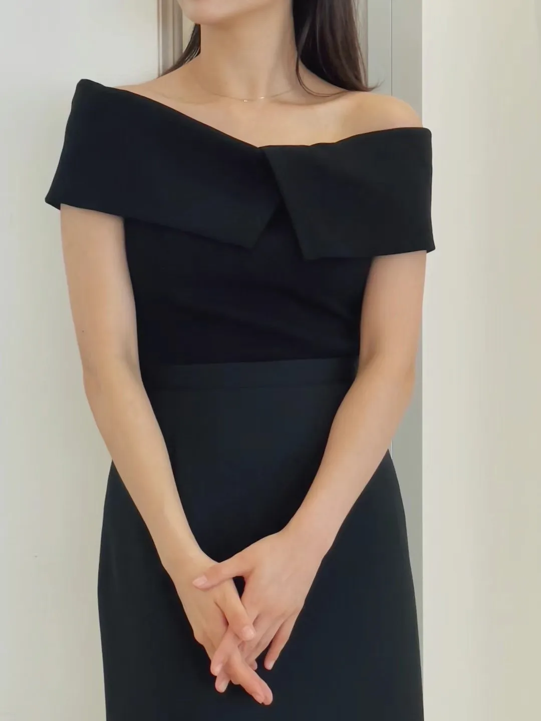 高端設計師品牌 秋款一字領開衩露肩上衣