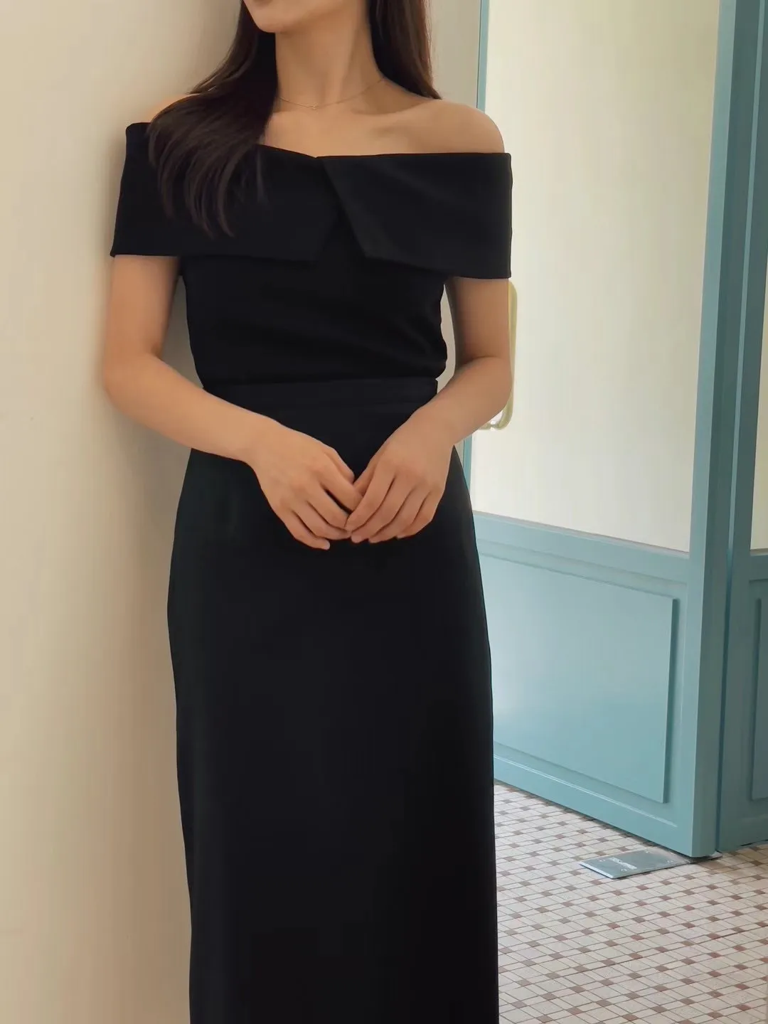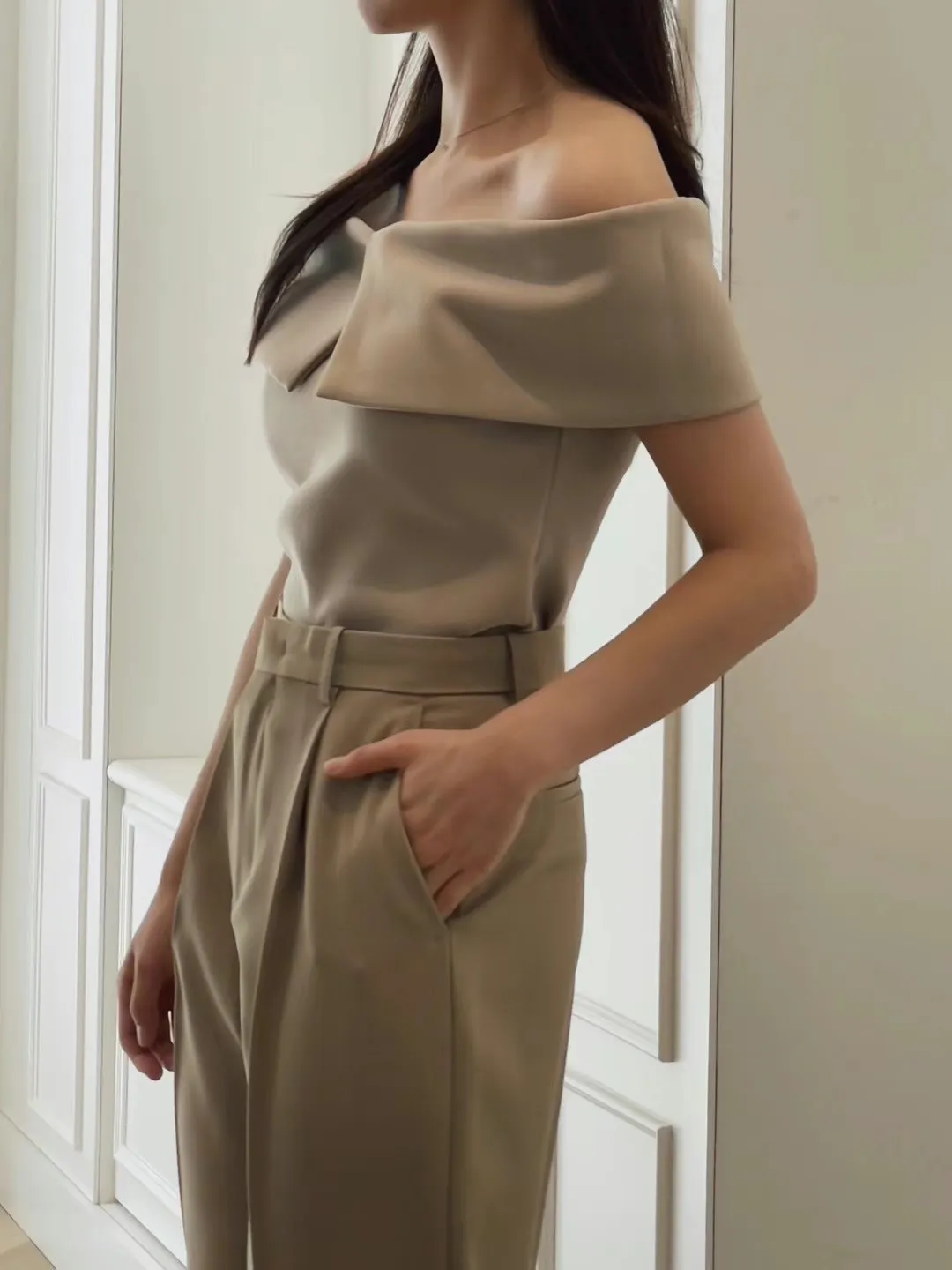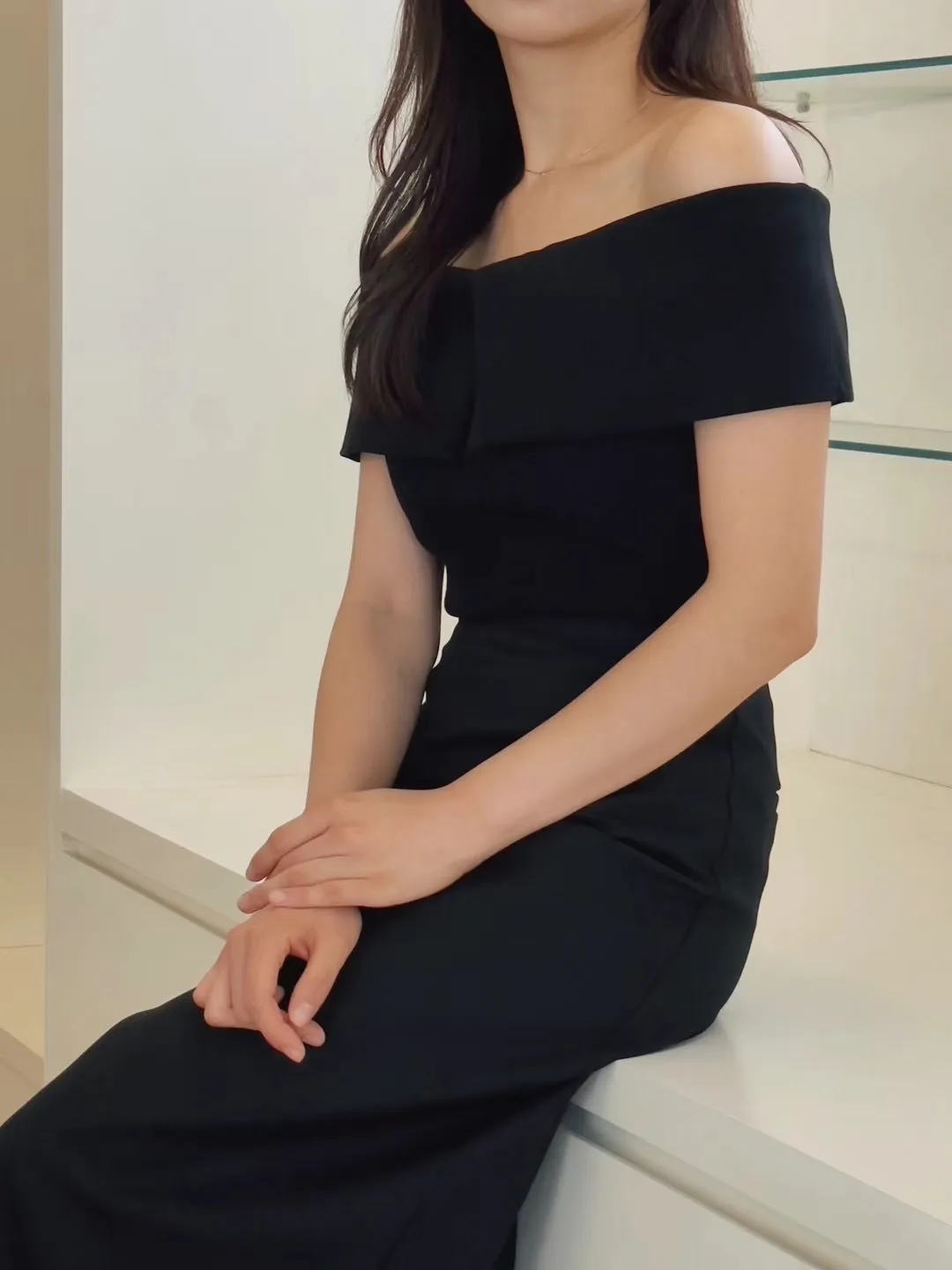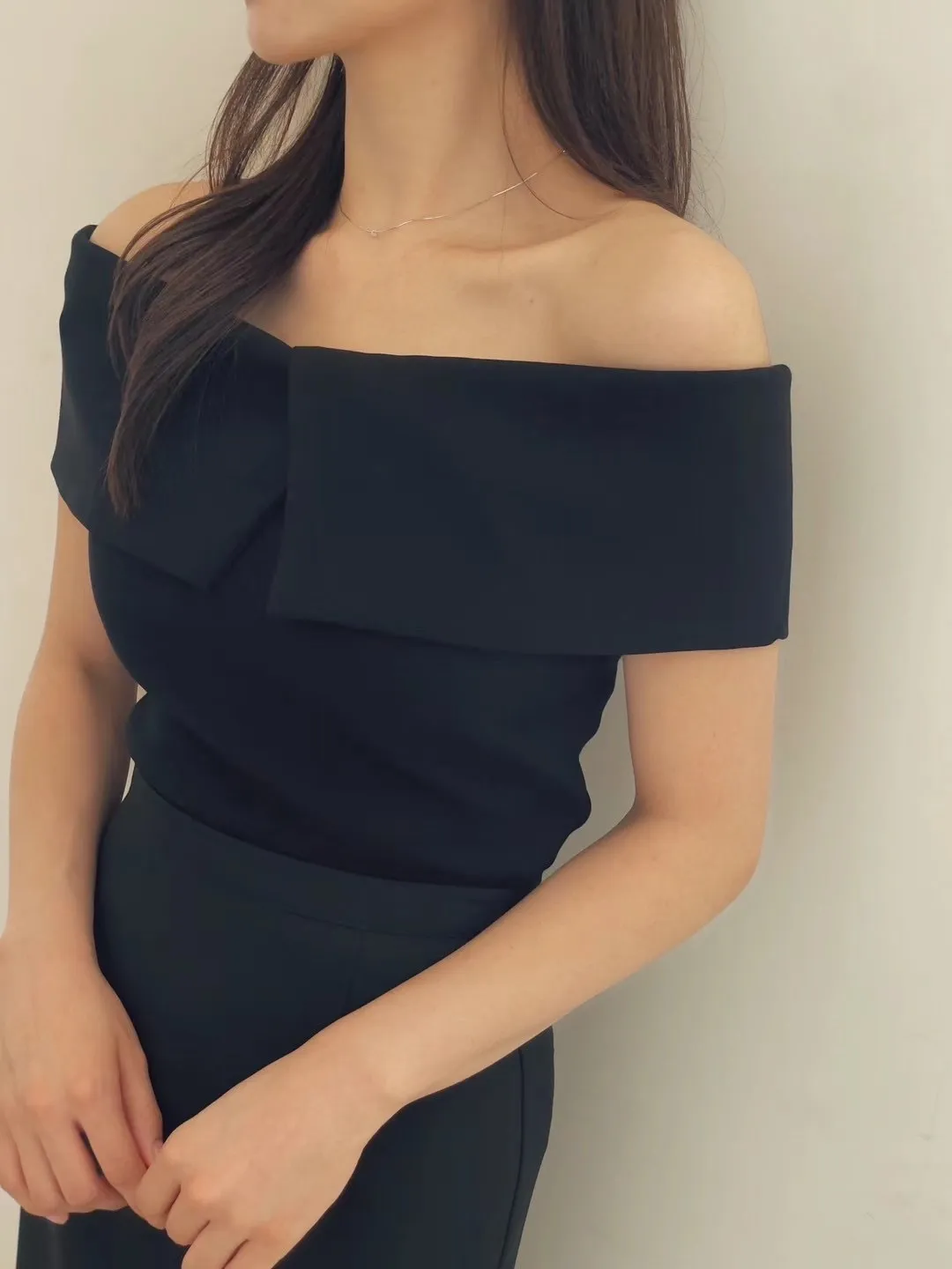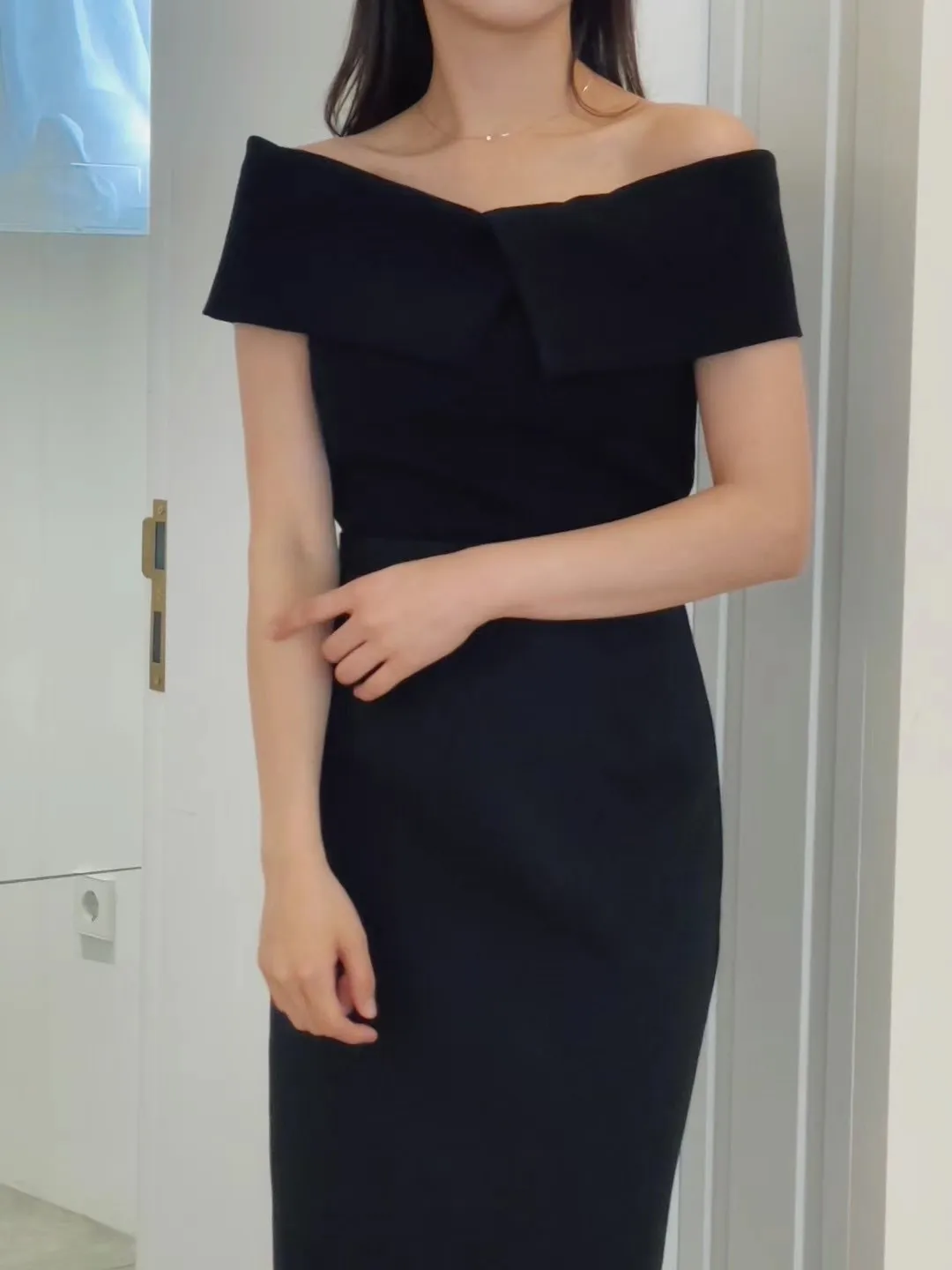 高端設計師品牌 秋款一字領開衩露肩上衣