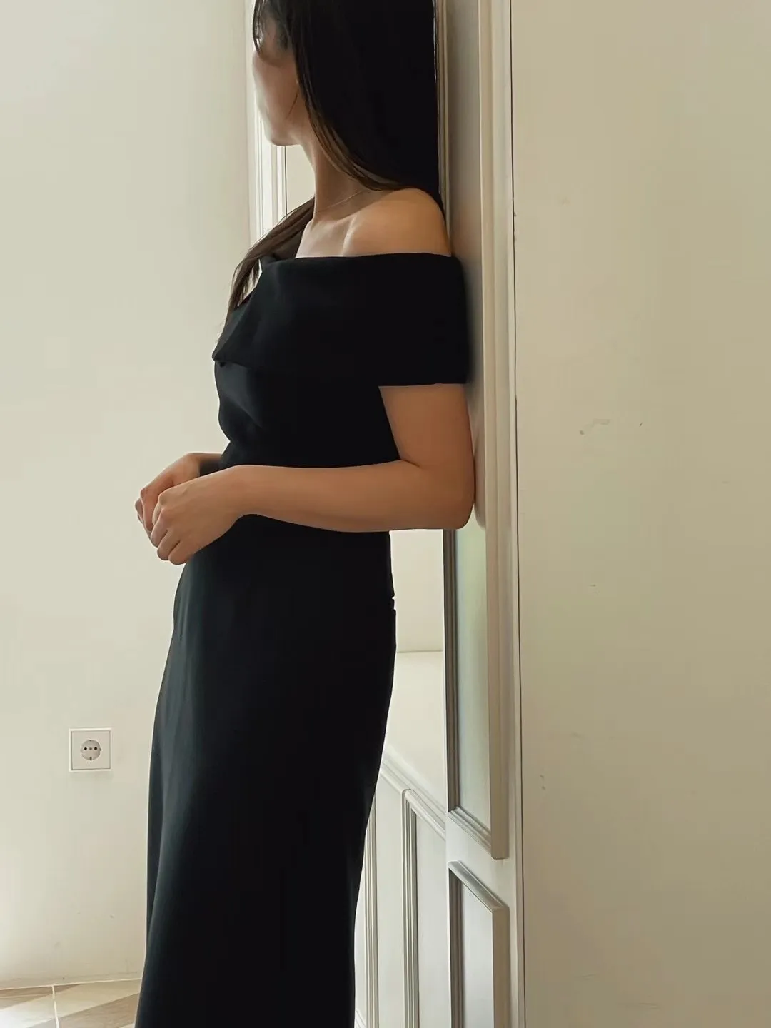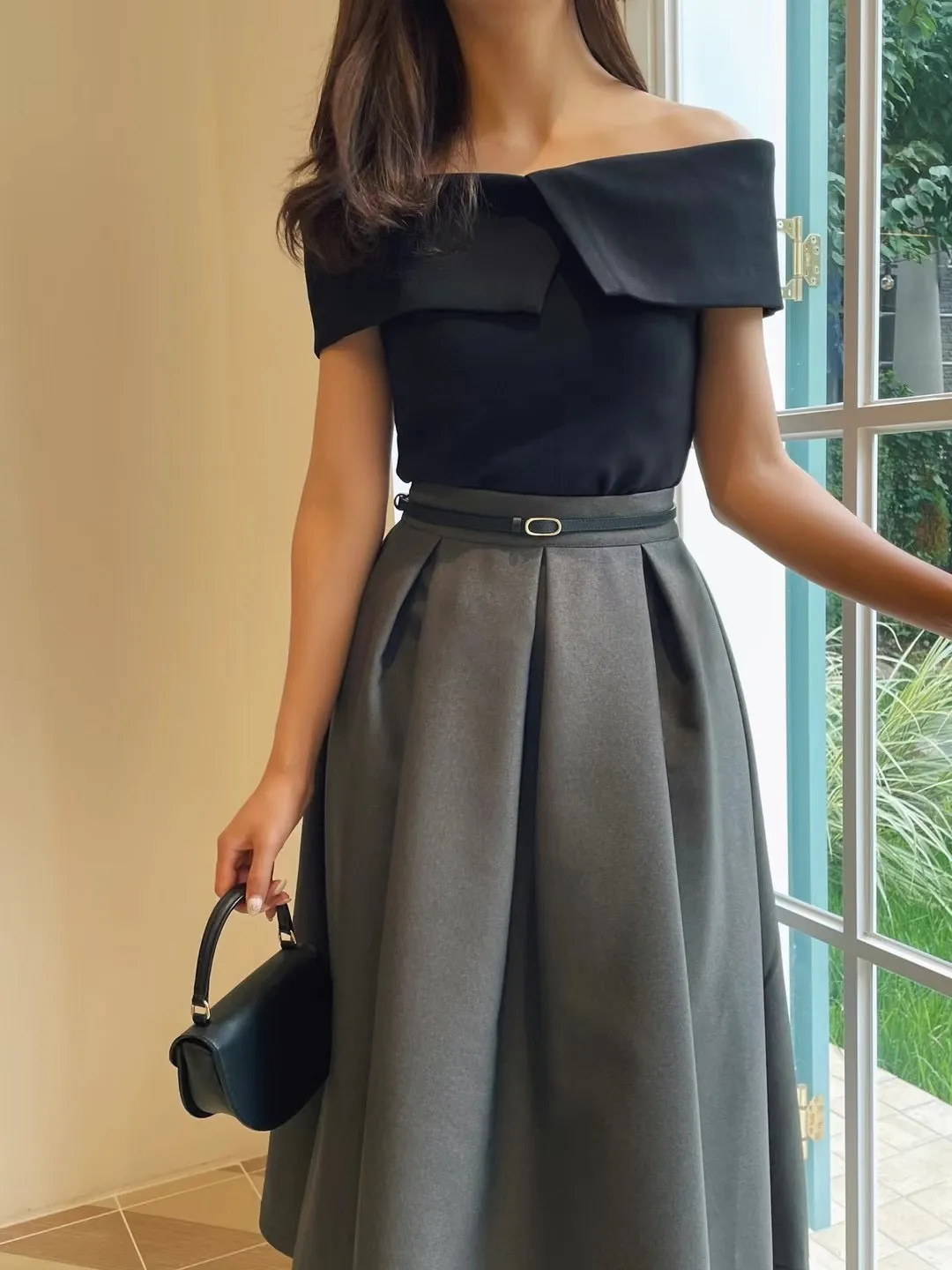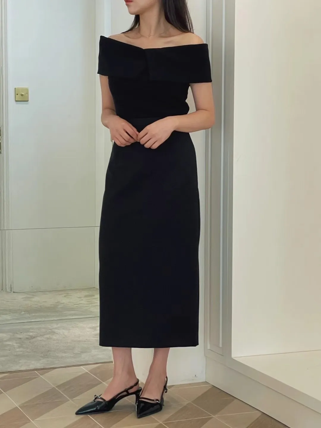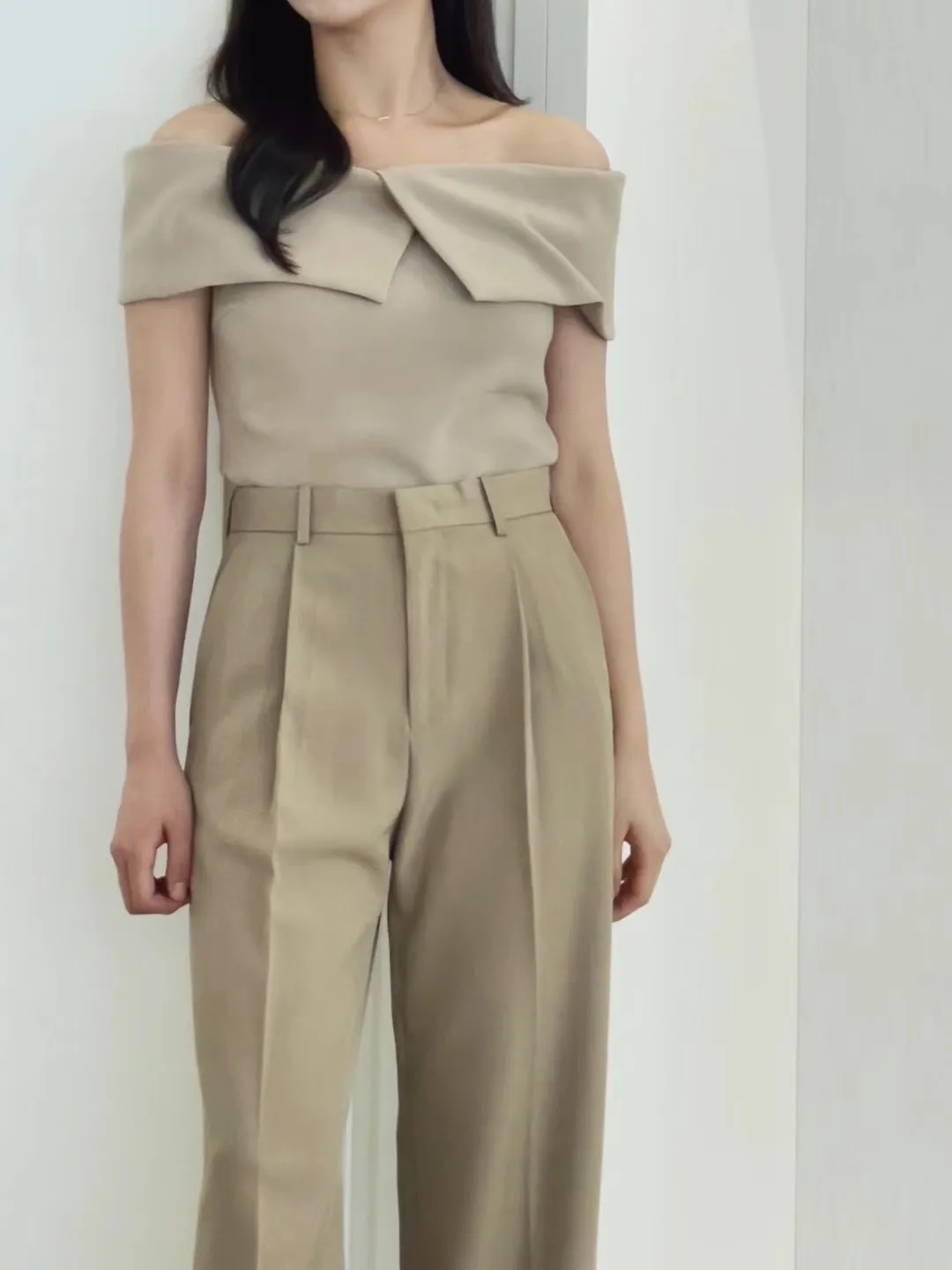 高端設計師品牌 秋款一字領開衩露肩上衣
