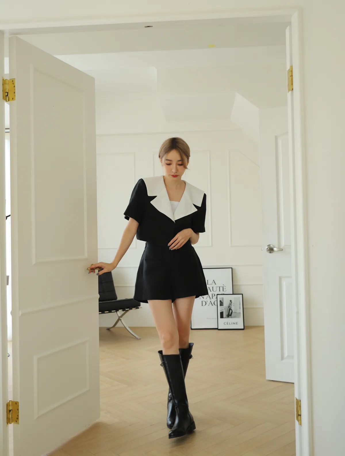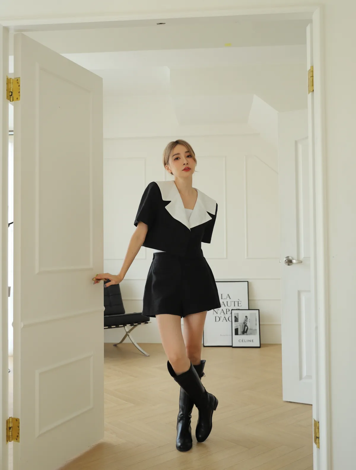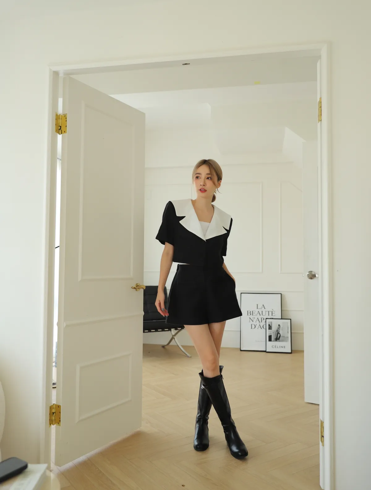 小香風翻領撞色短袖外套➕鬆緊短褲 一套set