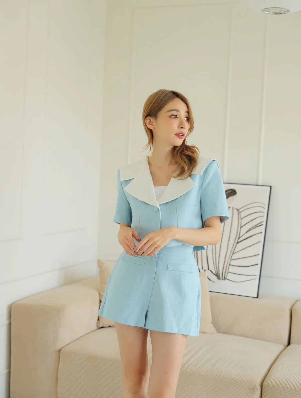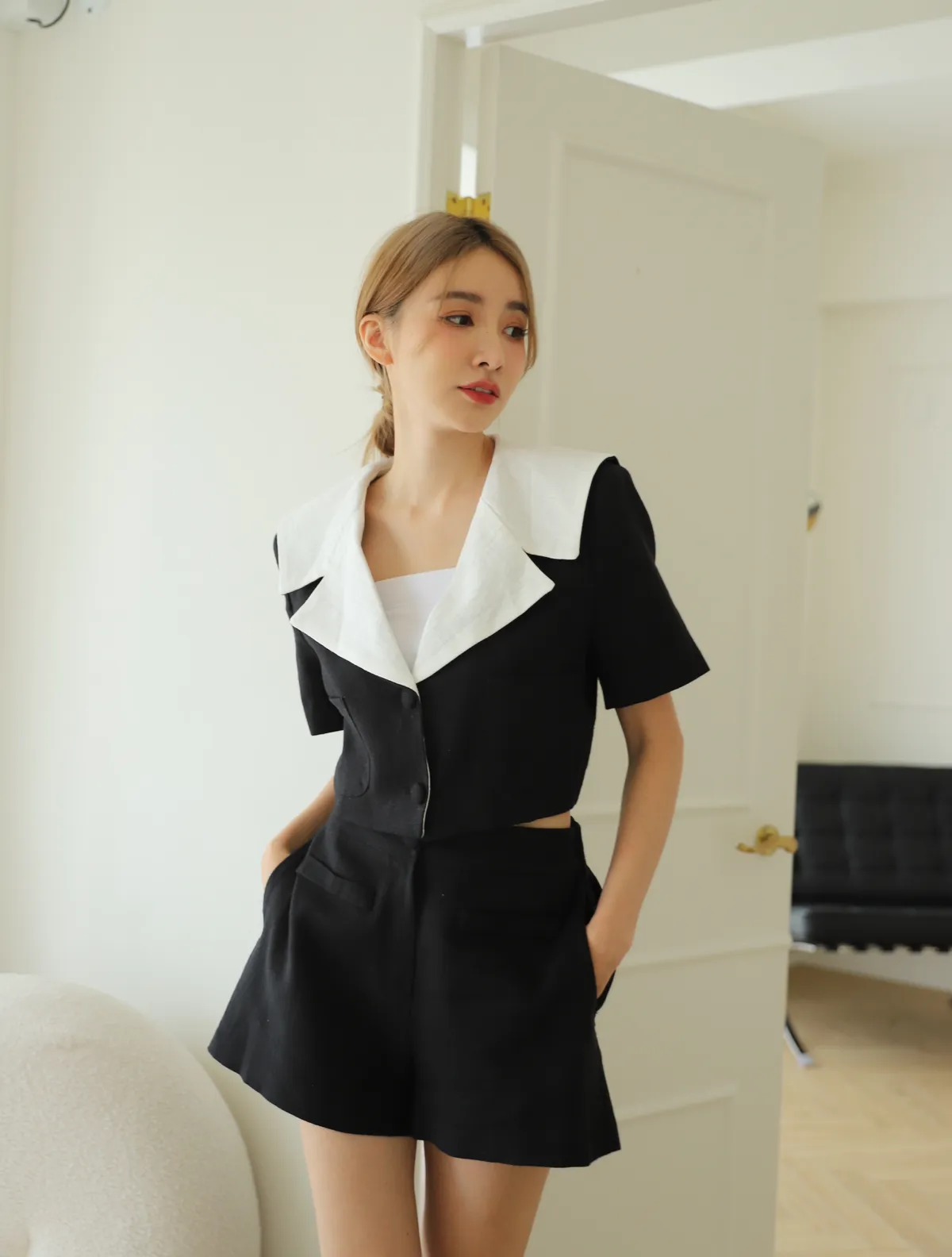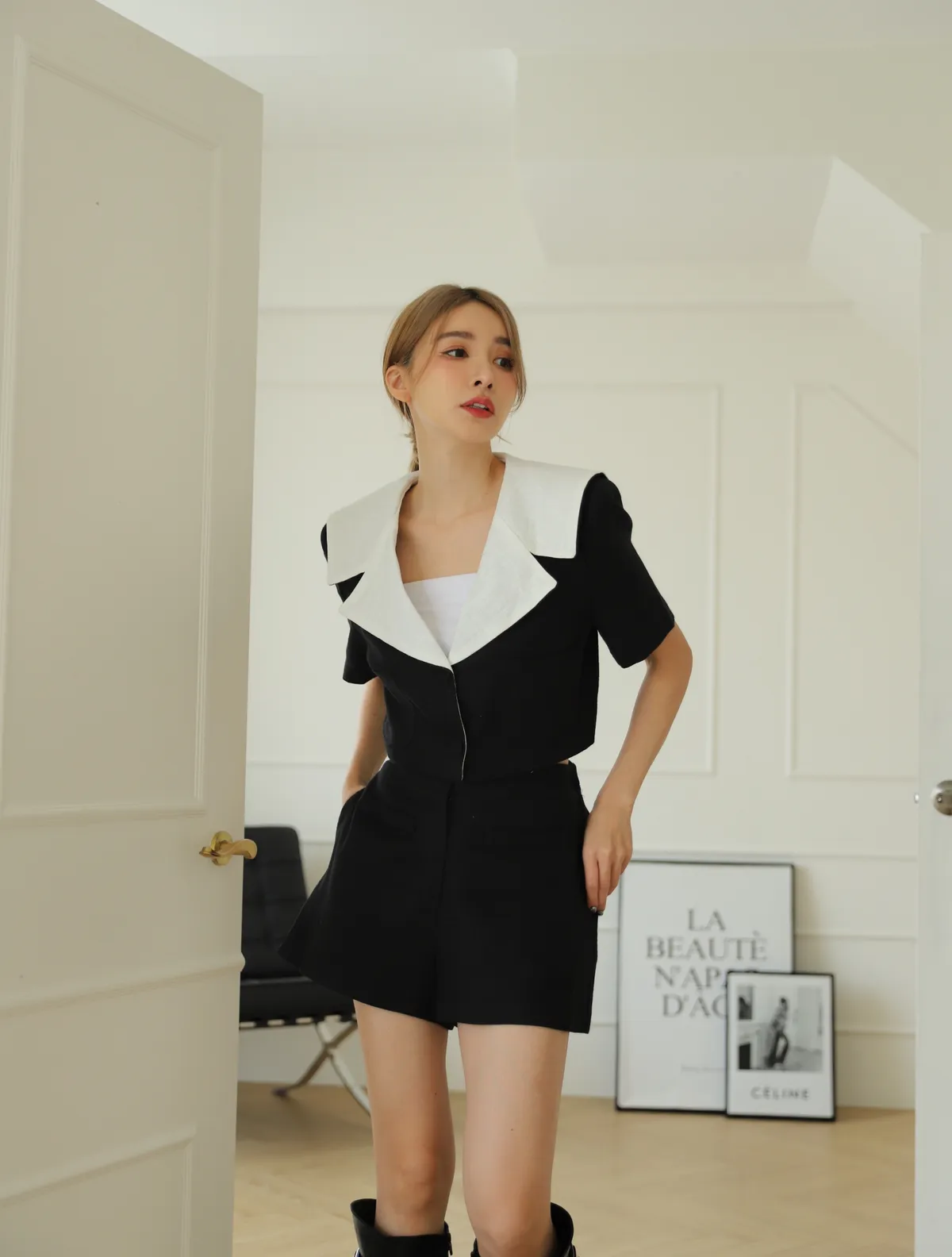 小香風翻領撞色短袖外套➕鬆緊短褲 一套set