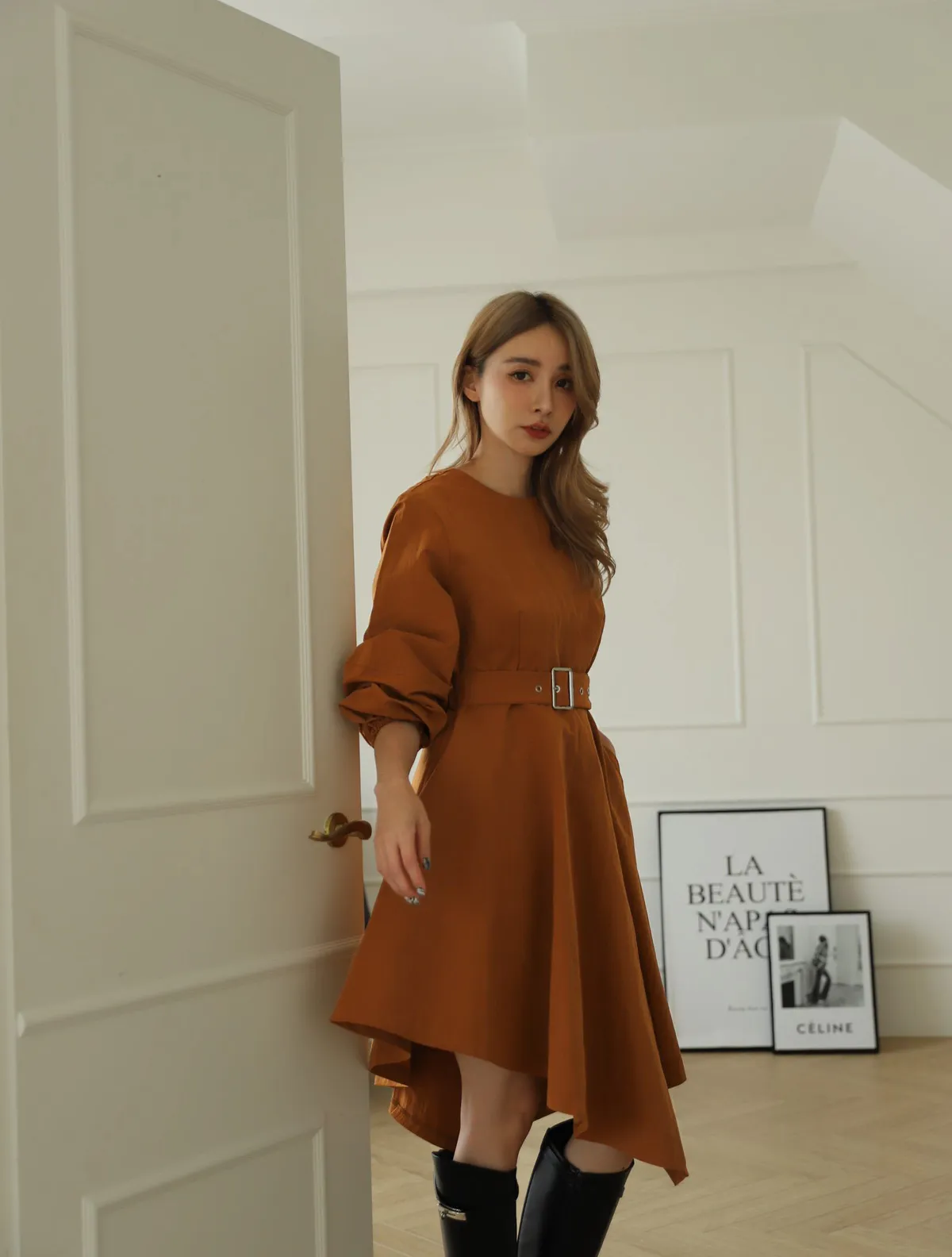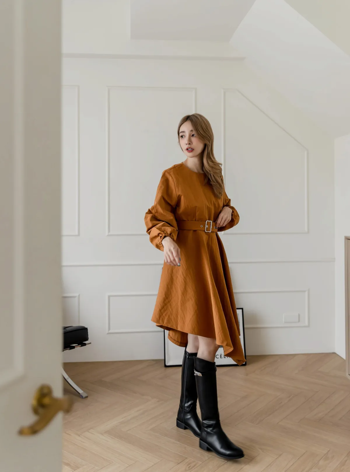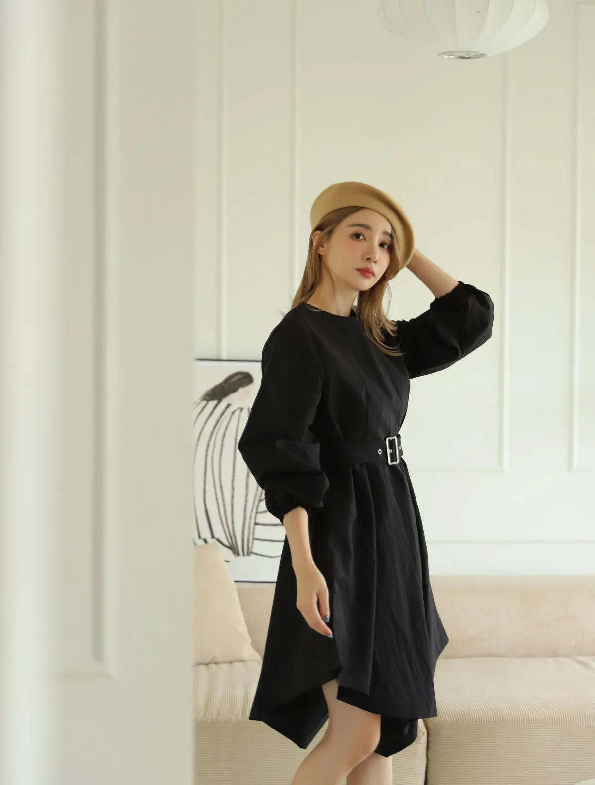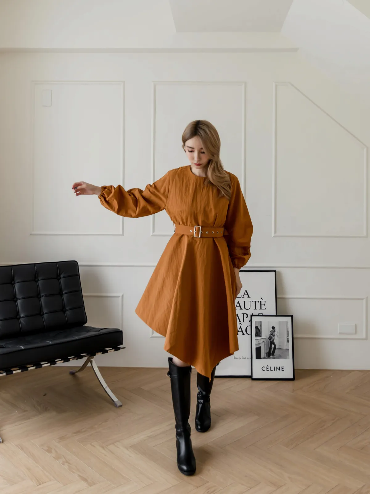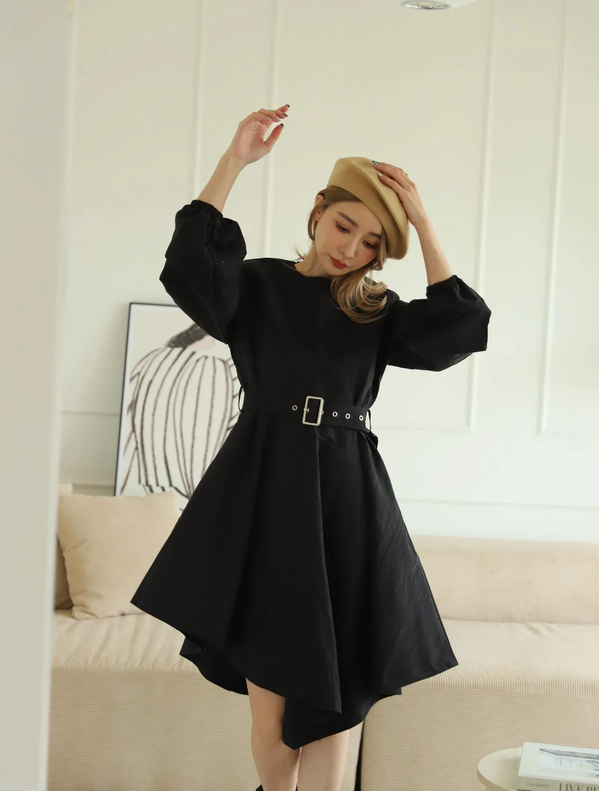 設計師款長袖腰帶不規則下擺連衣裙