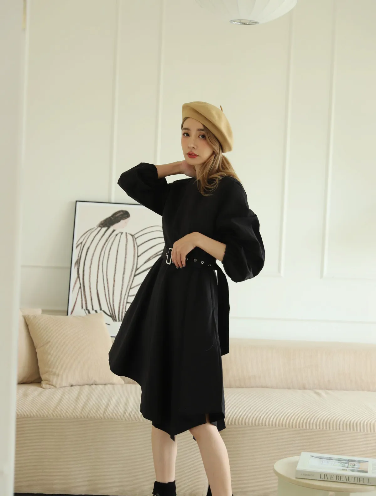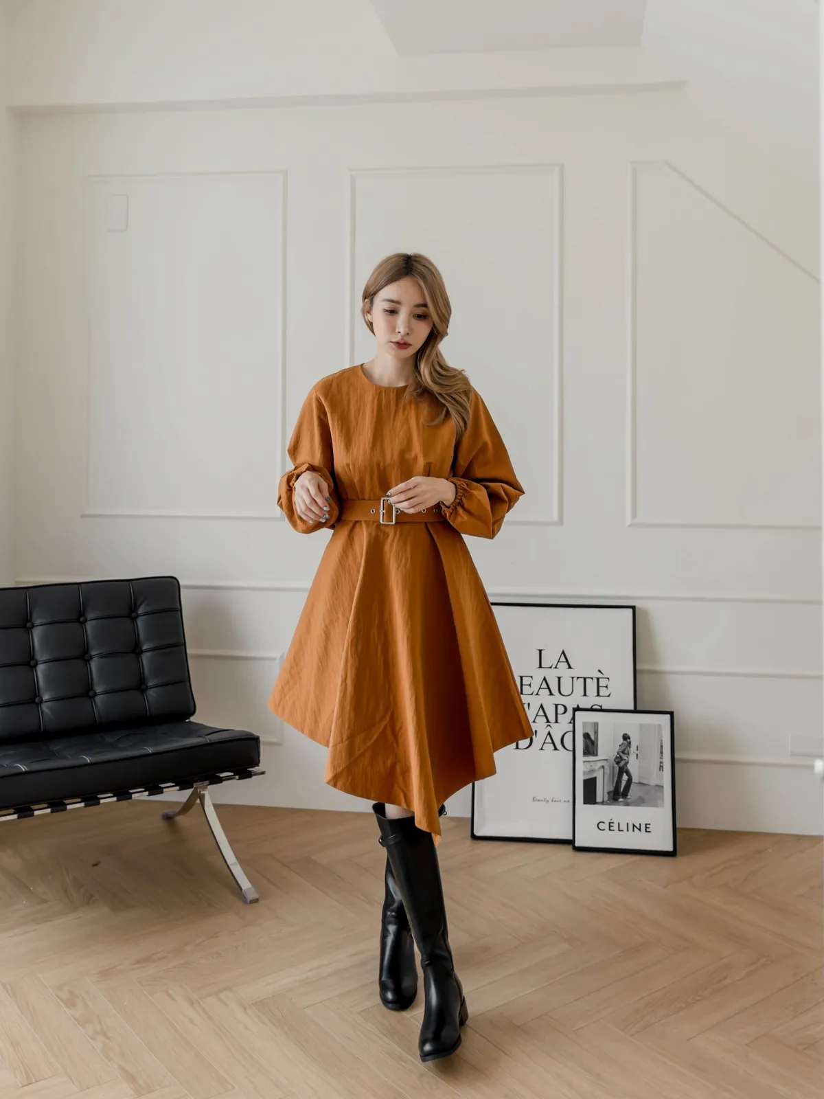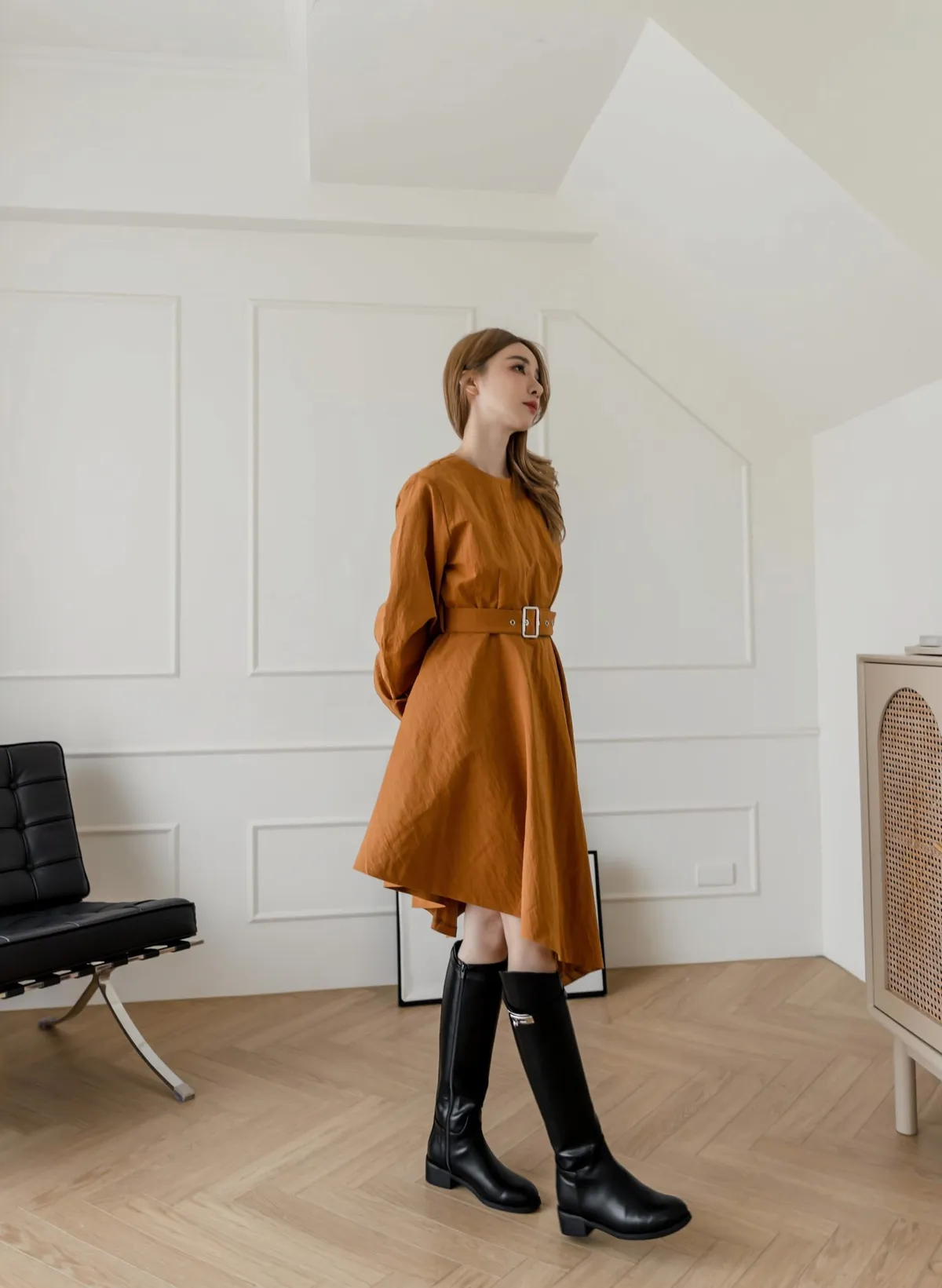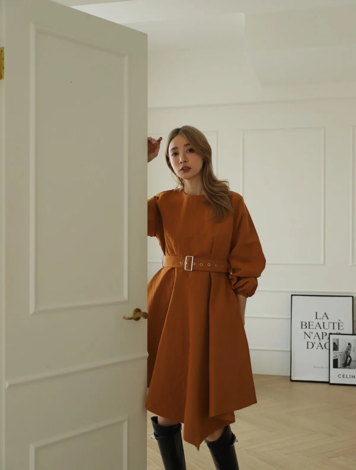 設計師款長袖腰帶不規則下擺連衣裙