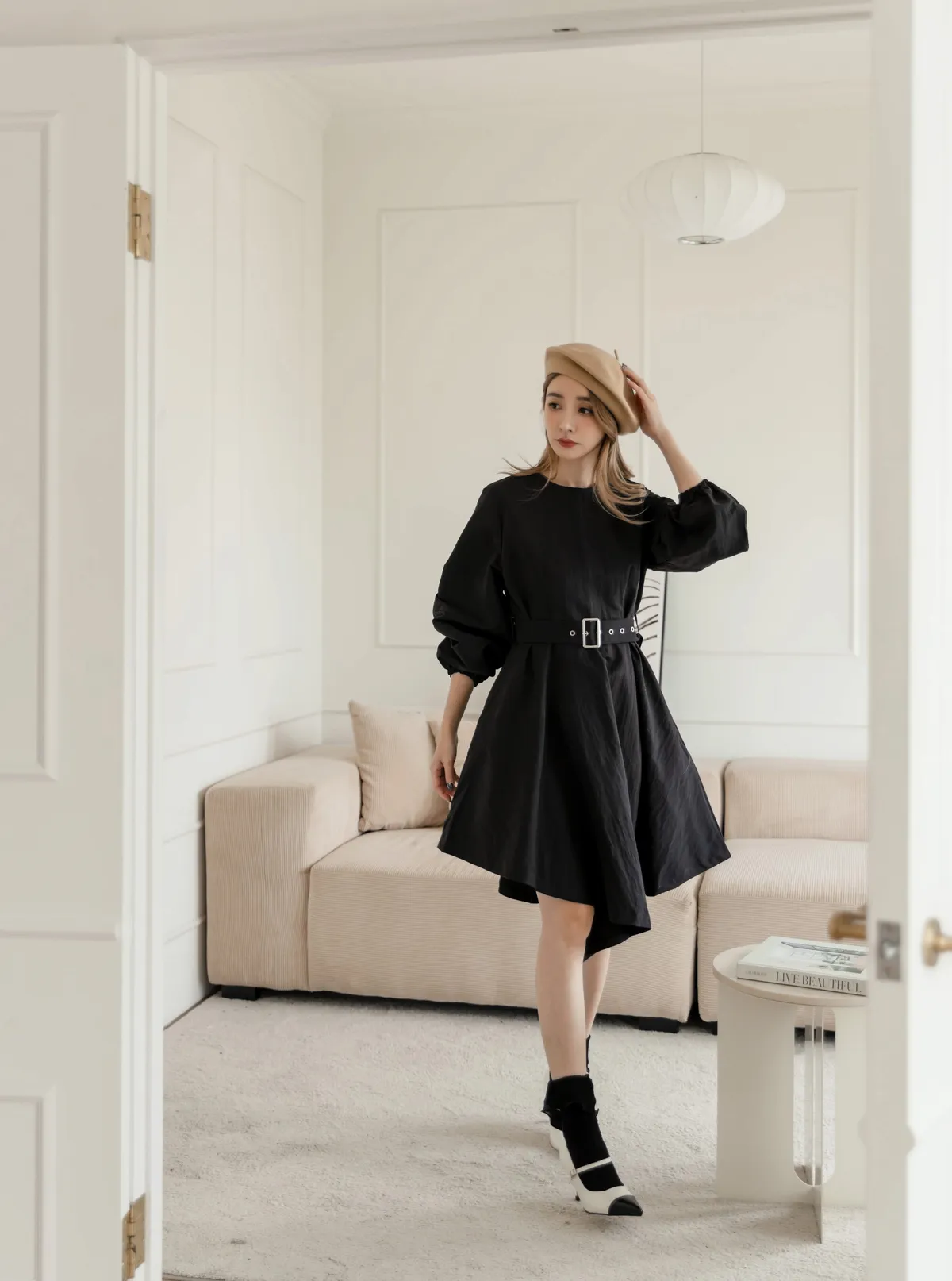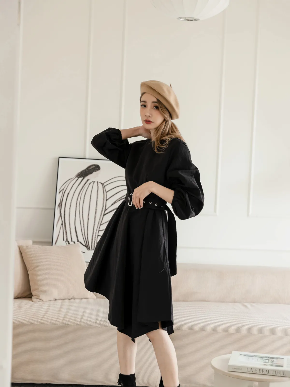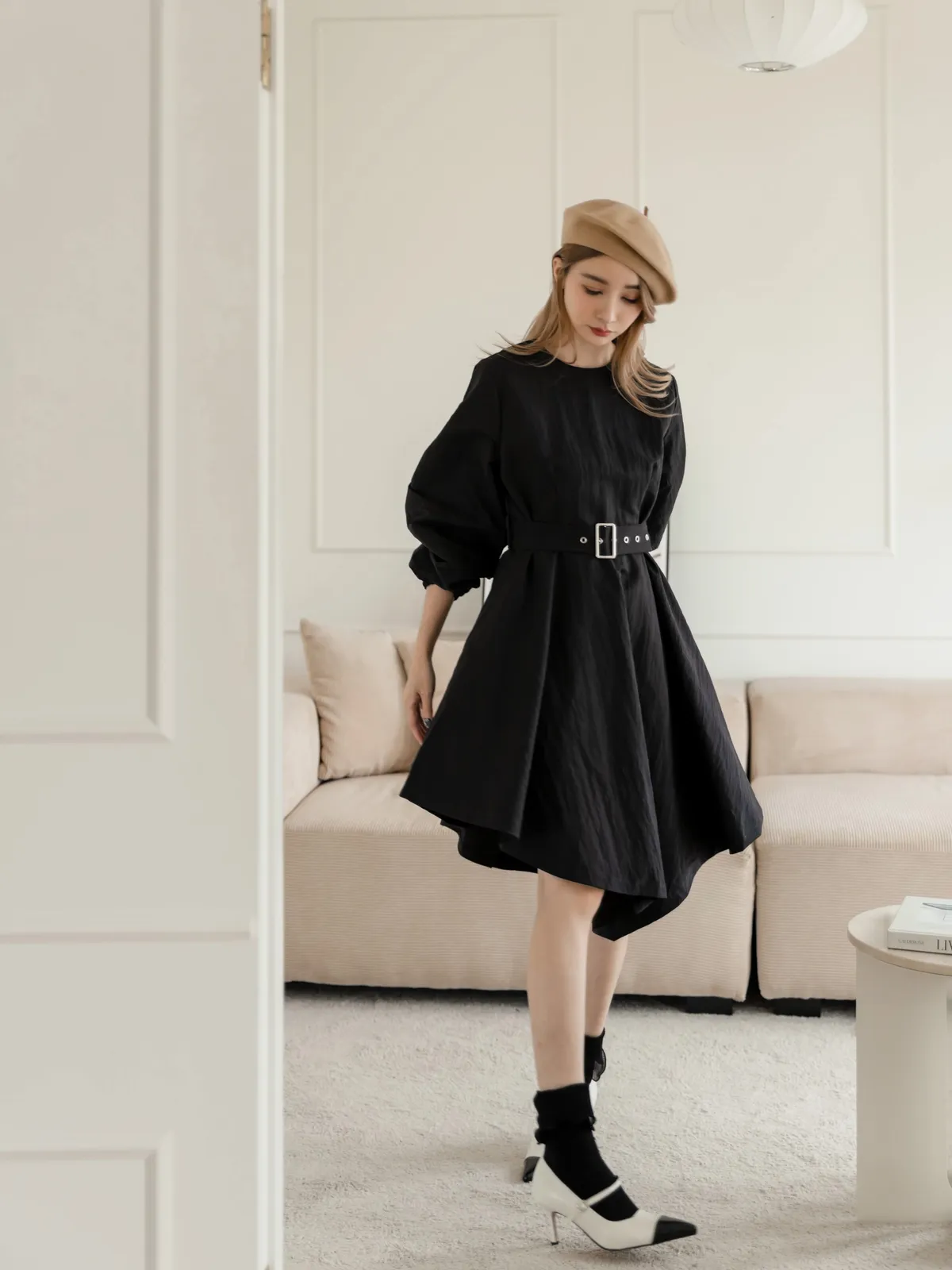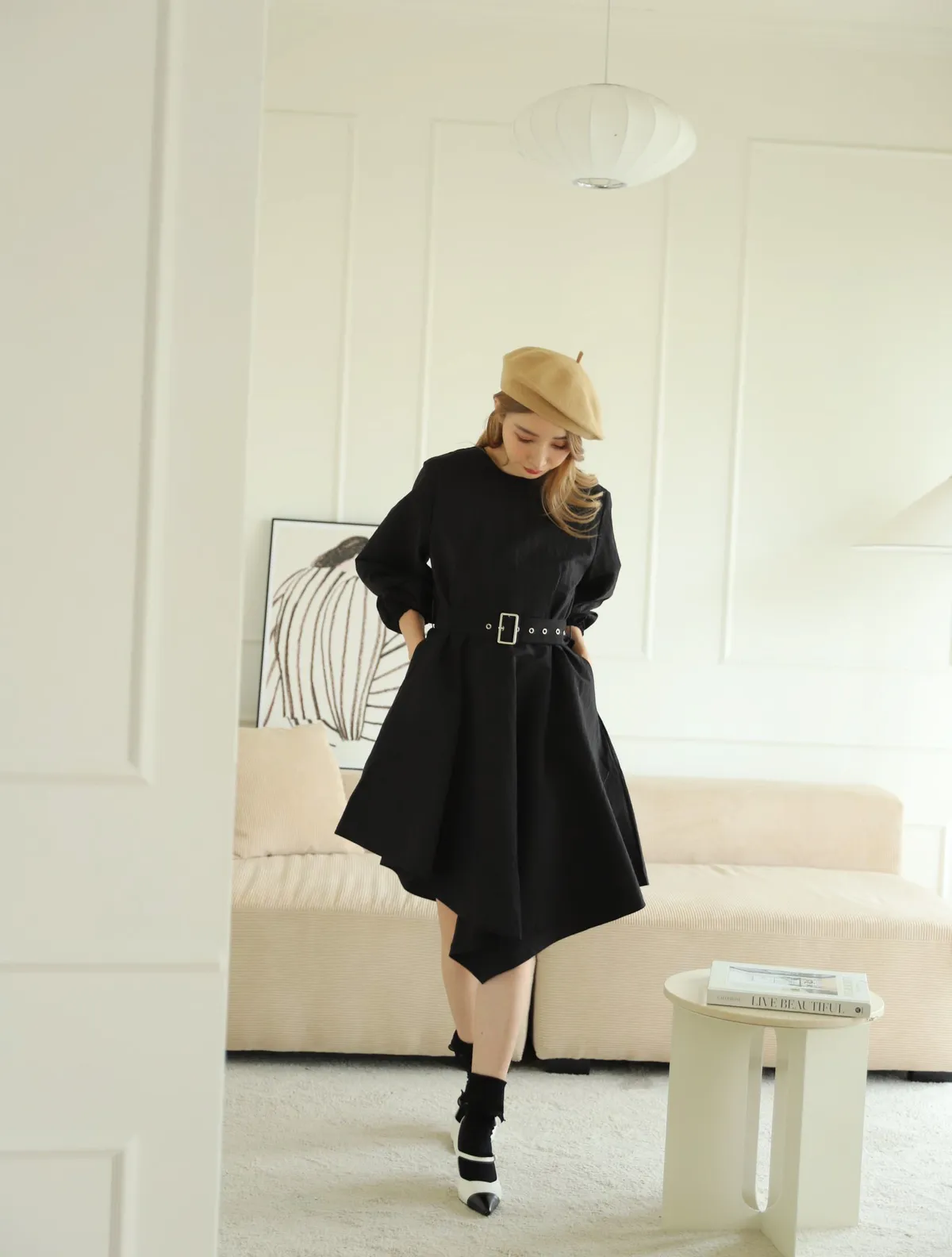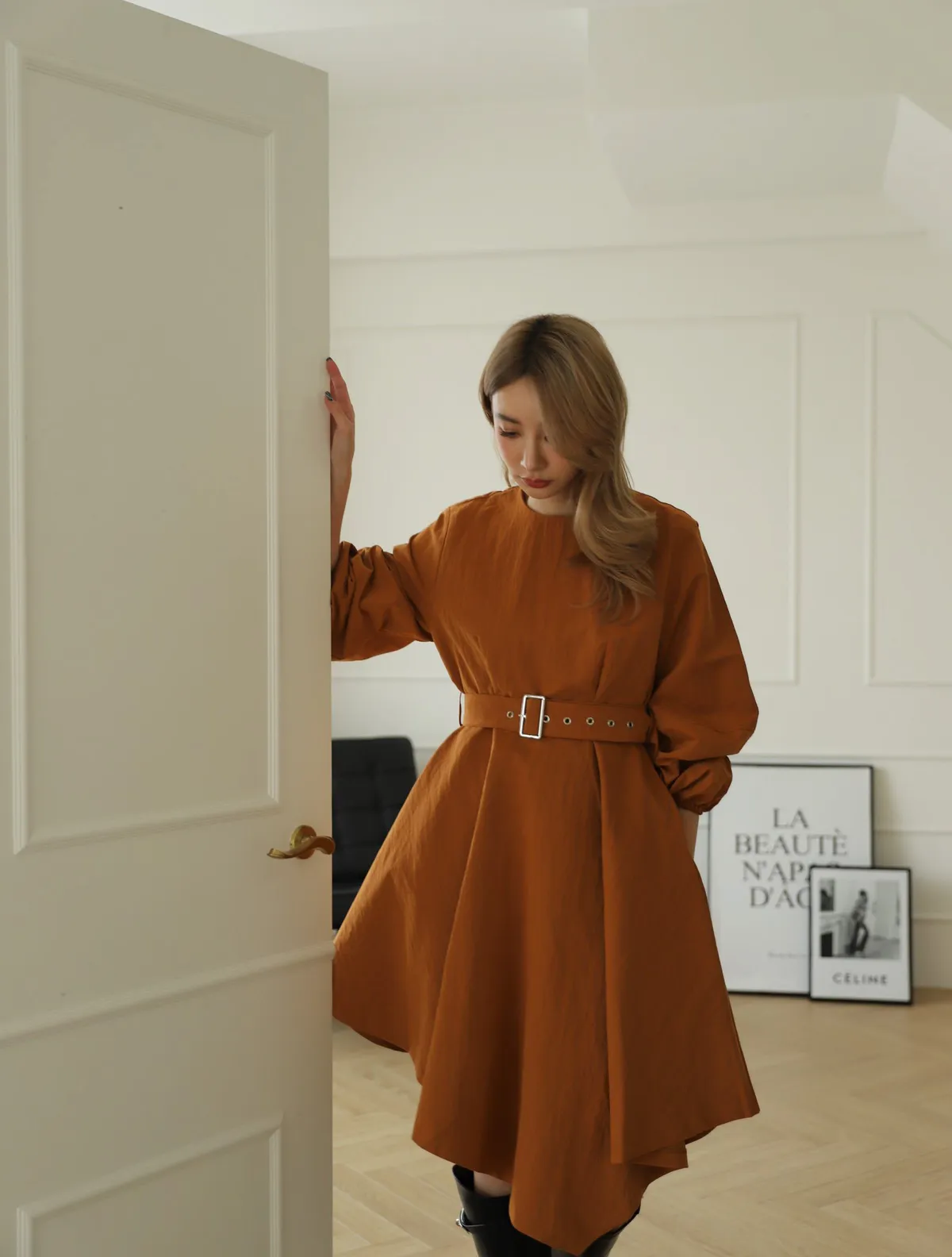 設計師款長袖腰帶不規則下擺連衣裙