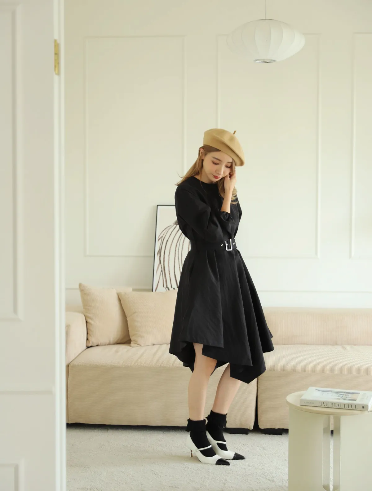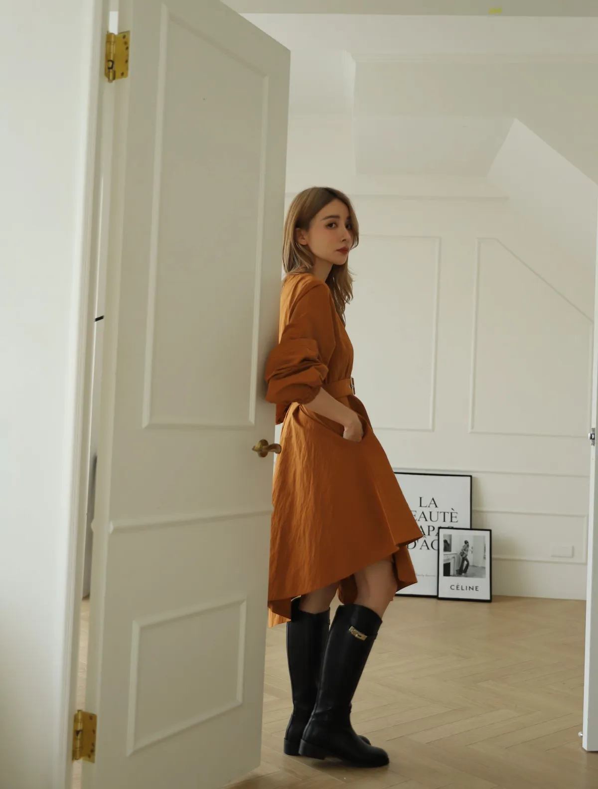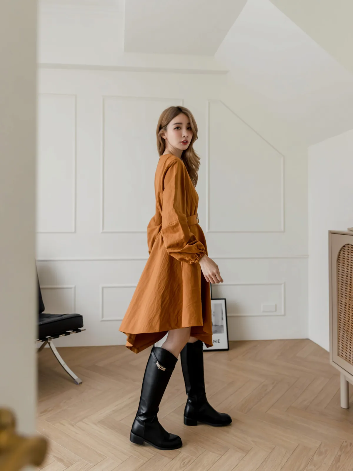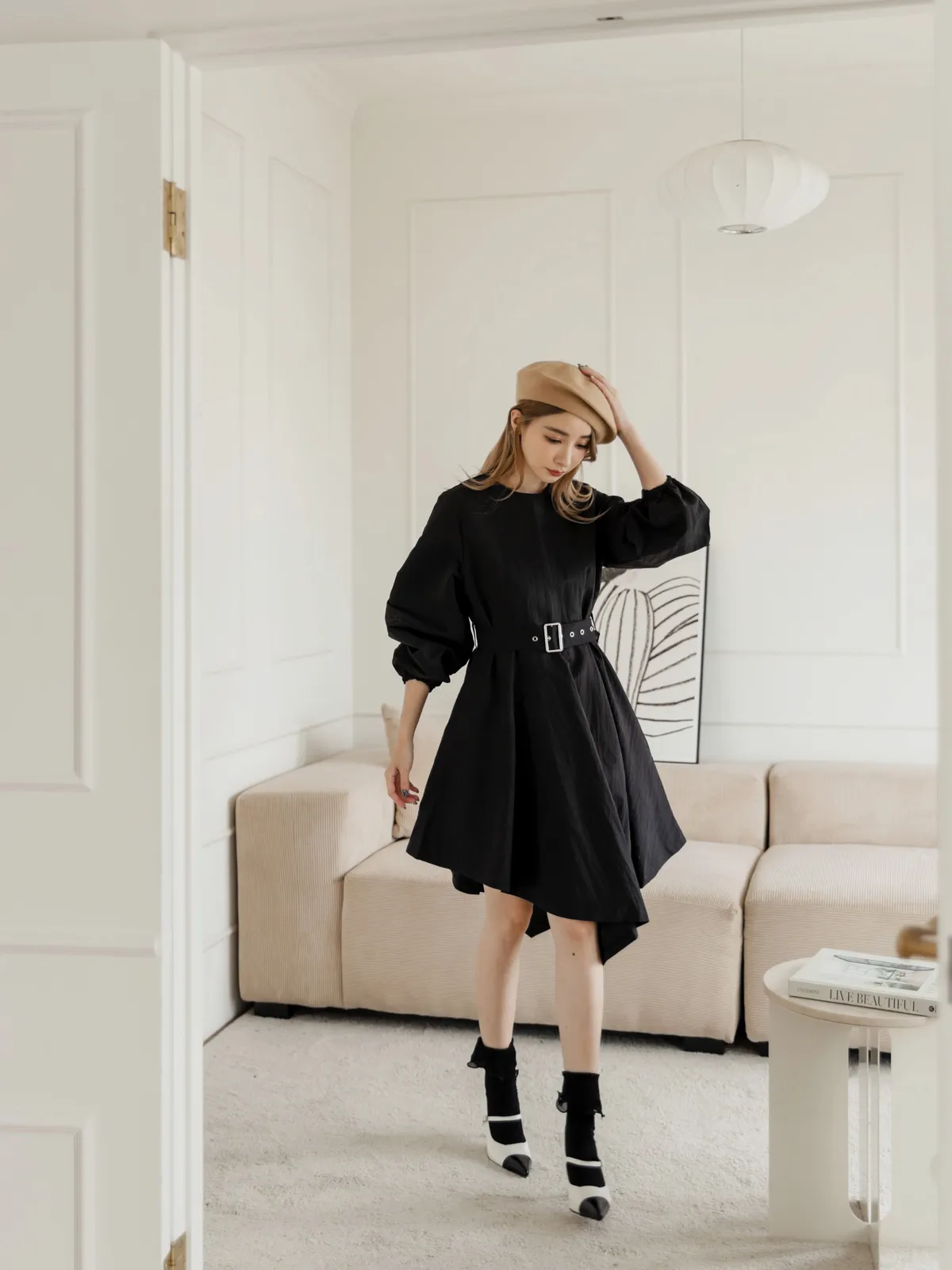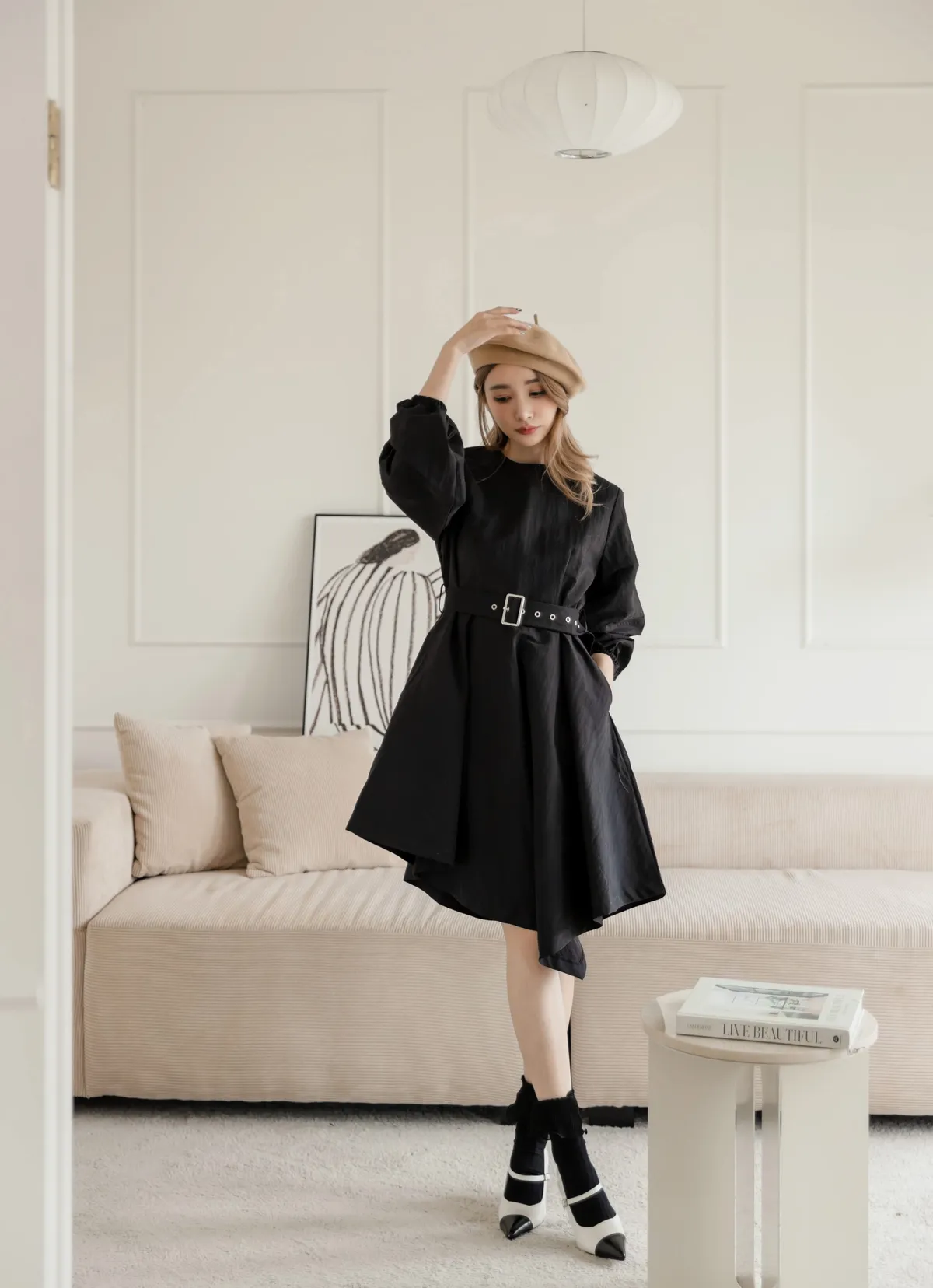 設計師款長袖腰帶不規則下擺連衣裙
