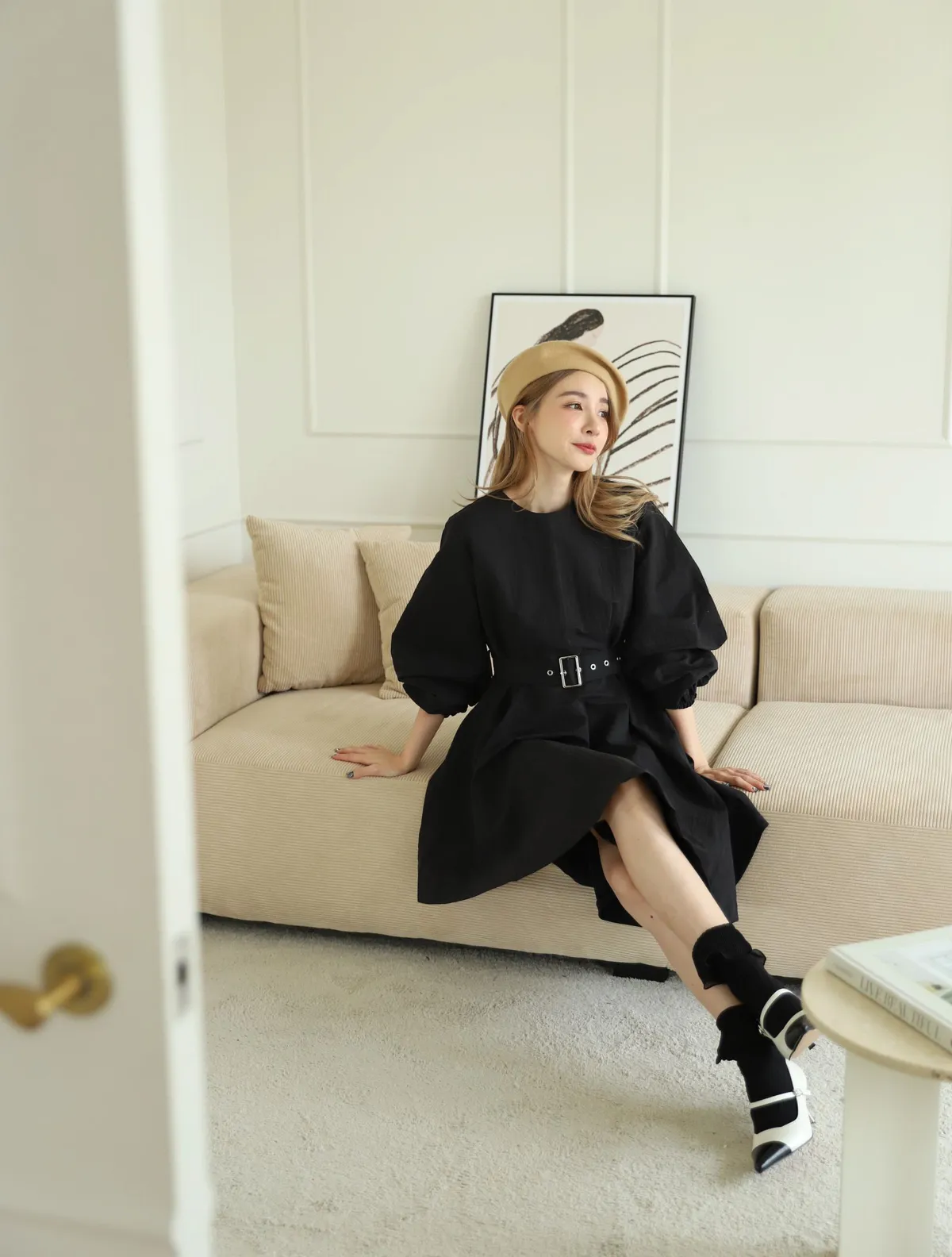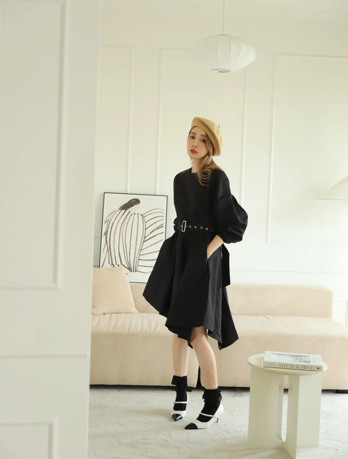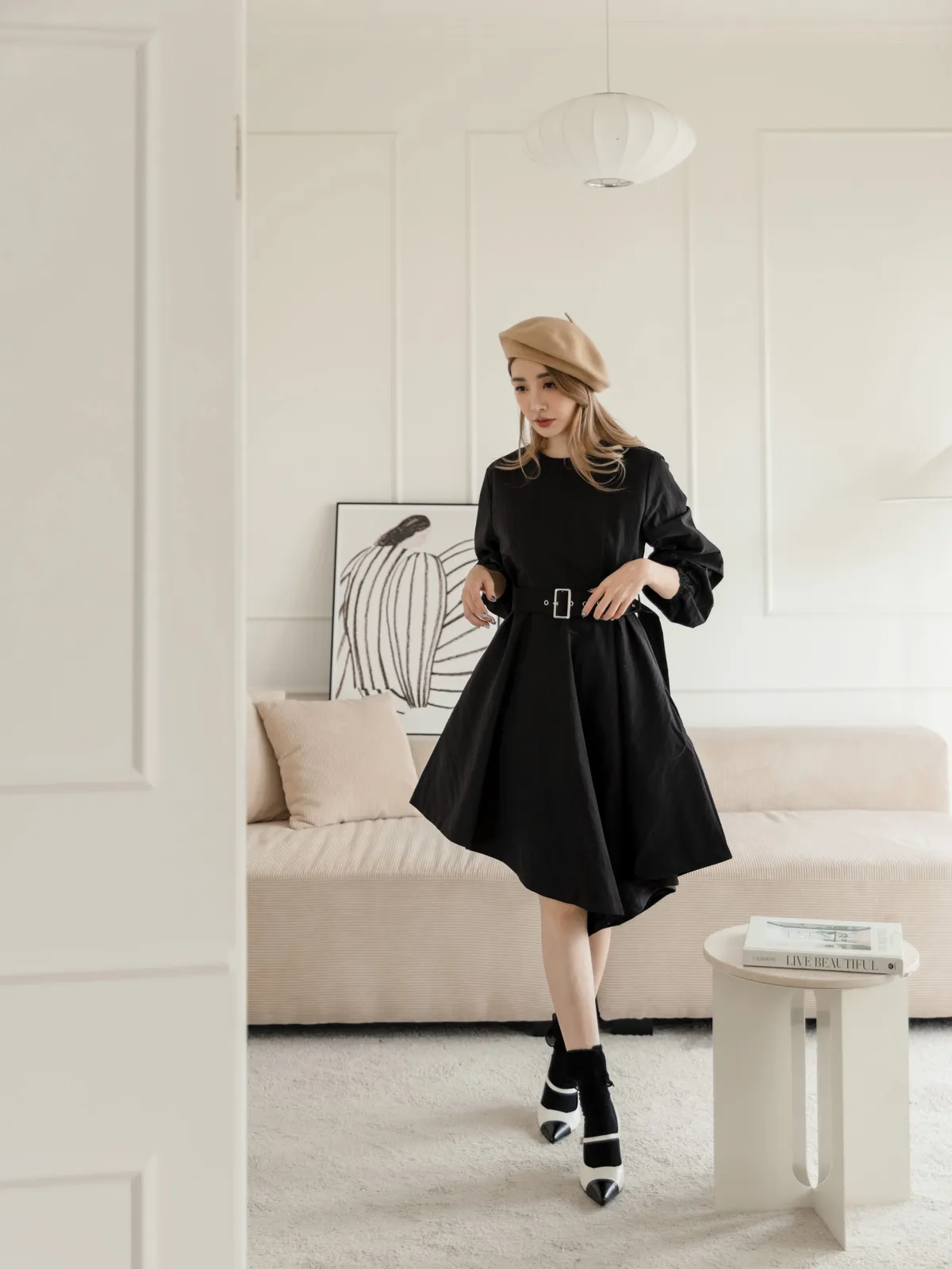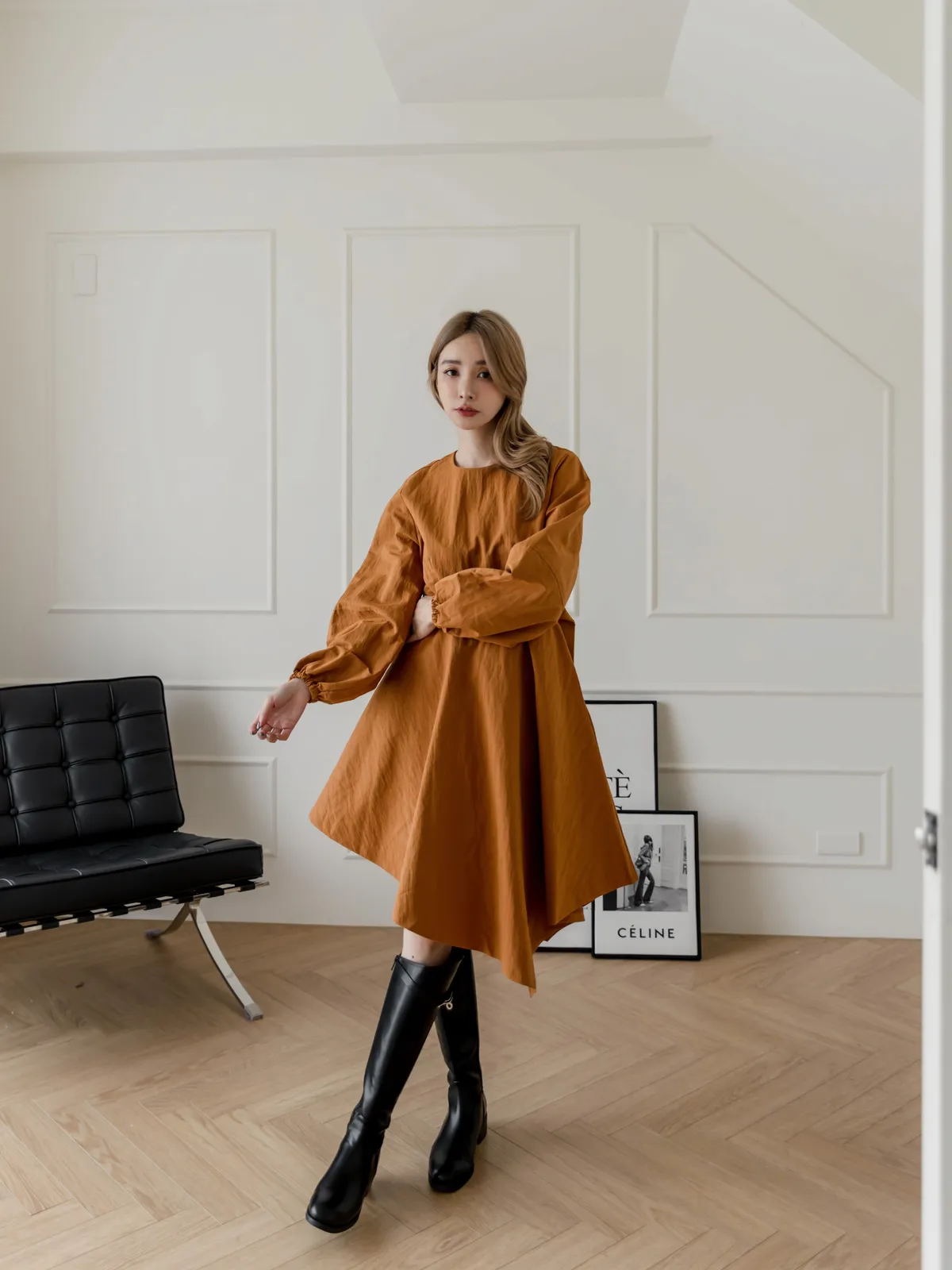 設計師款長袖腰帶不規則下擺連衣裙