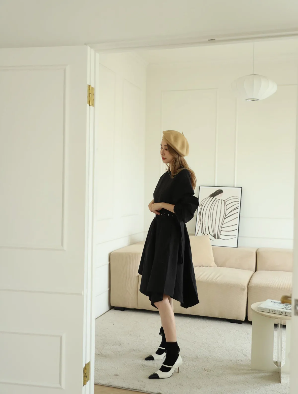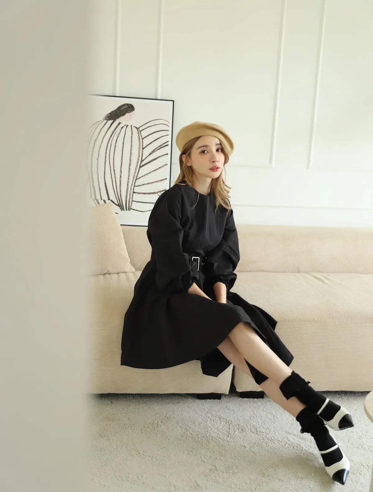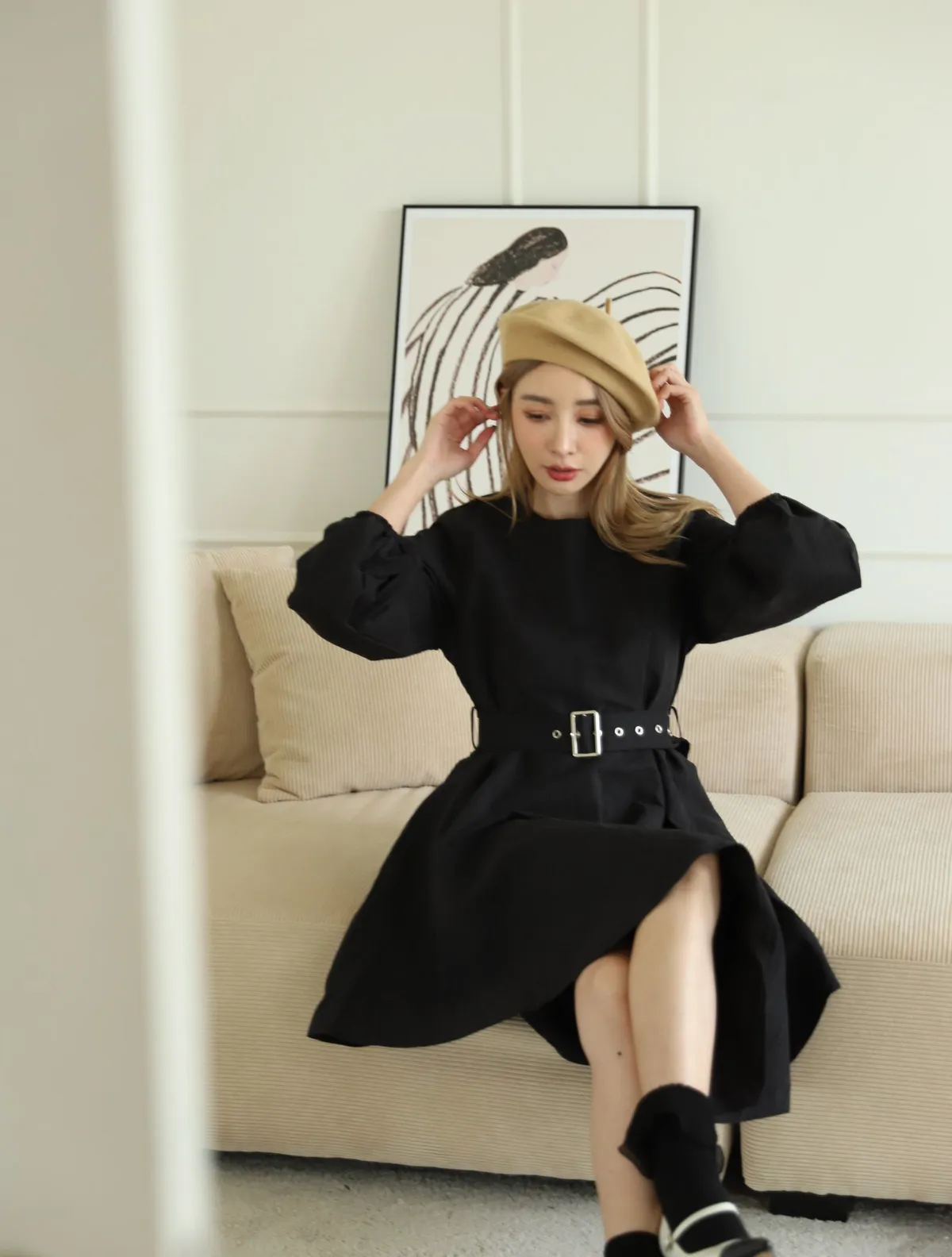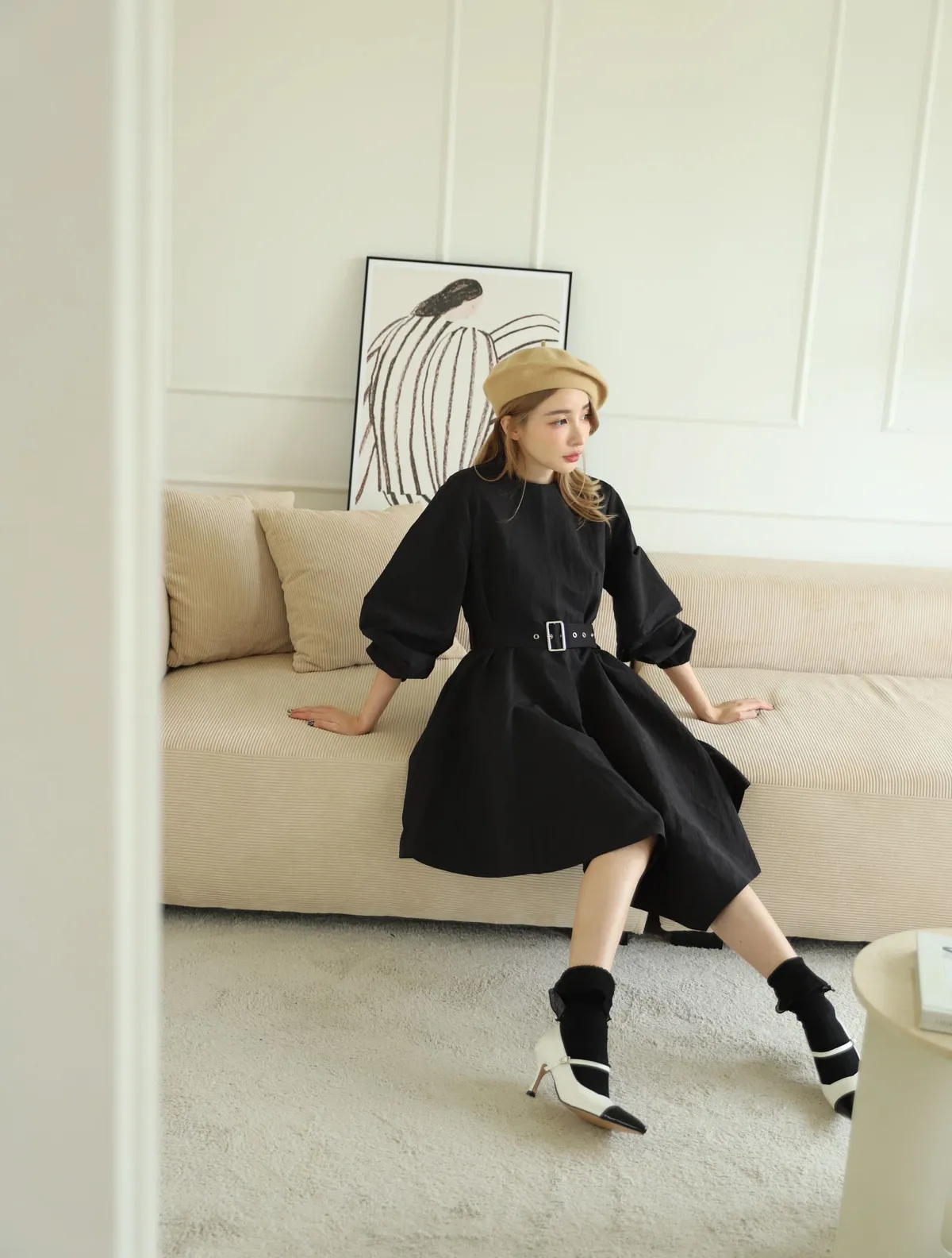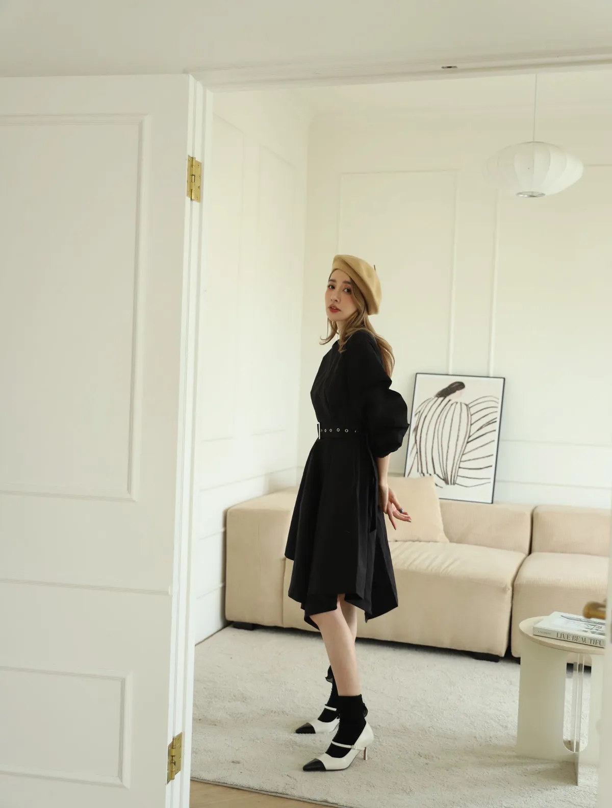 設計師款長袖腰帶不規則下擺連衣裙