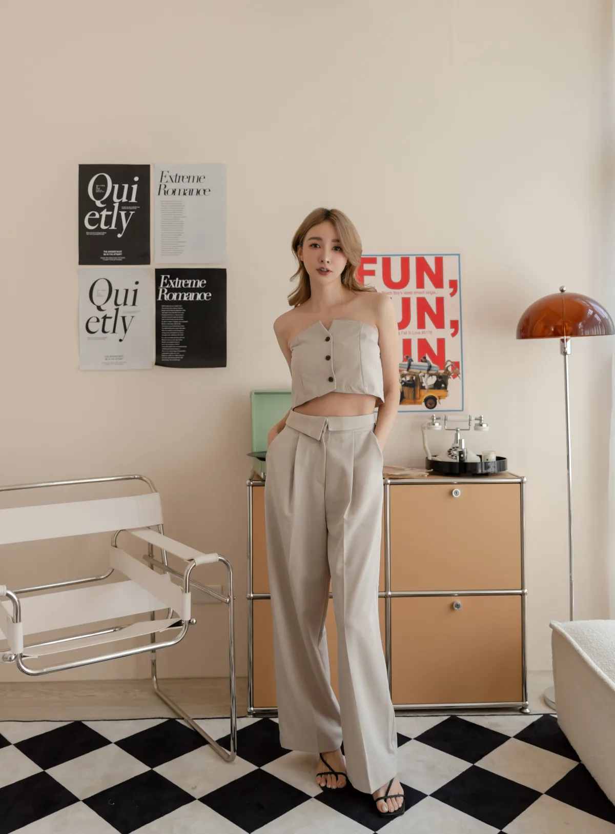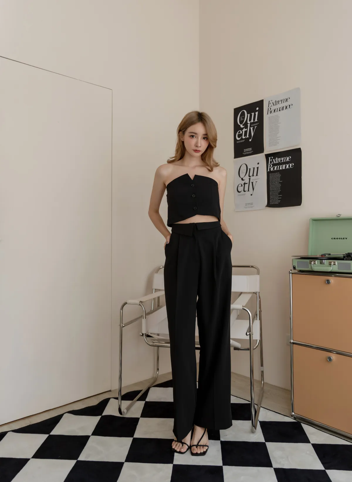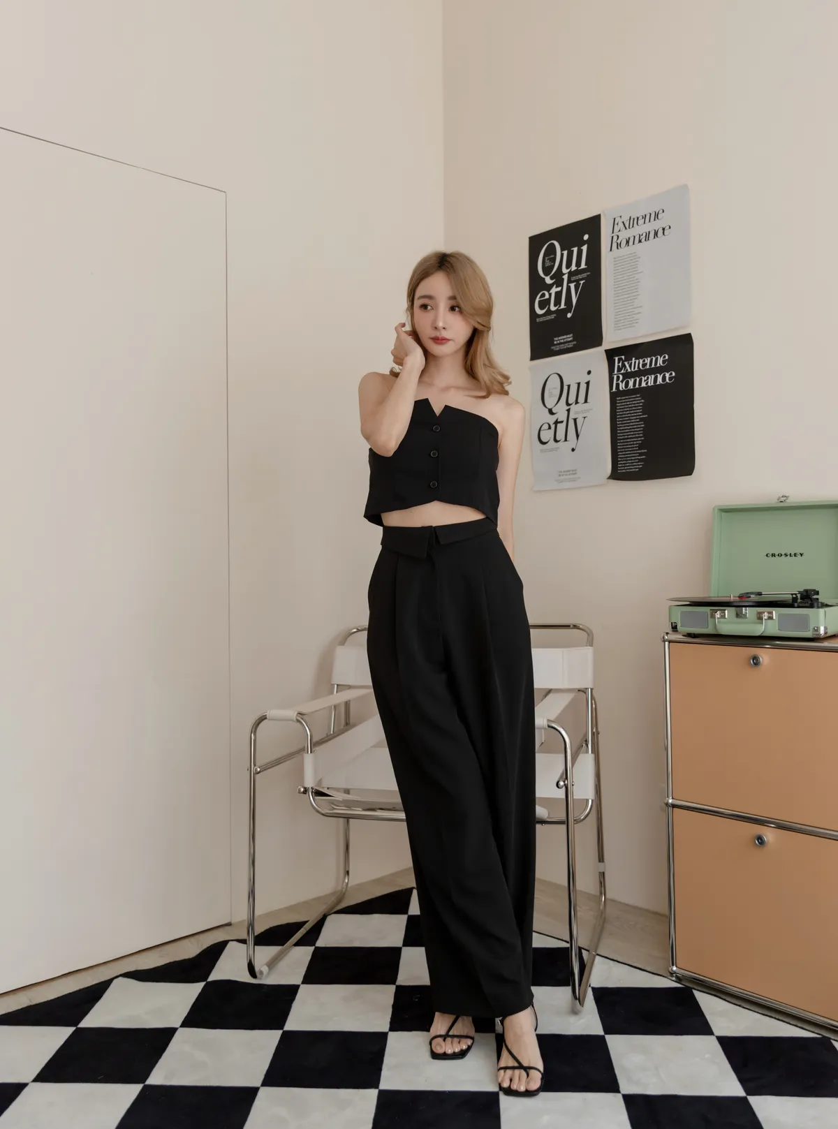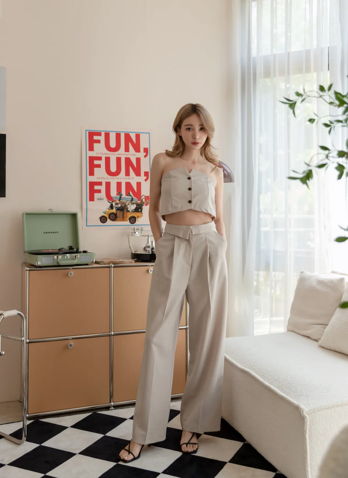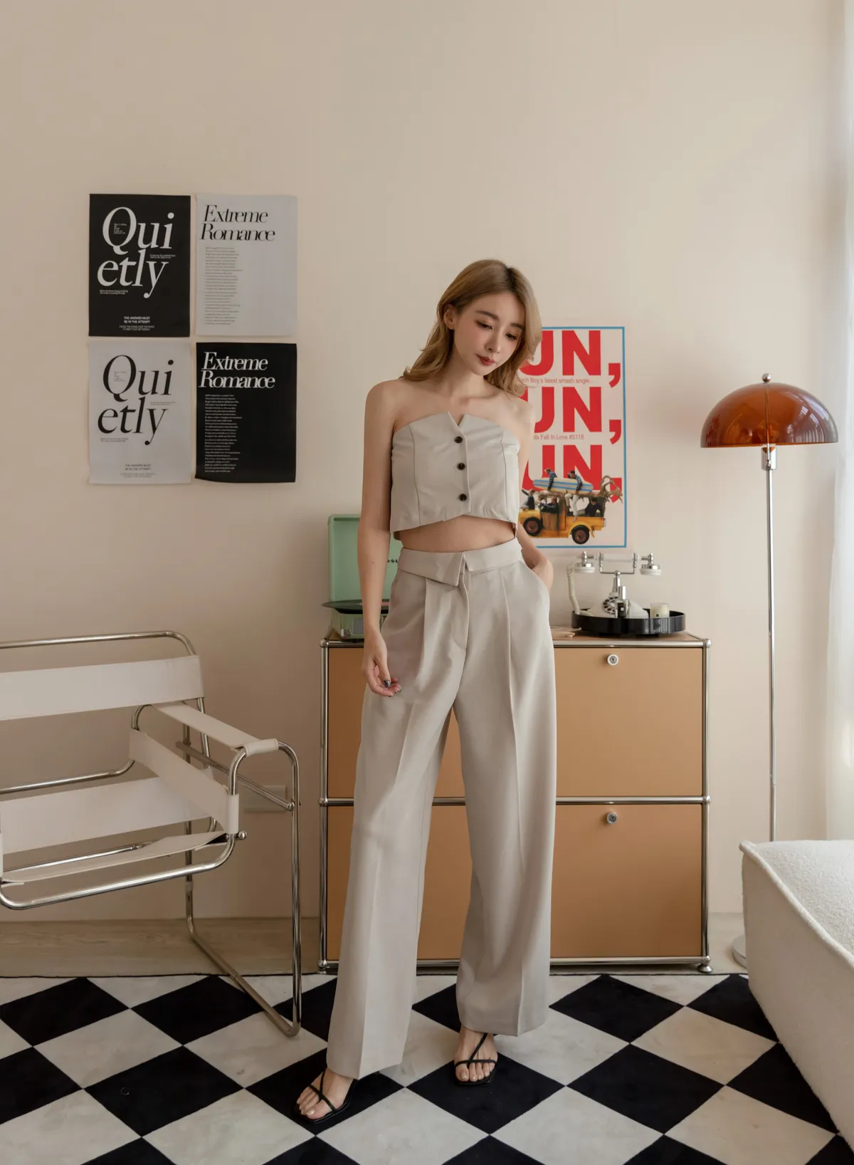 設計感小V鬆緊排扣裹胸背心上衣➕高腰翻折修身褲