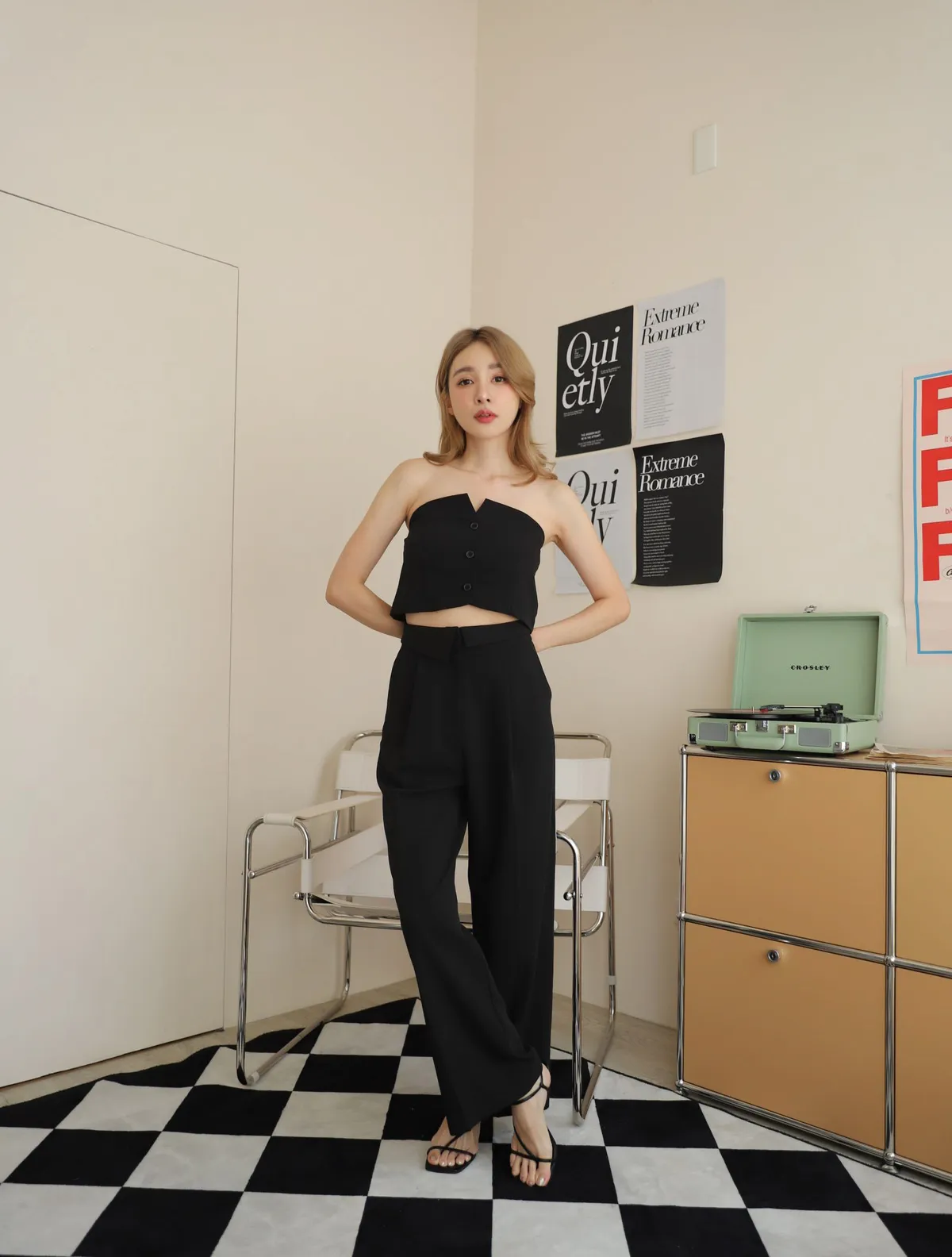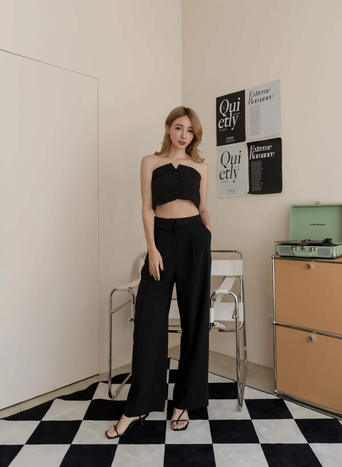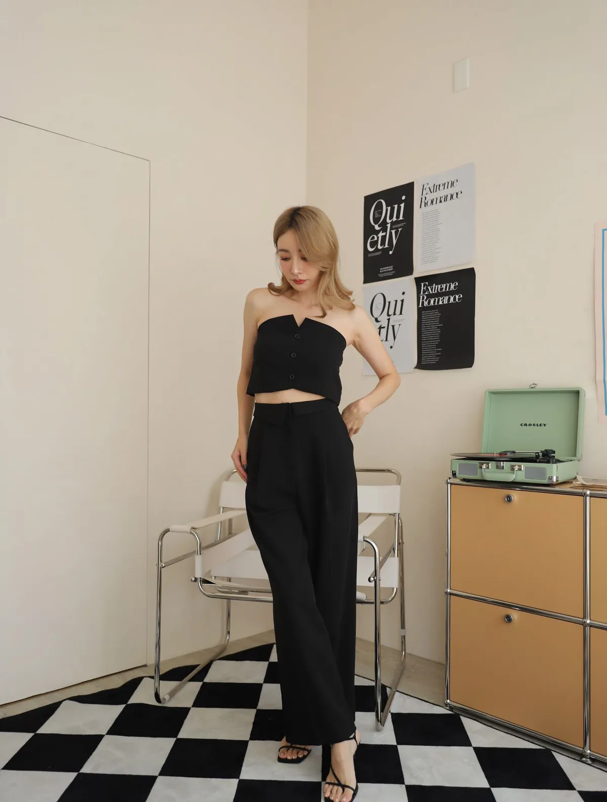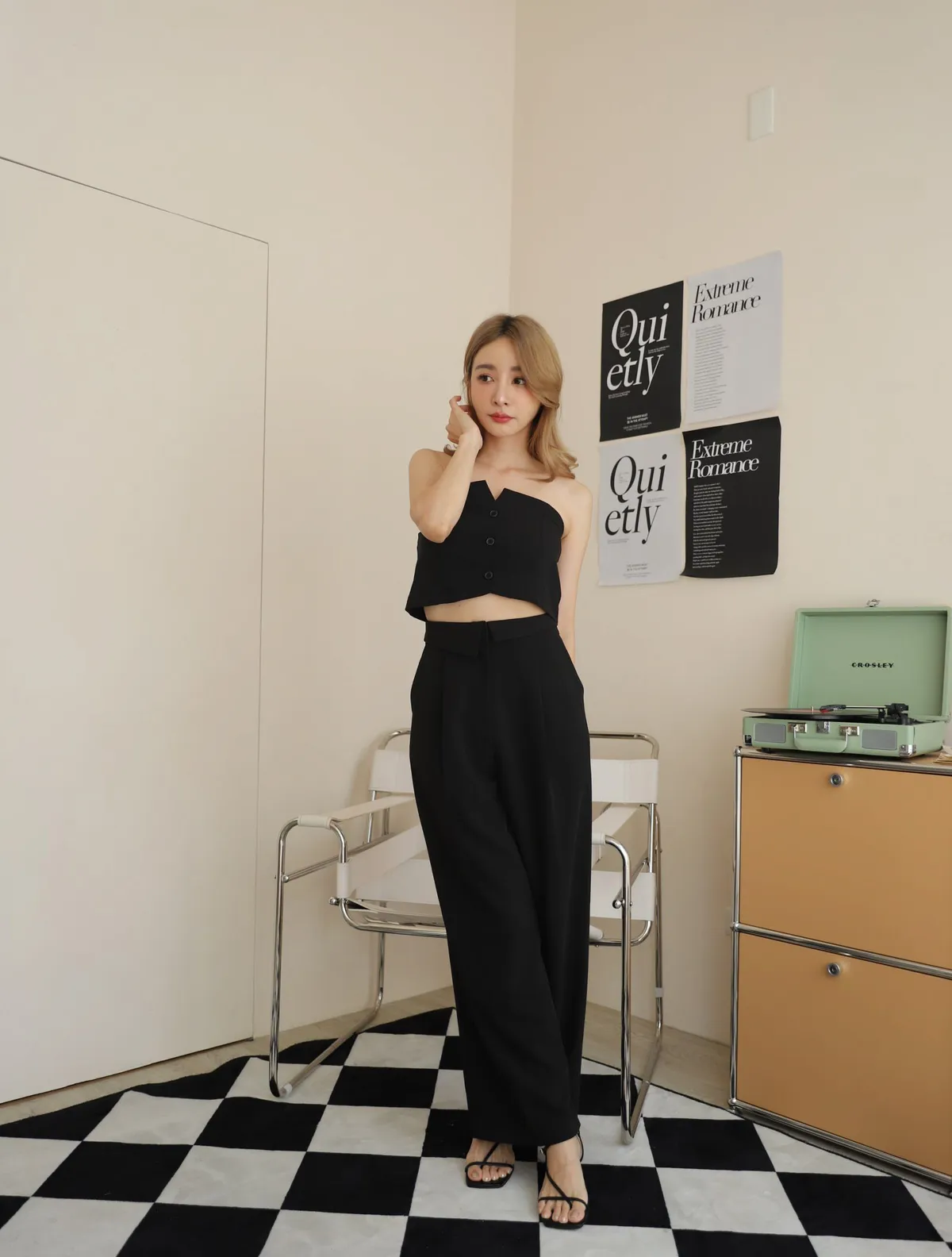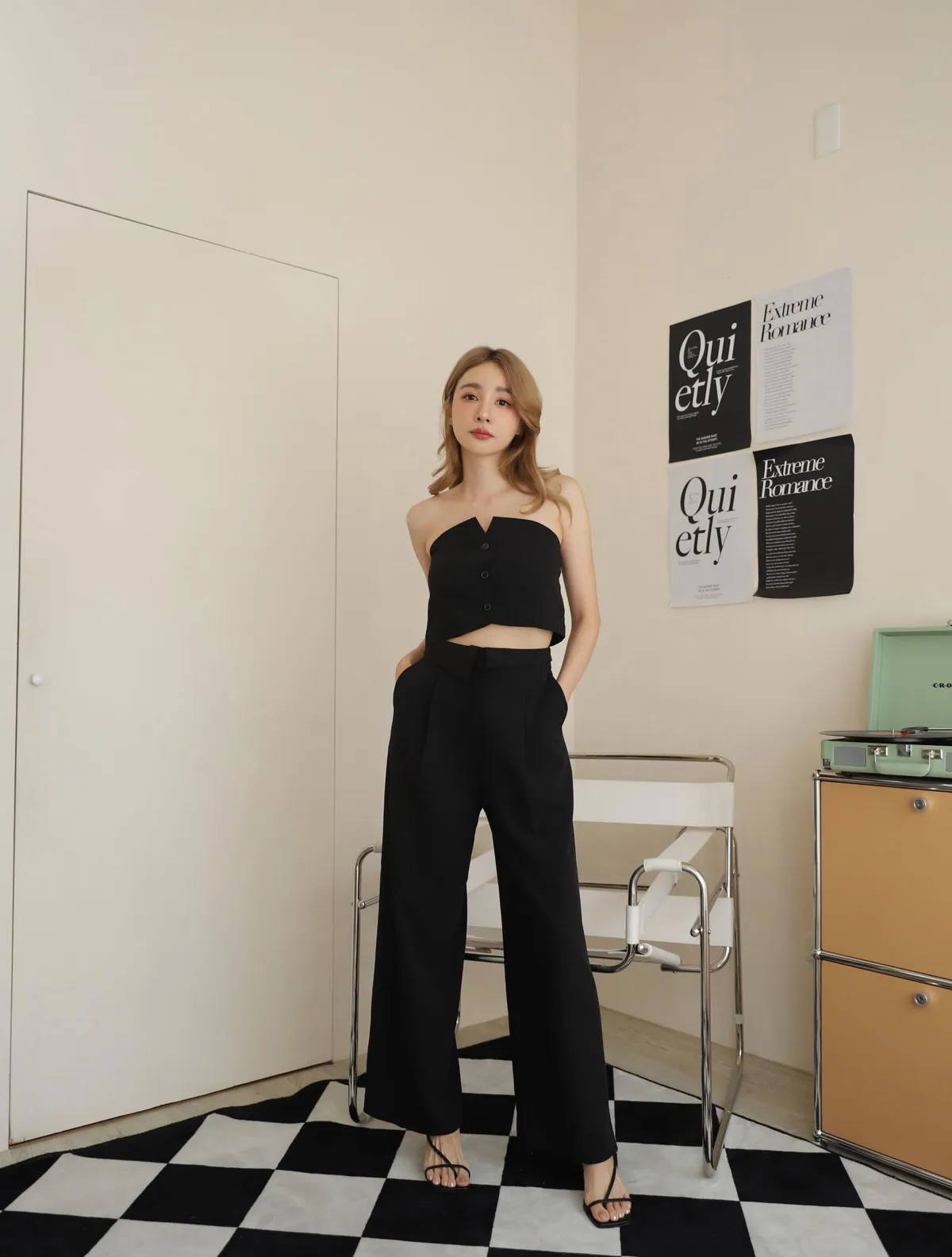 設計感小V鬆緊排扣裹胸背心上衣➕高腰翻折修身褲