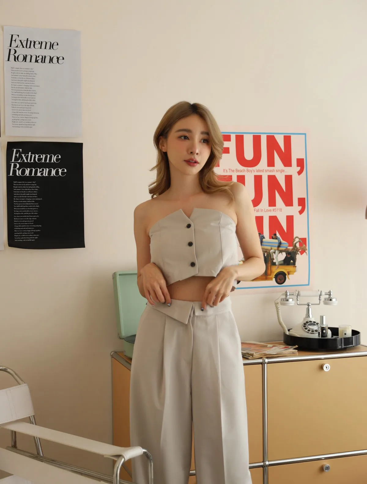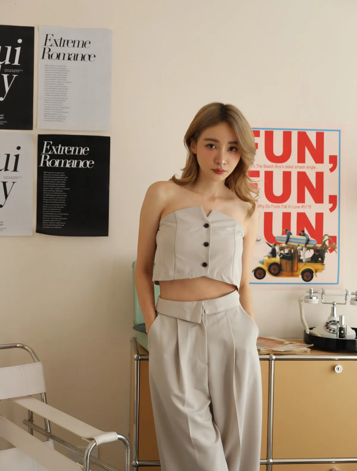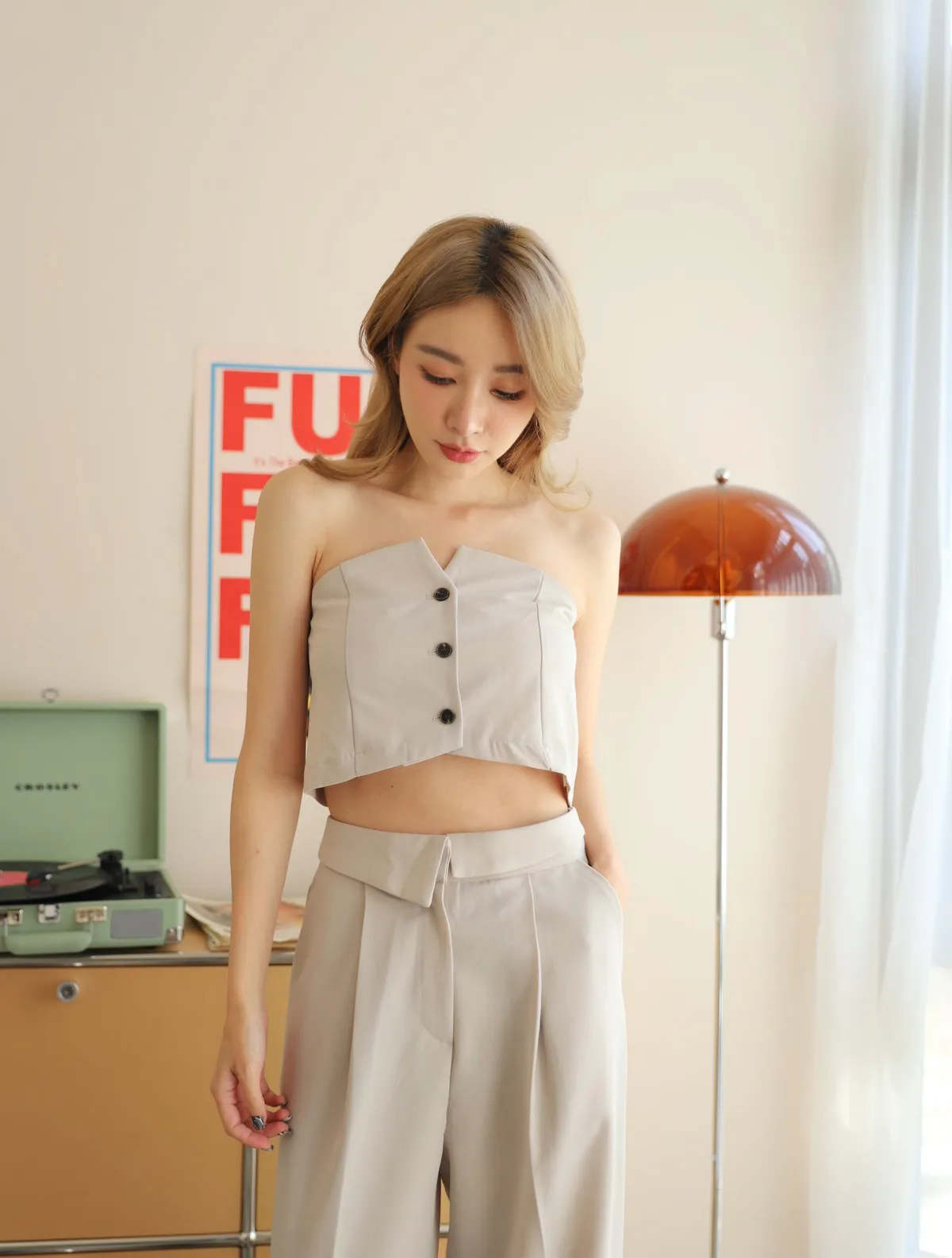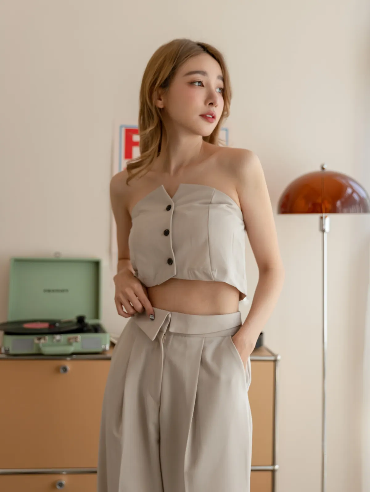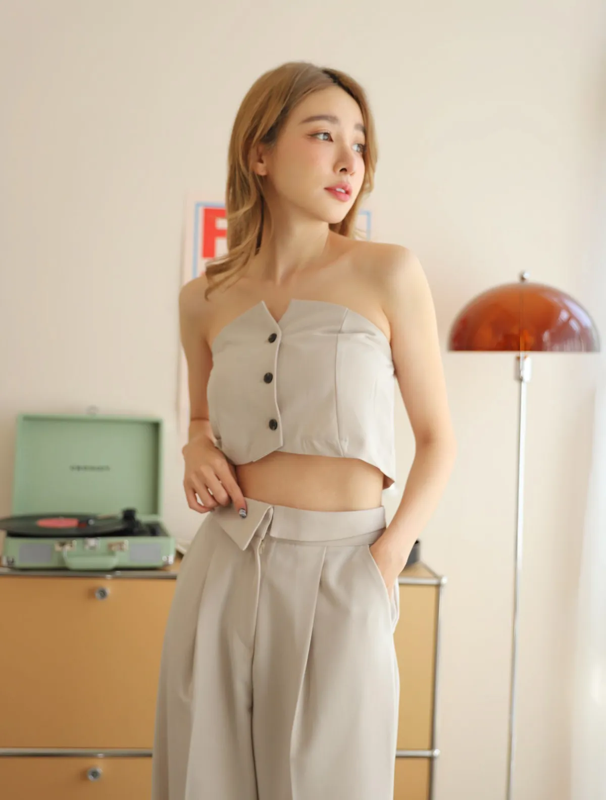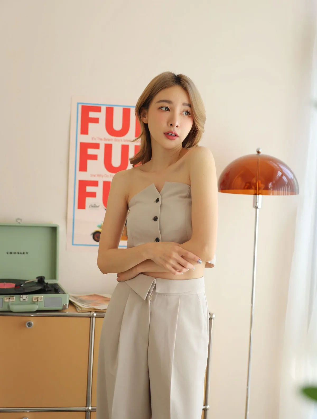 設計感小V鬆緊排扣裹胸背心上衣➕高腰翻折修身褲