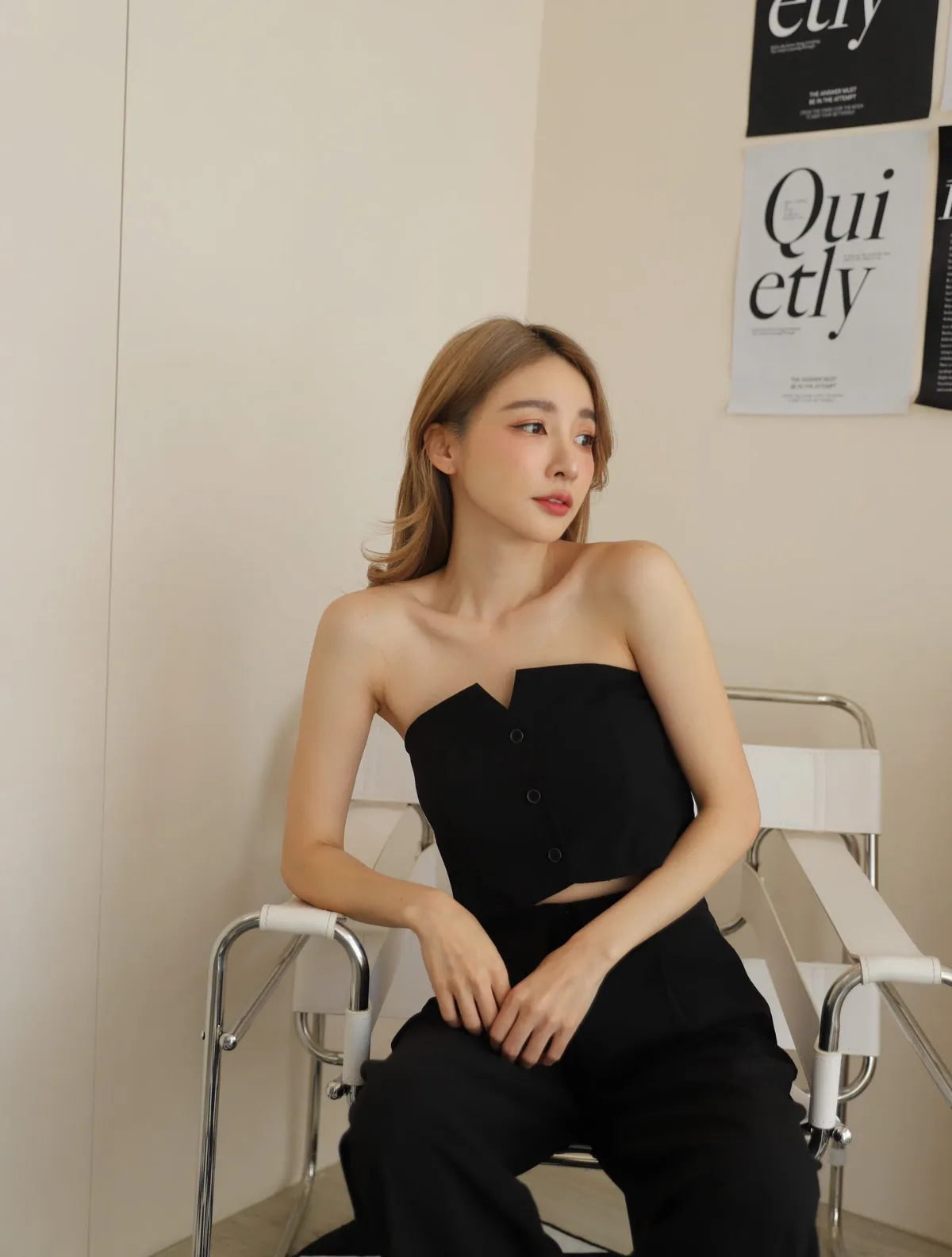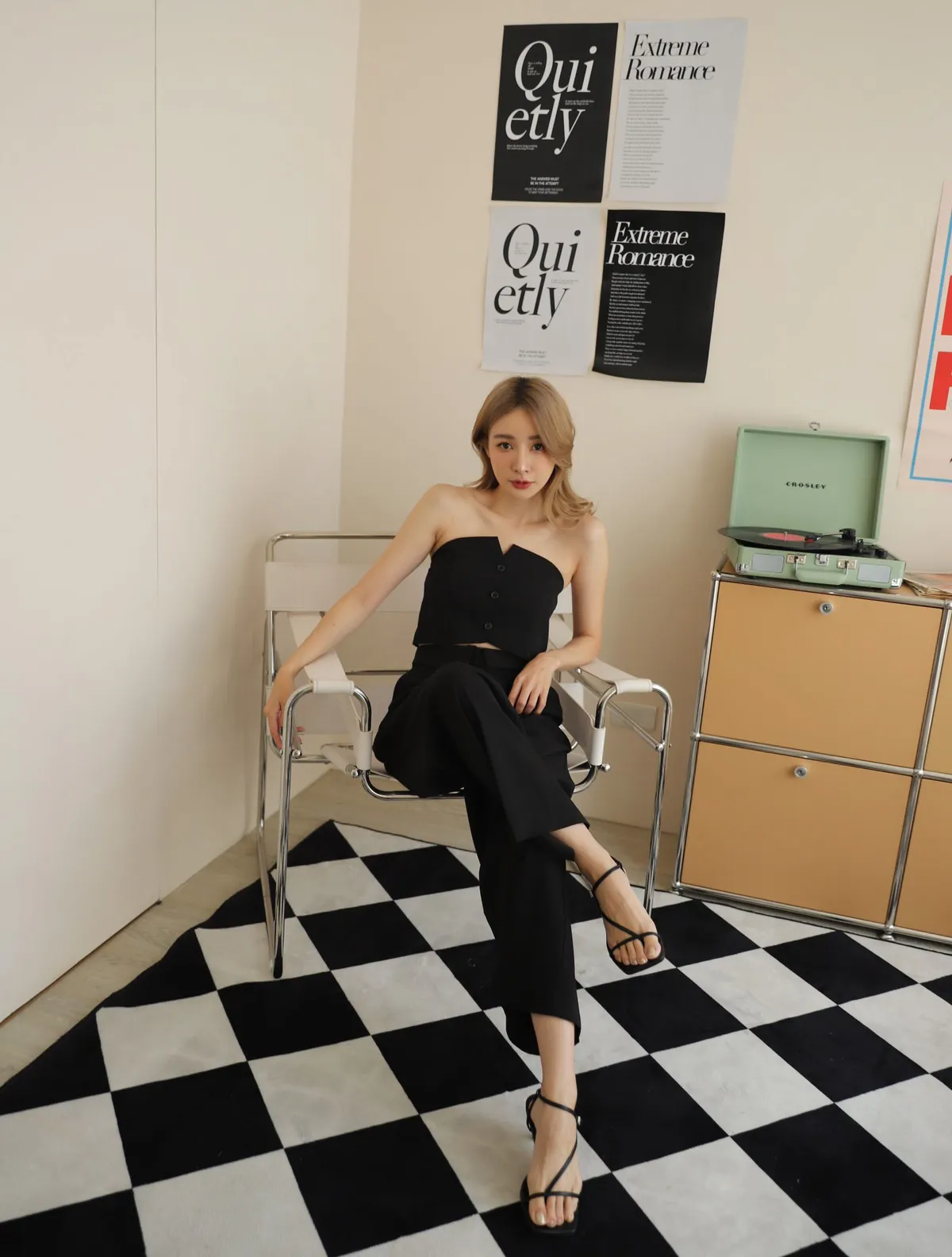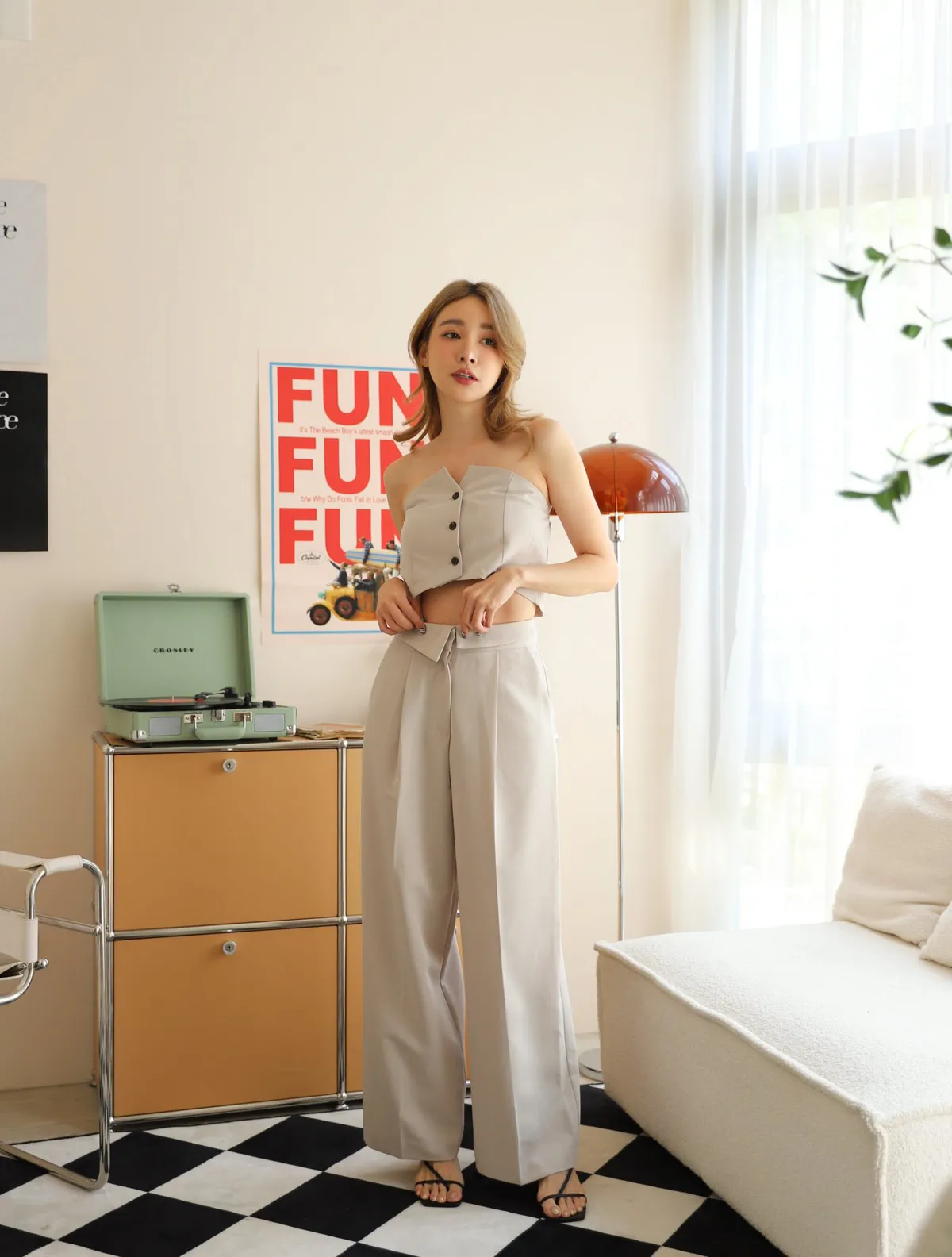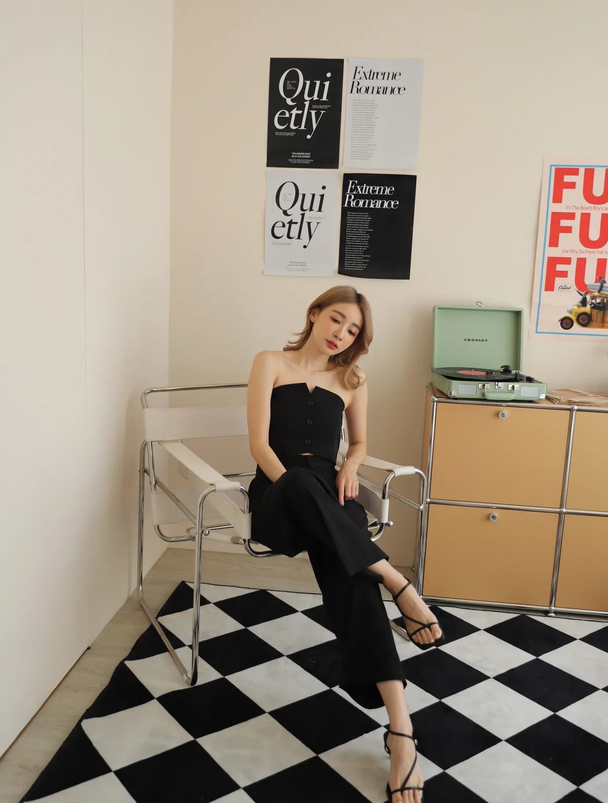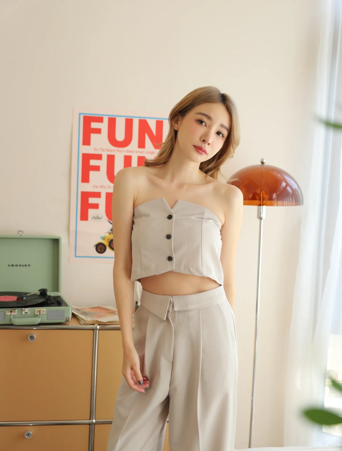 設計感小V鬆緊排扣裹胸背心上衣➕高腰翻折修身褲
