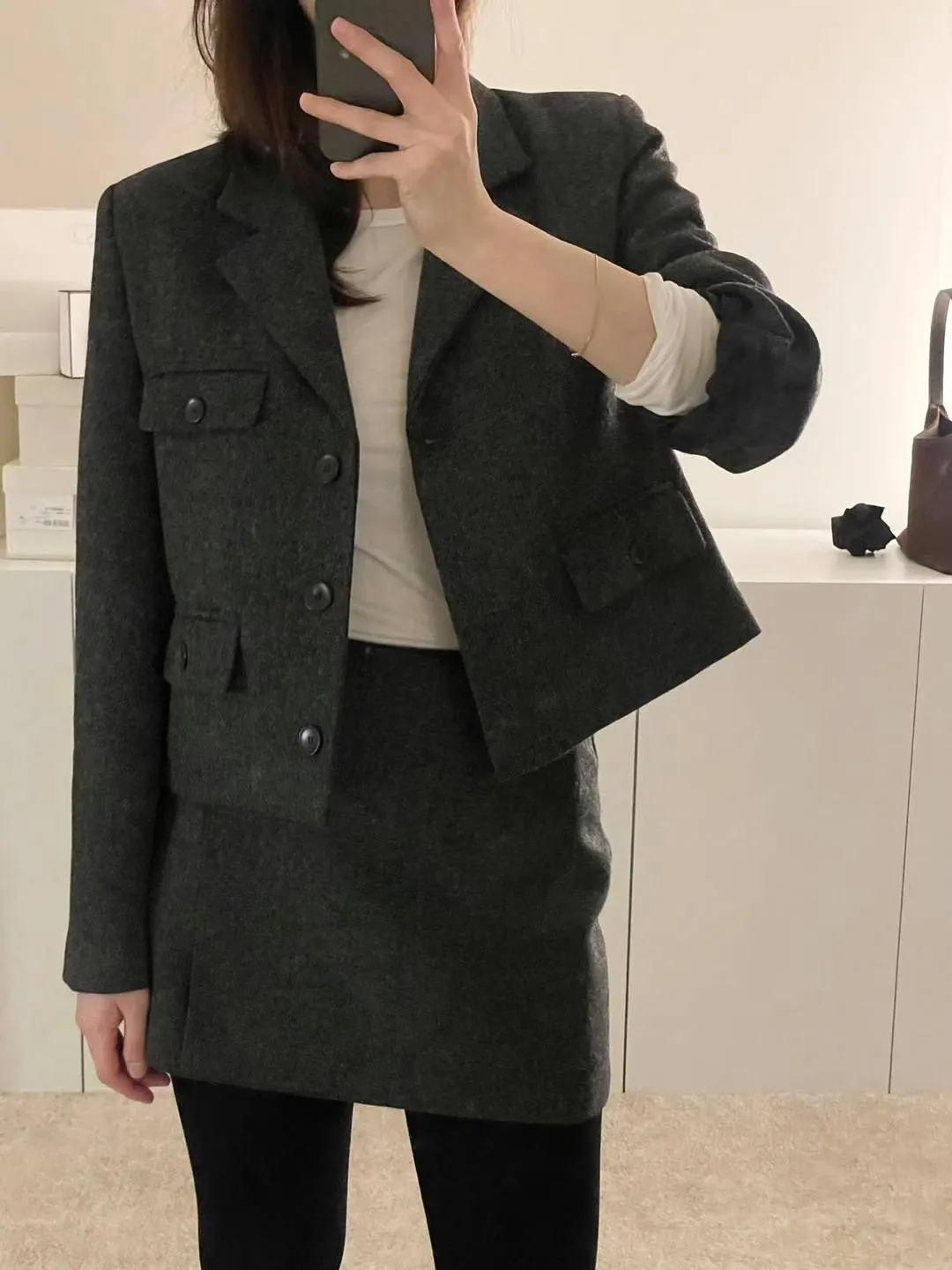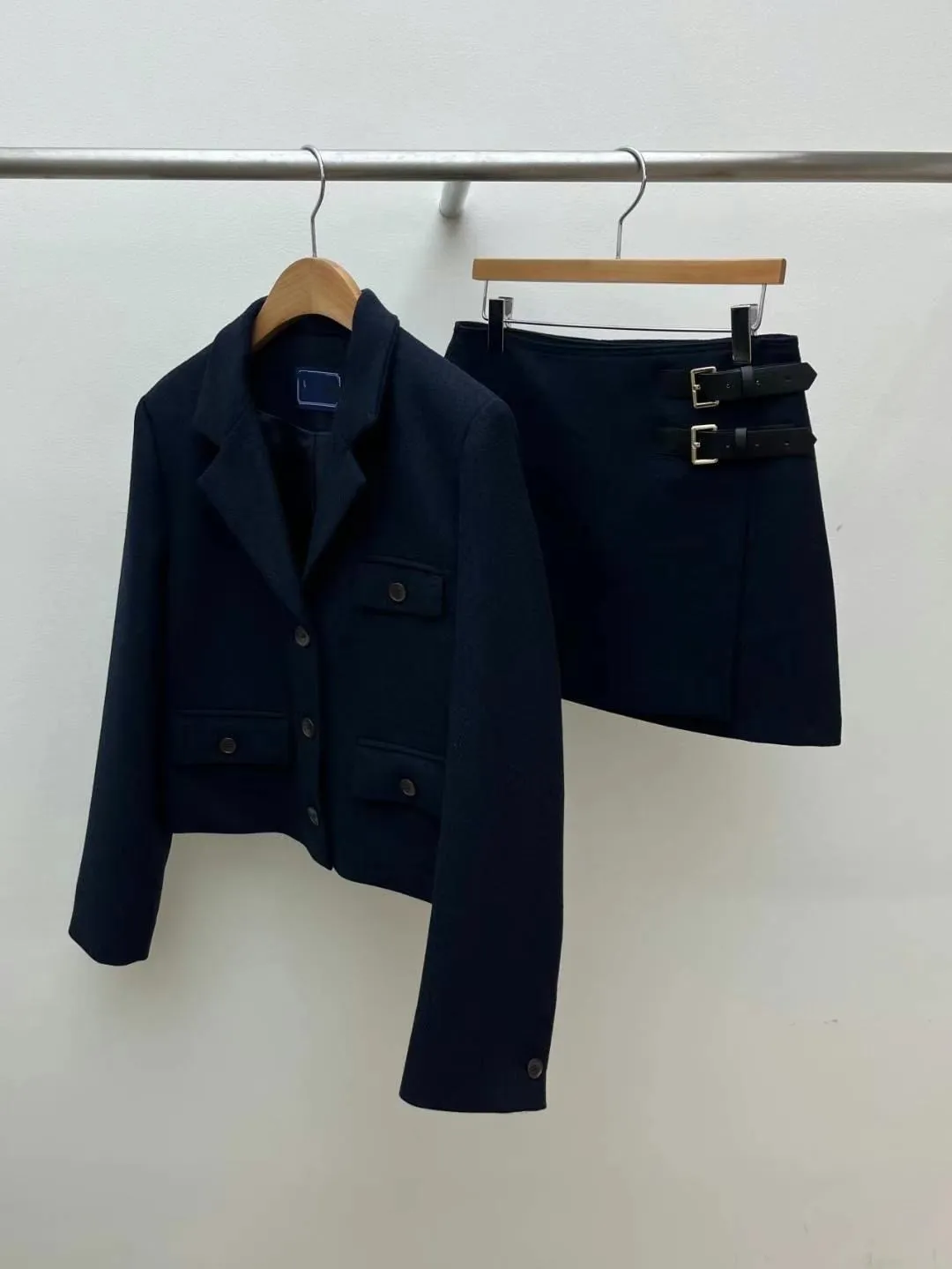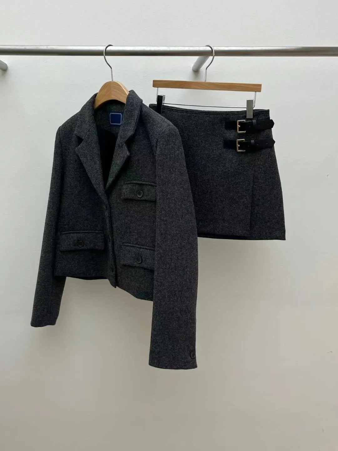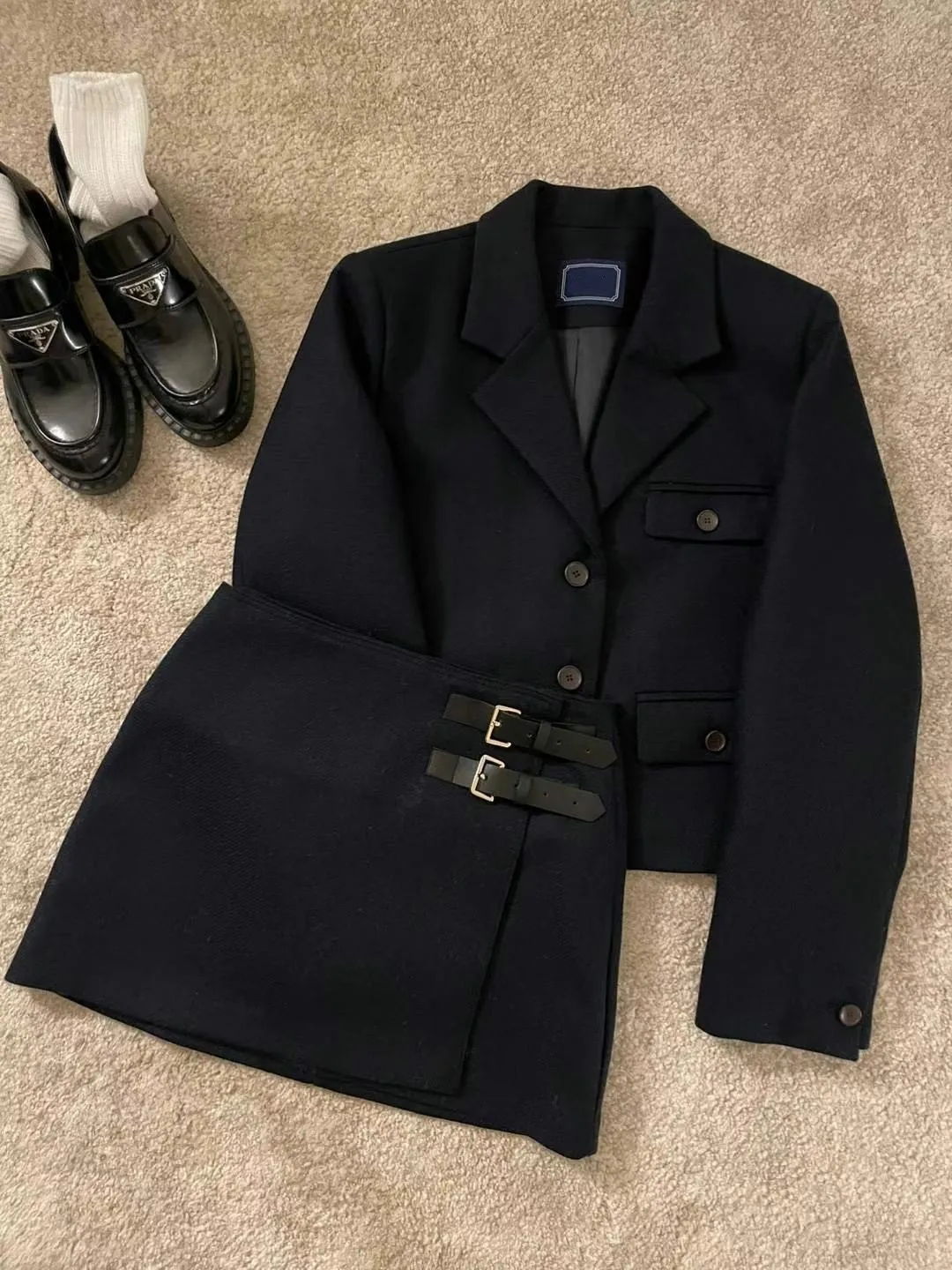 設計師款學院風羊毛西裝外套+羊毛百摺短裙set套裝