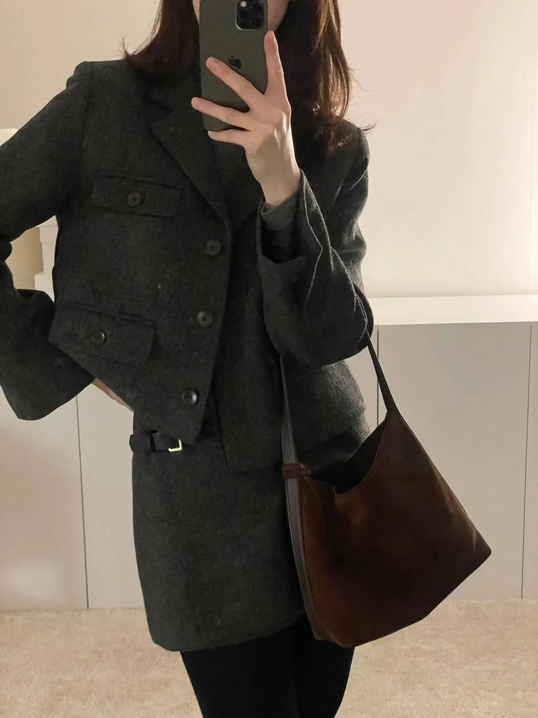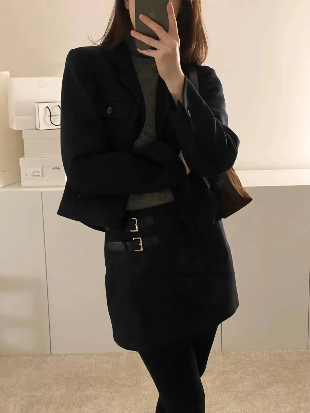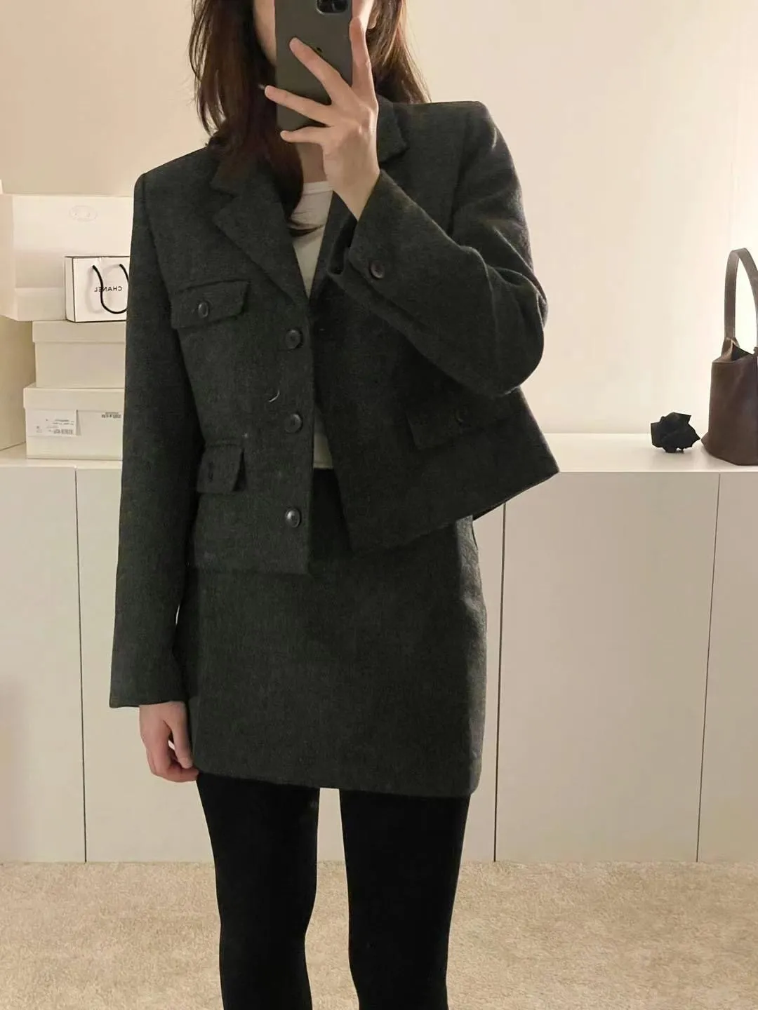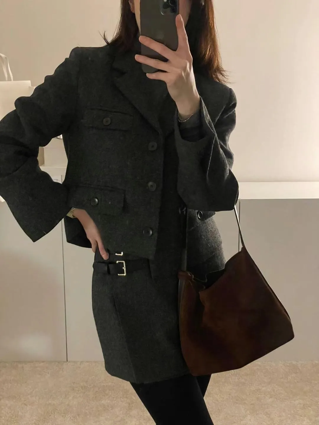 設計師款學院風羊毛西裝外套+羊毛百摺短裙set套裝