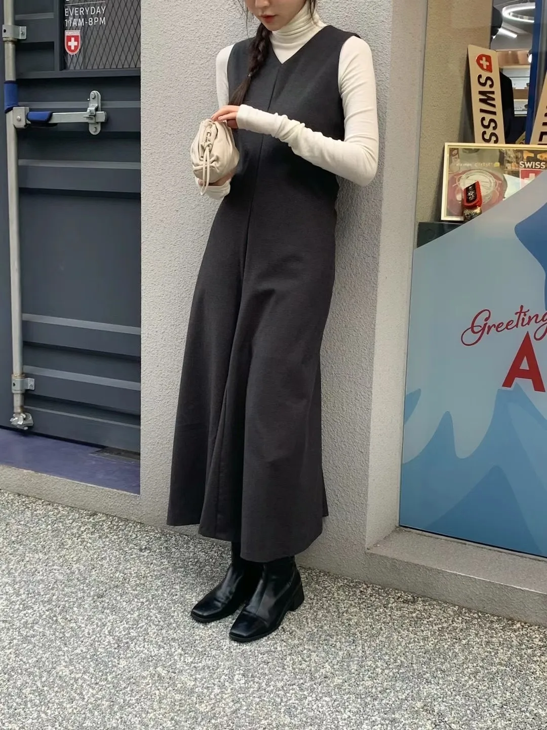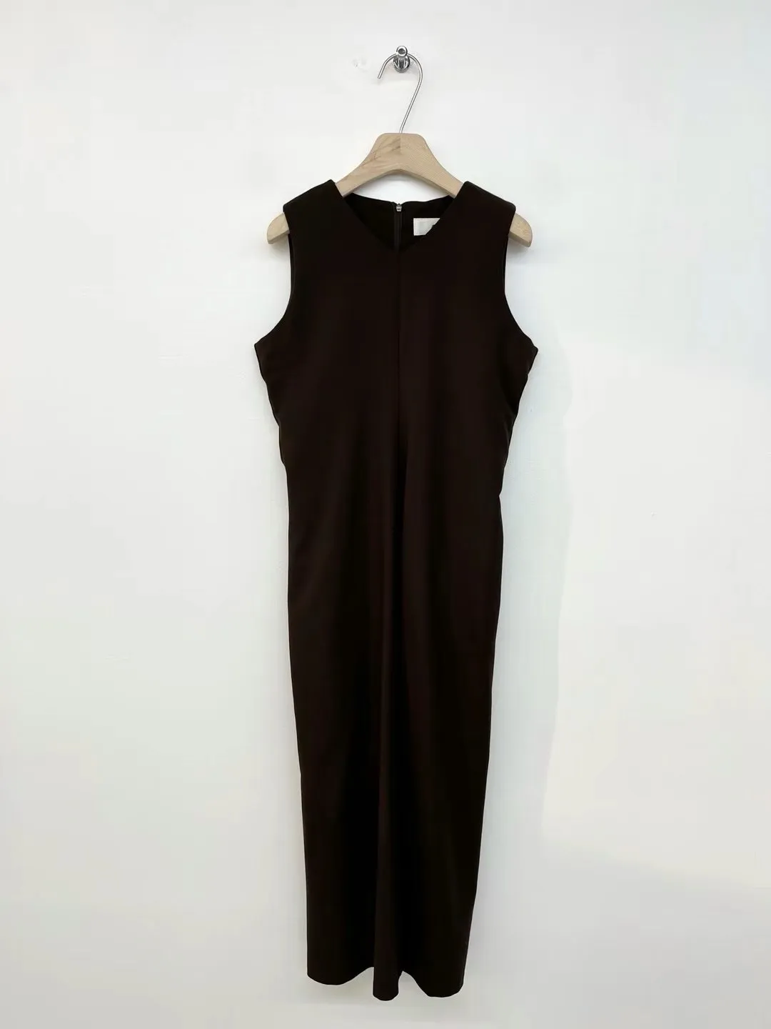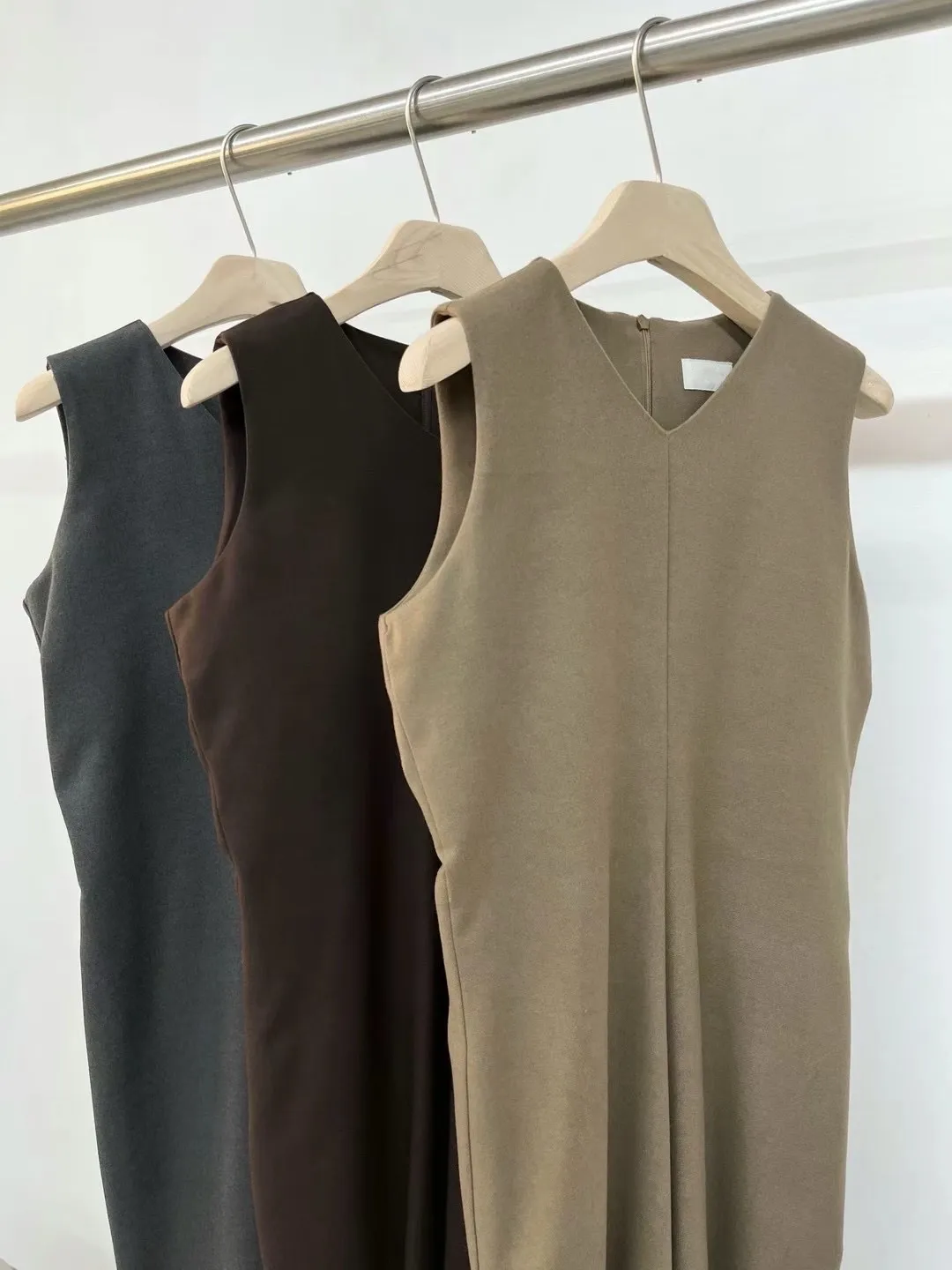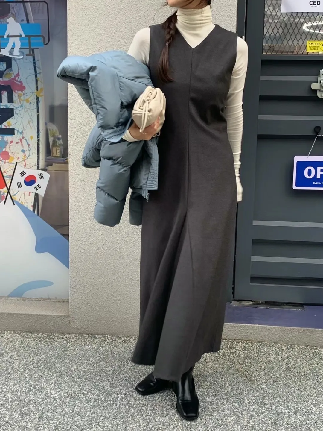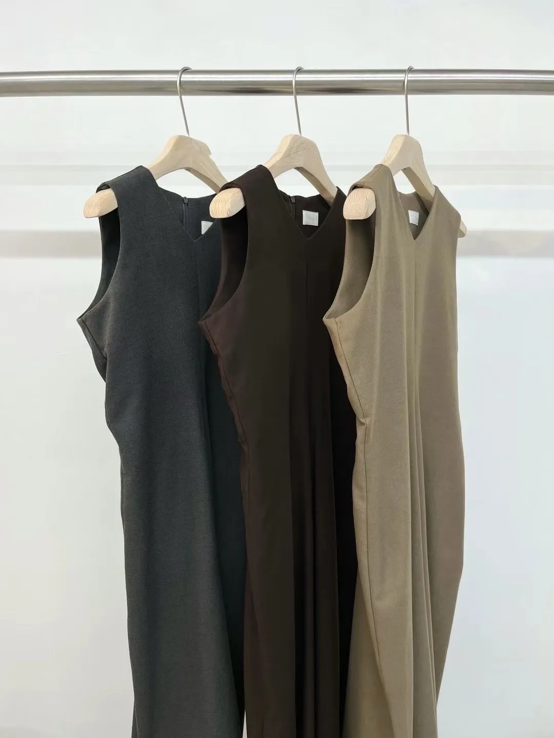 設計師品牌 氣質修身顯瘦v領羊毛無袖長款連衣裙