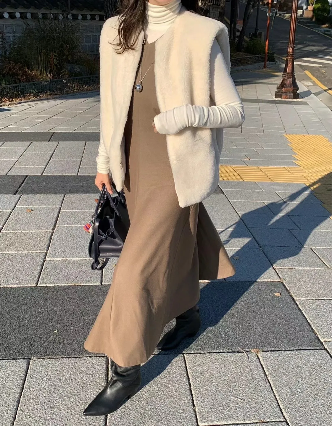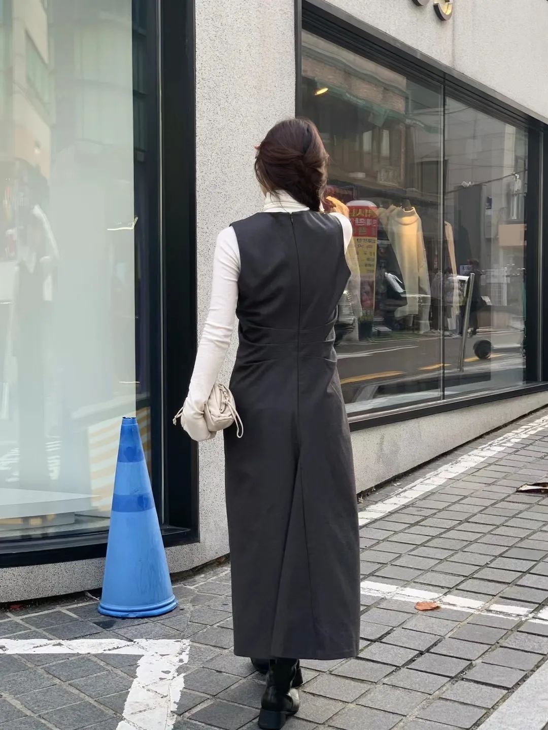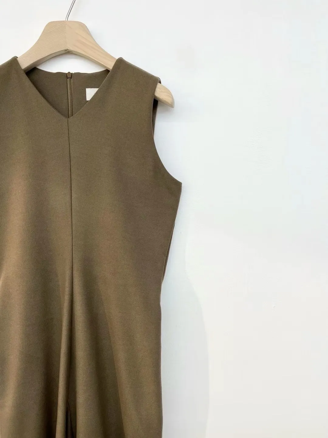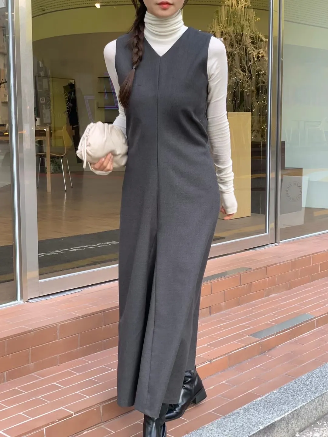 設計師品牌 氣質修身顯瘦v領羊毛無袖長款連衣裙