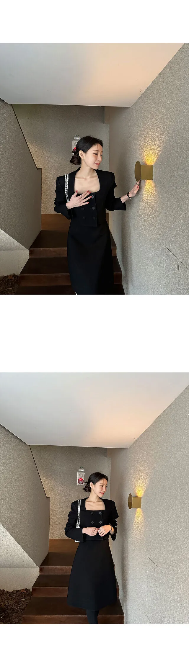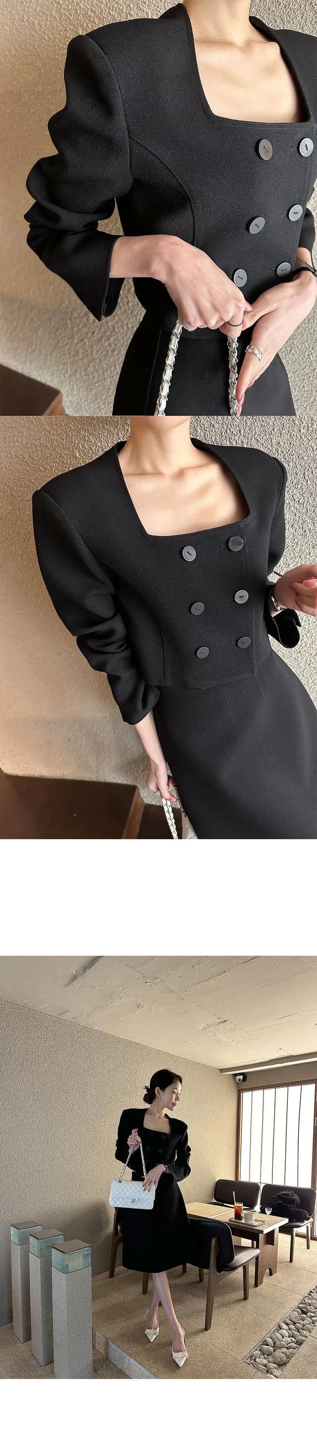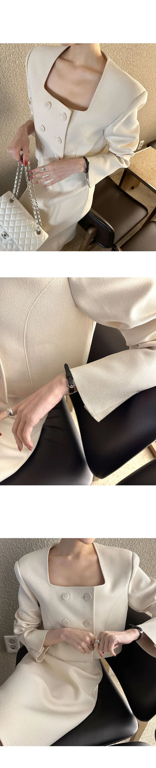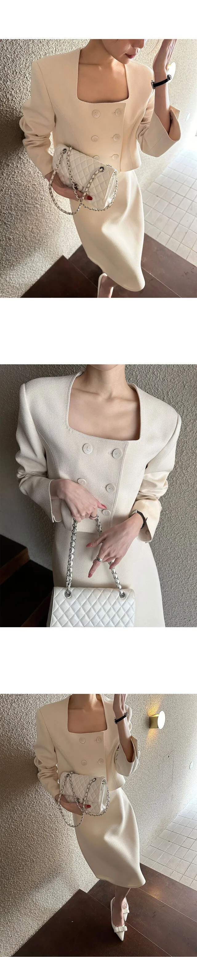 高端設計師品牌 白月光氣質方領雙排扣挺版修身短款長袖西裝外套+顯瘦A字半裙套裝 set