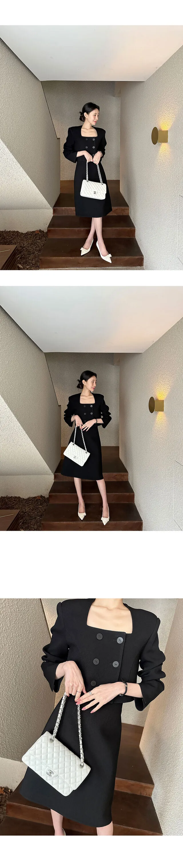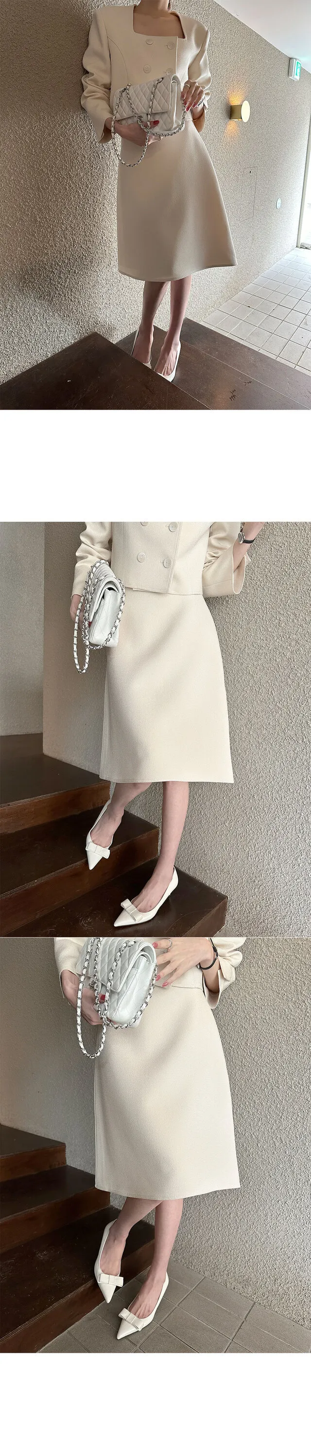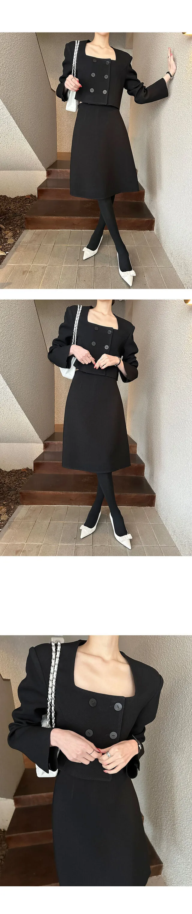 高端設計師品牌 白月光氣質方領雙排扣挺版修身短款長袖西裝外套+顯瘦A字半裙套裝 set