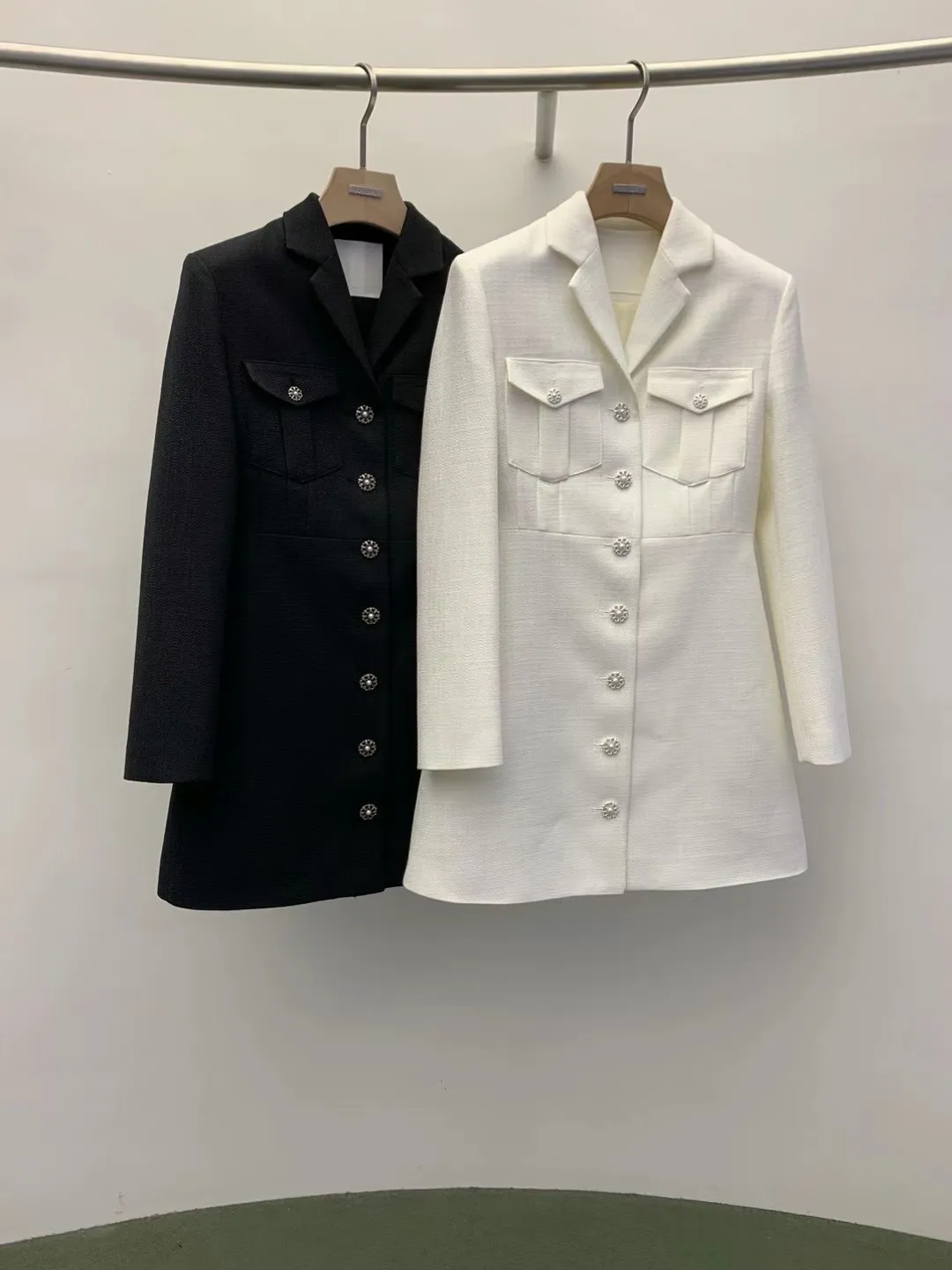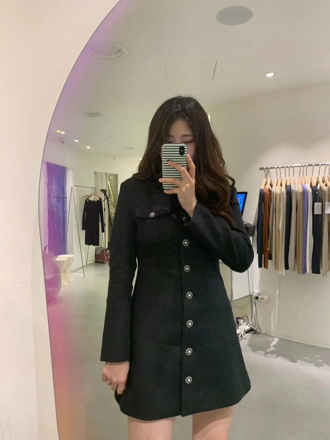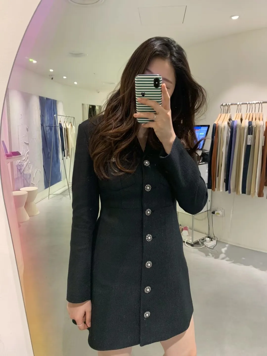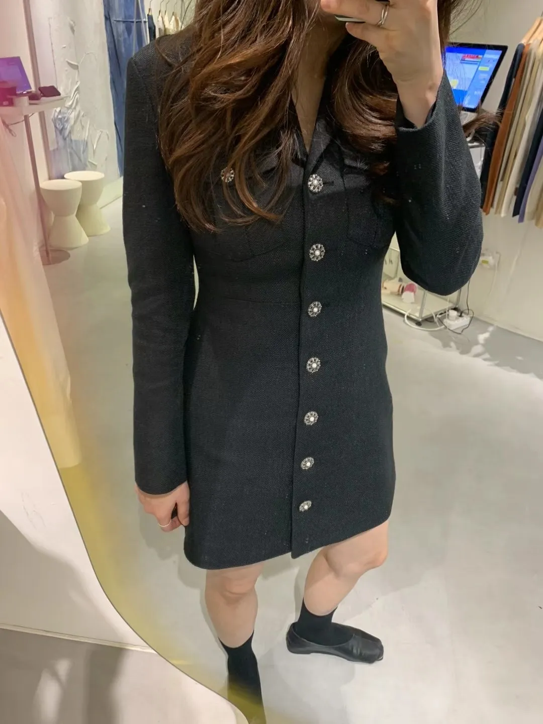高端設計師品牌 法式小香風氣質優雅減齡翻領排釦長袖連衣裙